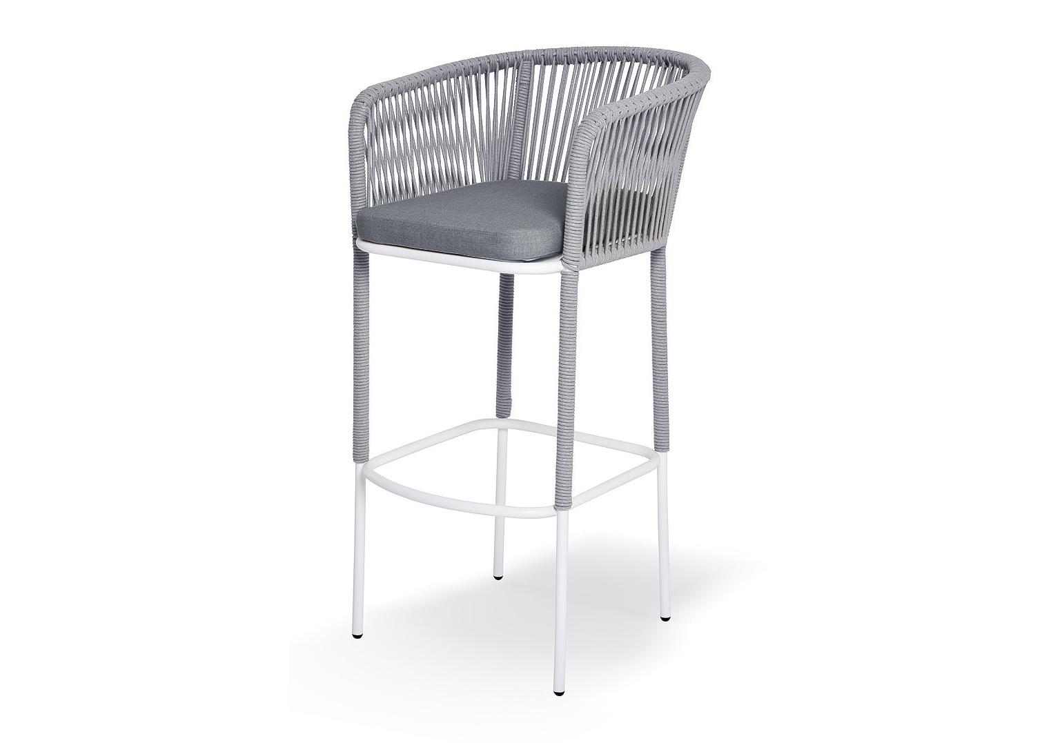 "Марсель" стул барный плетеный из роупа, каркас из стали светло-серый (RAL7035) муар, роуп светло-серый круглый, ткань светло-серая