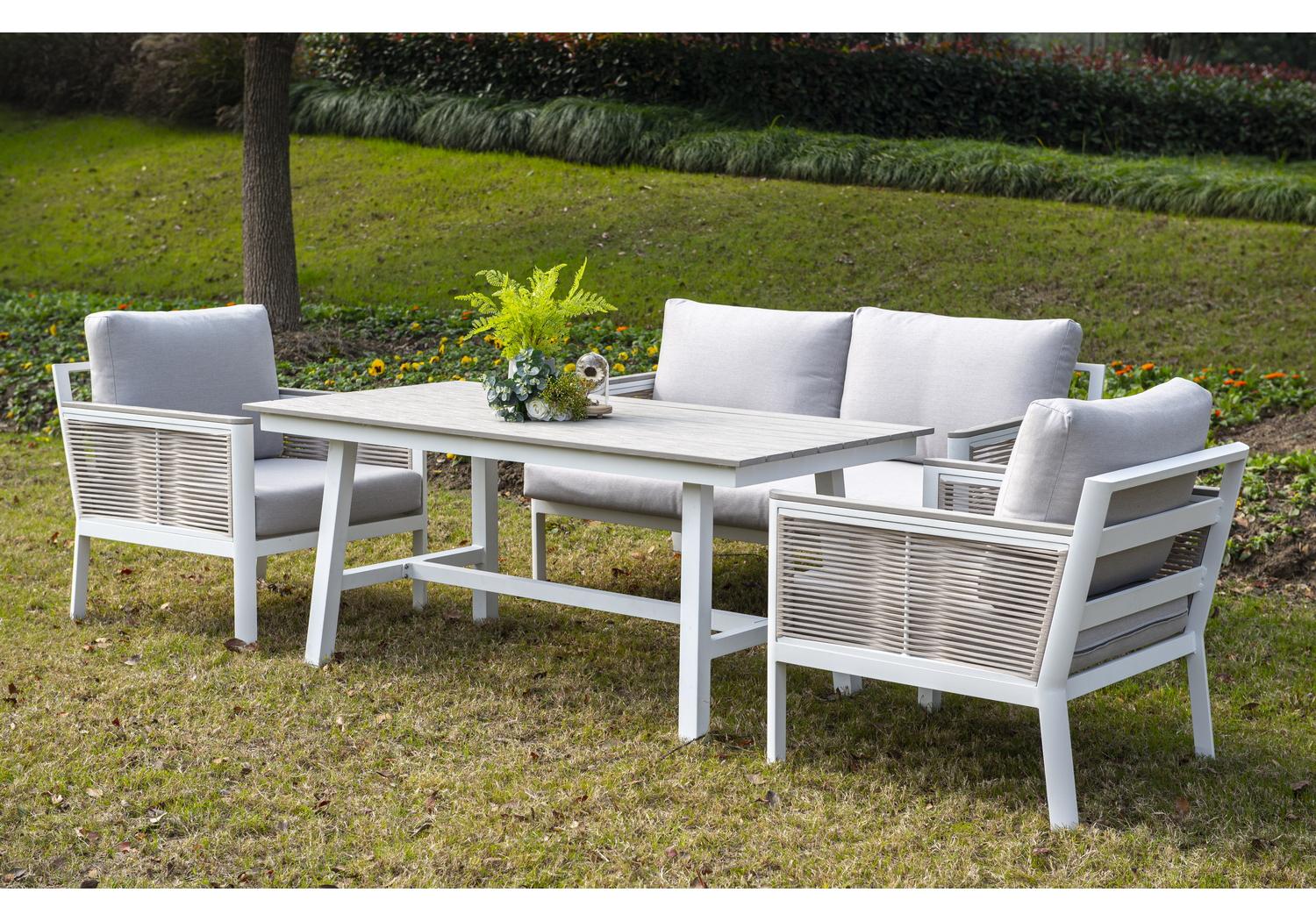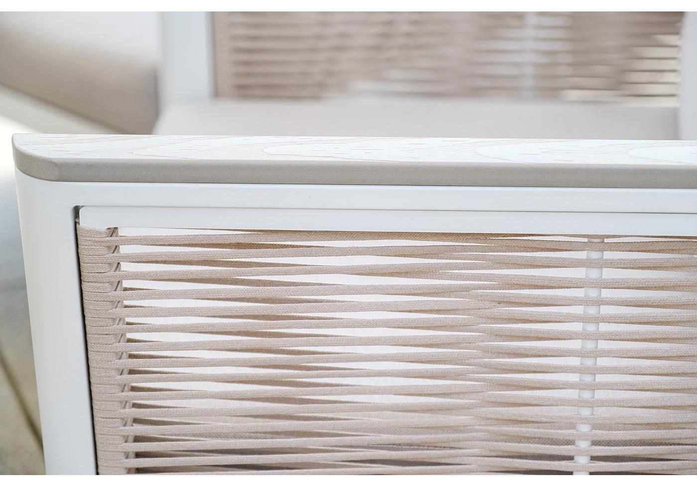 Размер модели – 680×780×700 мм. Ее каркас выполнен из высококачественного алюминия и окрашен порошковой краской в белый цвет. Боковые стороны подлокотников вручную оплетены эластичными синтетическими лентами серо-коричневого оттенка, состоящие из высокопрочных полиэфирных волокон.
