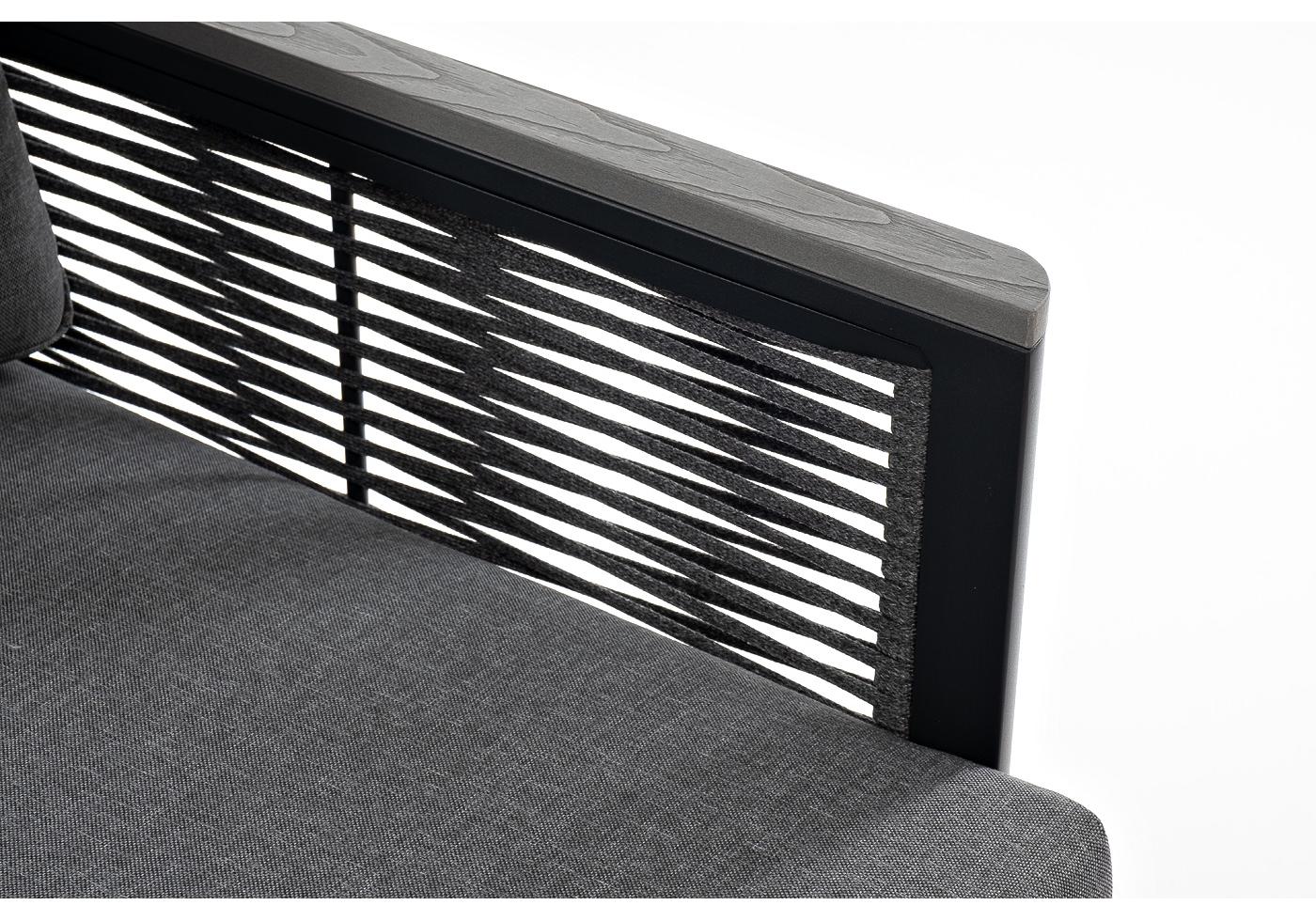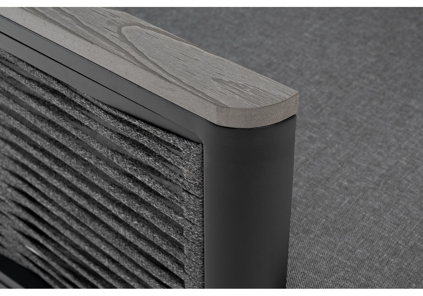 Размер модели – 680×780×700 мм. Ее каркас выполнен из высококачественного алюминия и окрашен порошковой краской в темно-серый цвет. Боковые стороны подлокотников вручную оплетены эластичными синтетическими лентами серого оттенка, состоящие из высокопрочных полиэфирных волокон.