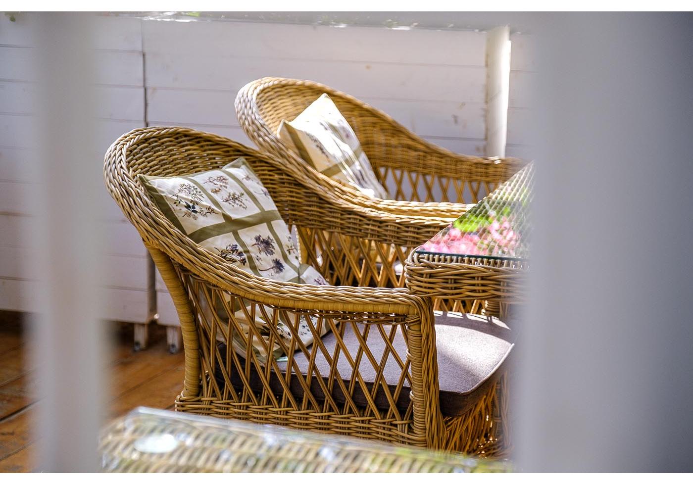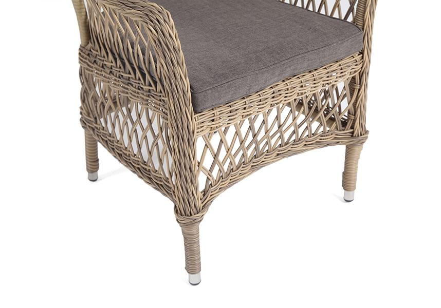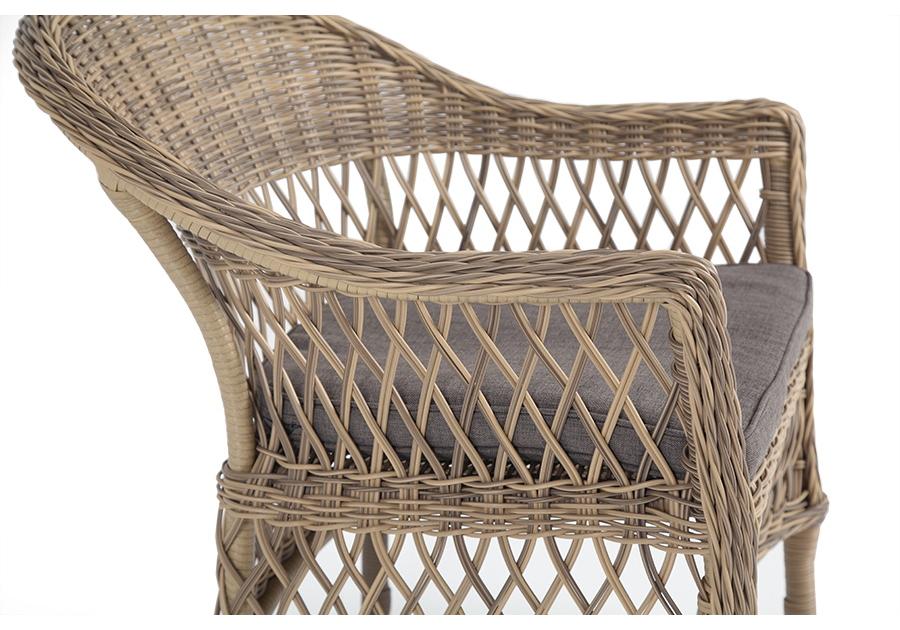 Стул оплетен вручную круглым искусственным ротангом соломенного оттенка. В комплекте представлена мягкая подушка-сиденье серого цвета. Подушка имеет съёмный чехол из полиэстера (100%), плотностью 300гр/м2, с влагоотталкивающей пропиткой.