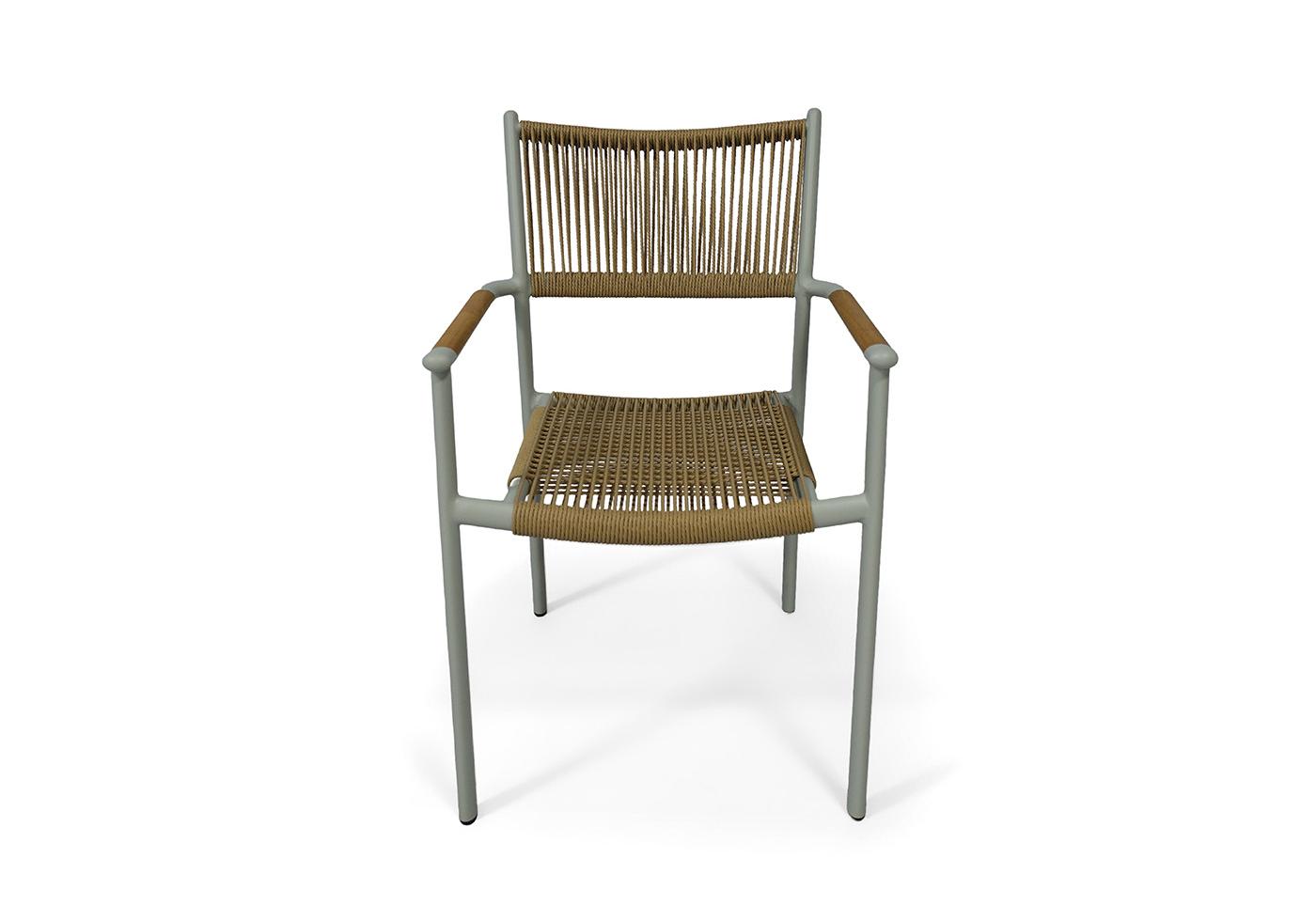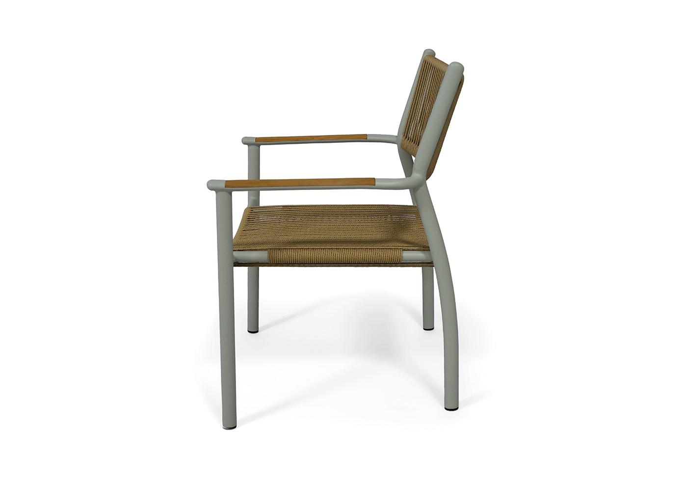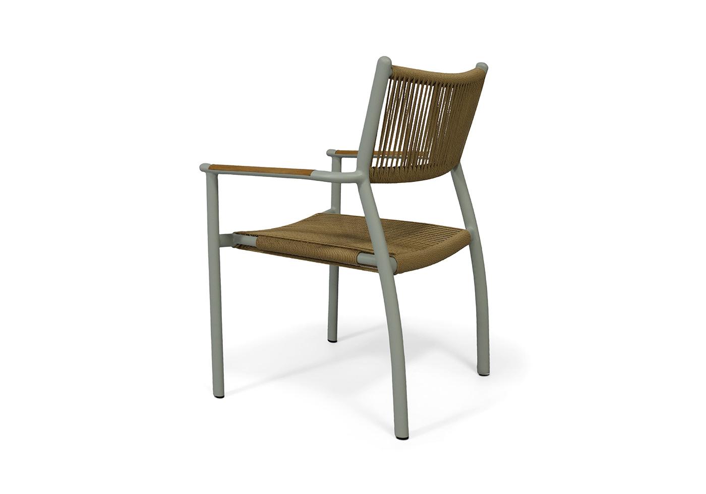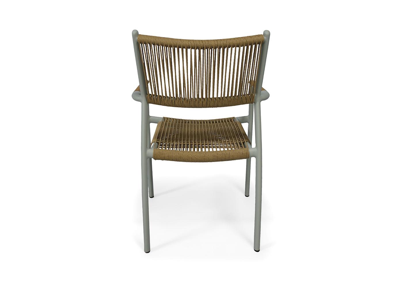 Каркас стула выполнен из легкого, но прочного алюминия, обработанного порошковым покрытием в нежном светло-сером оттенке. Это покрытие не только придает стулу элегантный вид, но и обеспечивает устойчивость к воздействию окружающей среды, делая его идеальным выбором для использования на открытом воздухе.