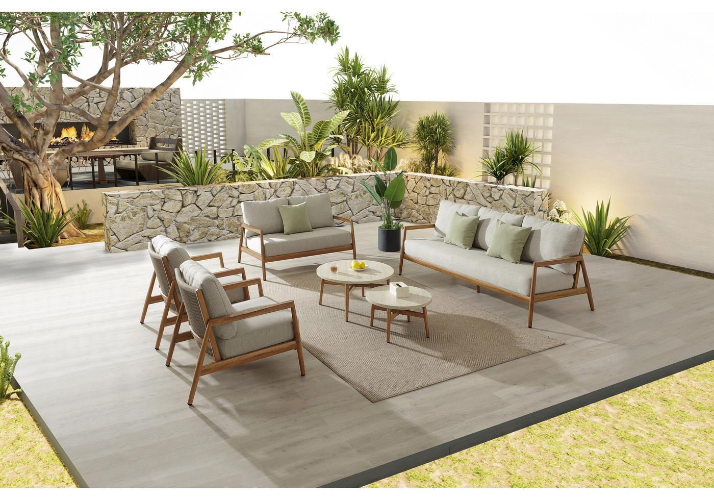 Прочный, но легкий алюминиевый каркас, стилизованный под тиковое дерево - гарантирует долгий срок службы и надежность. Тёплый древесный оттенок подчёркивает природную эстетику мебели.