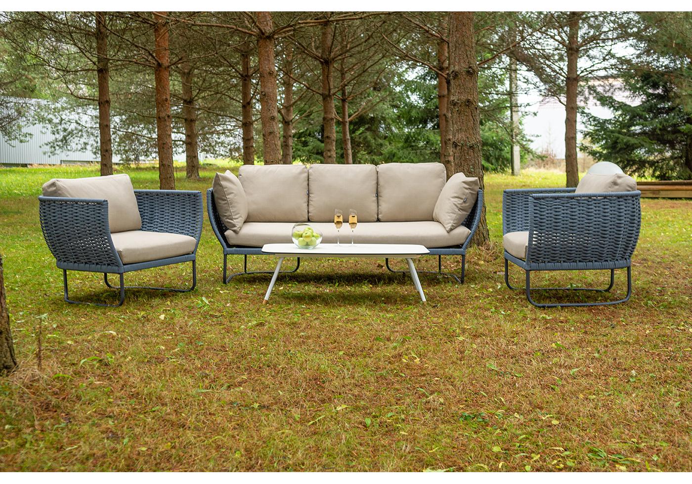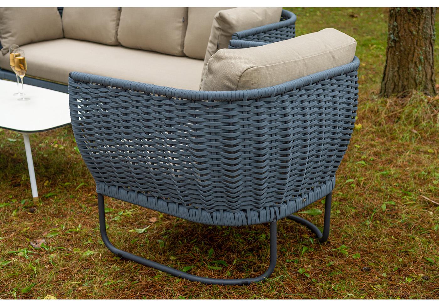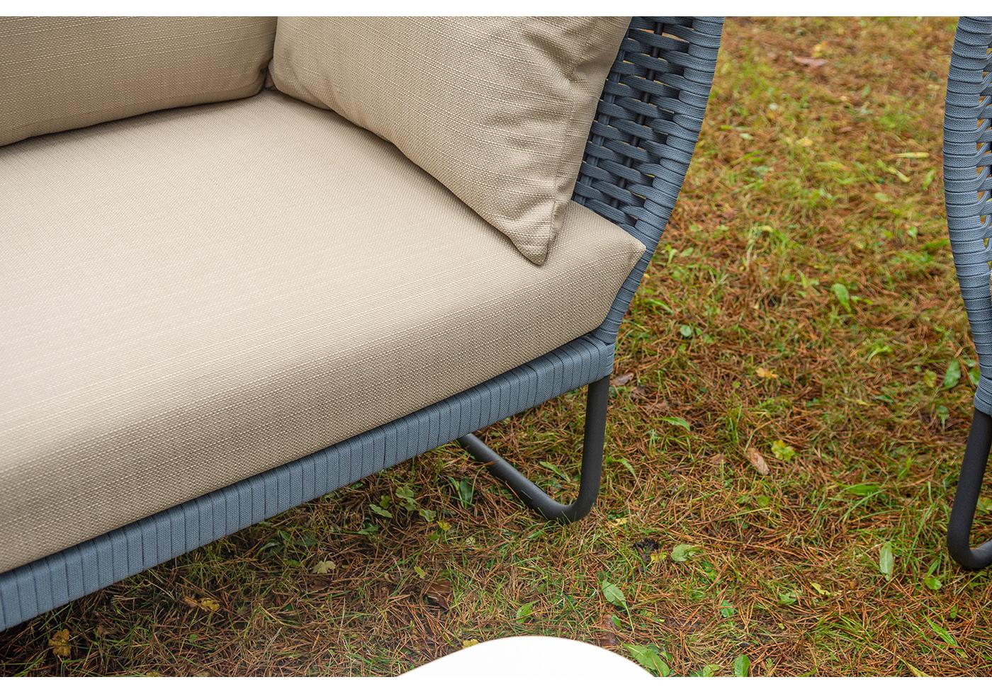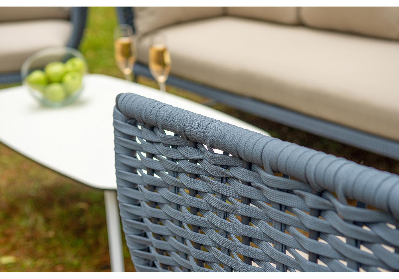 Боковины дивана и кресел вручную оплетены синими синте "Фиджи" диван 3-местный плетеный из роупа, каркас алюминий темно-серый (RAL7024) муар, роуп синий (KT18-0014) 15 мм tex, ткань Mossle бежевая 11шт. 2 140Х900Х790, "Фиджи" кресло плетеное из роупа, каркас алюминий темно-серый (RAL7024) муар, роуп синий (KT18-0014) 15 мм tex, ткань Mossle бежевая 2шт. 1 070Х920Х610, "Диего" журнальный стол из HPL 120х60 H40, каркас белый муар, цвет "молочный" 1шт. 1 200Х600Х400,