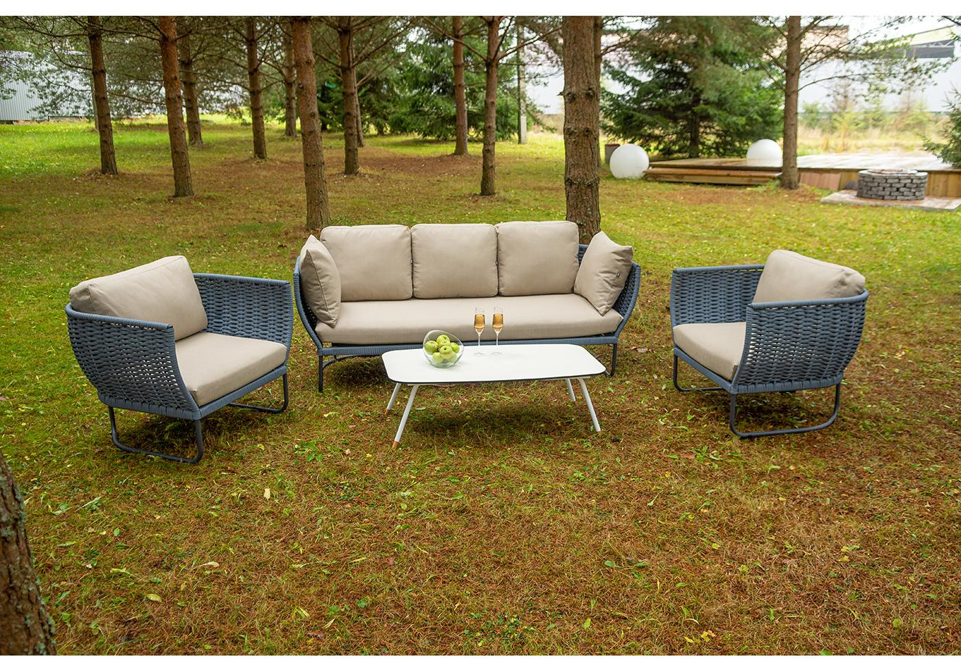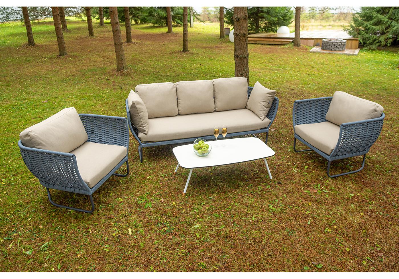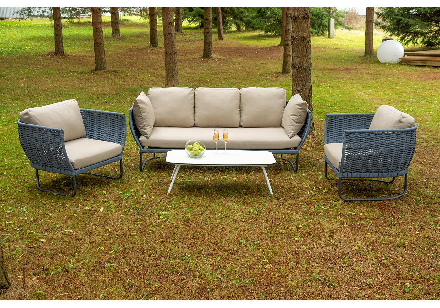 Боковины дивана и кресел вручную оплетены синими синте "Фиджи" диван 3-местный плетеный из роупа, каркас алюминий темно-серый (RAL7024) муар, роуп синий (KT18-0014) 15 мм tex, ткань Mossle бежевая 11шт. 2 140Х900Х790, "Фиджи" кресло плетеное из роупа, каркас алюминий темно-серый (RAL7024) муар, роуп синий (KT18-0014) 15 мм tex, ткань Mossle бежевая 2шт. 1 070Х920Х610, "Диего" журнальный стол из HPL 120х60 H40, каркас белый муар, цвет "молочный" 1шт. 1 200Х600Х400,