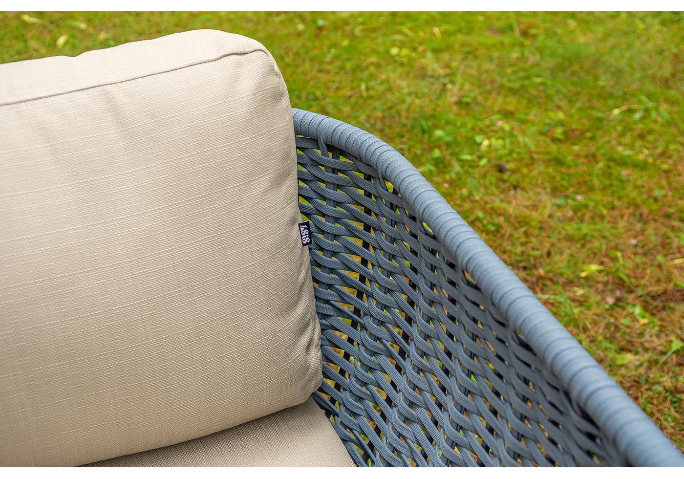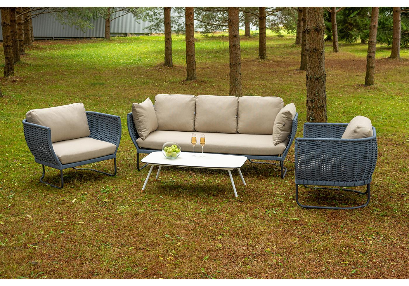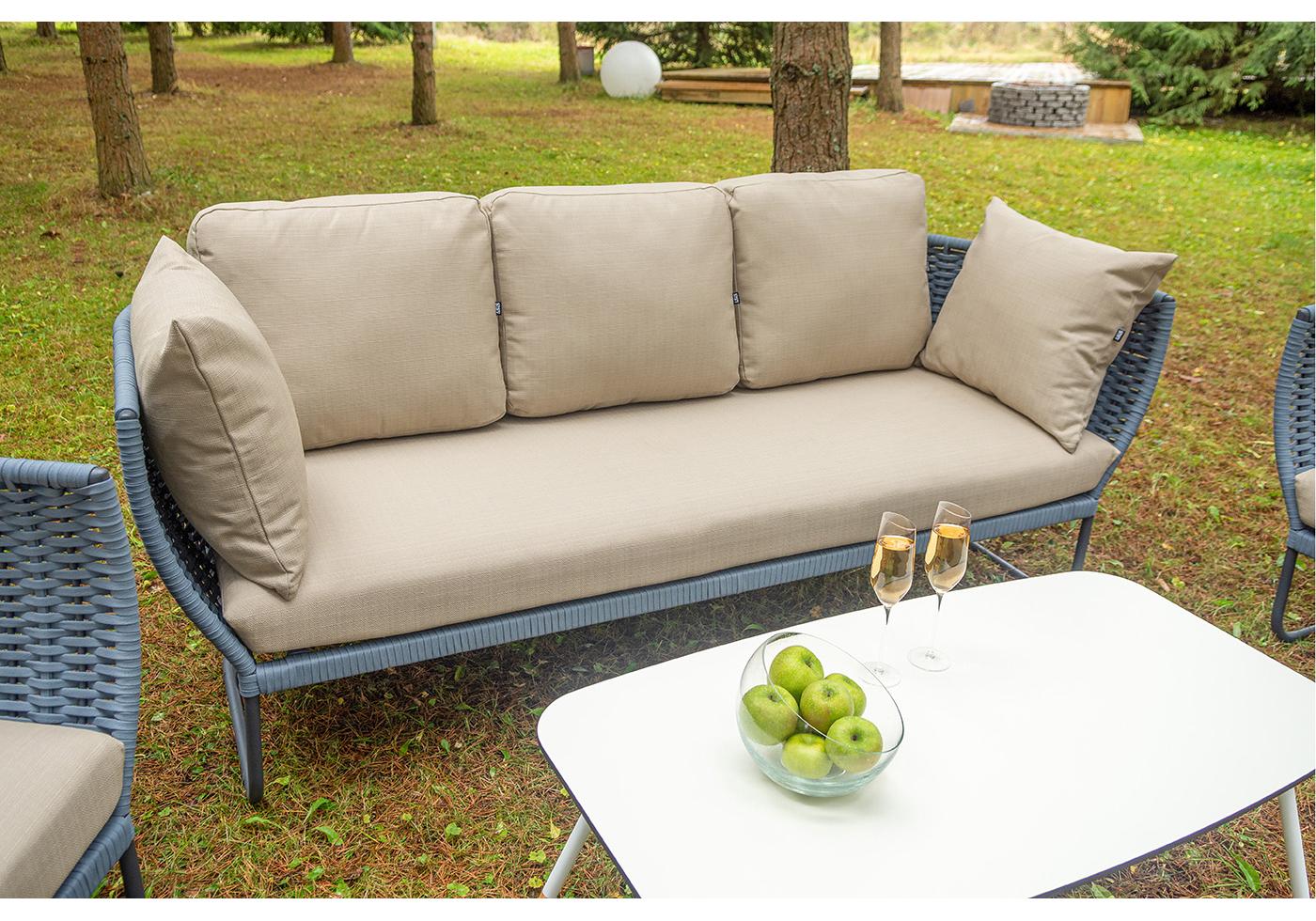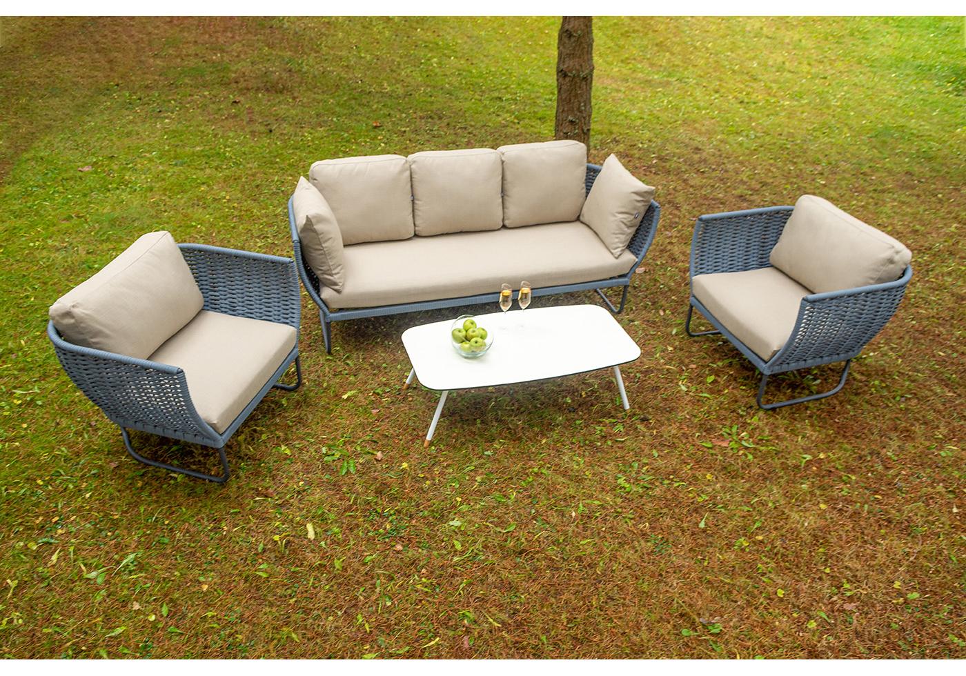 Боковины дивана и кресел вручную оплетены синими синте "Фиджи" диван 3-местный плетеный из роупа, каркас алюминий темно-серый (RAL7024) муар, роуп синий (KT18-0014) 15 мм tex, ткань Mossle бежевая 11шт. 2 140Х900Х790, "Фиджи" кресло плетеное из роупа, каркас алюминий темно-серый (RAL7024) муар, роуп синий (KT18-0014) 15 мм tex, ткань Mossle бежевая 2шт. 1 070Х920Х610, "Диего" журнальный стол из HPL 120х60 H40, каркас белый муар, цвет "молочный" 1шт. 1 200Х600Х400,