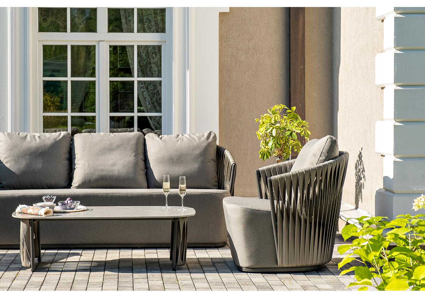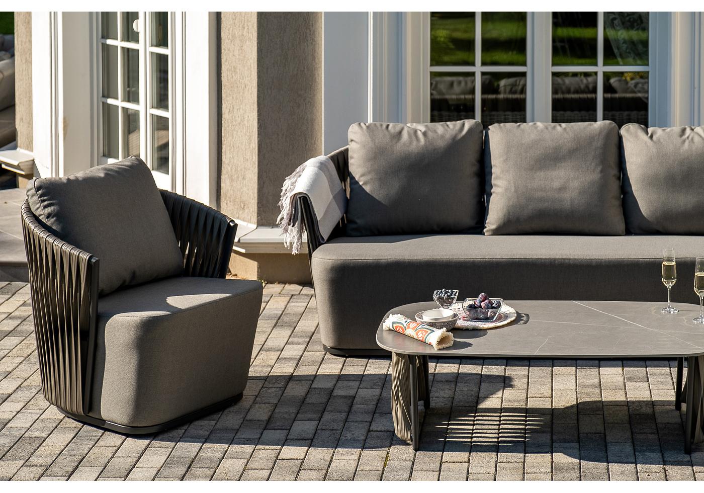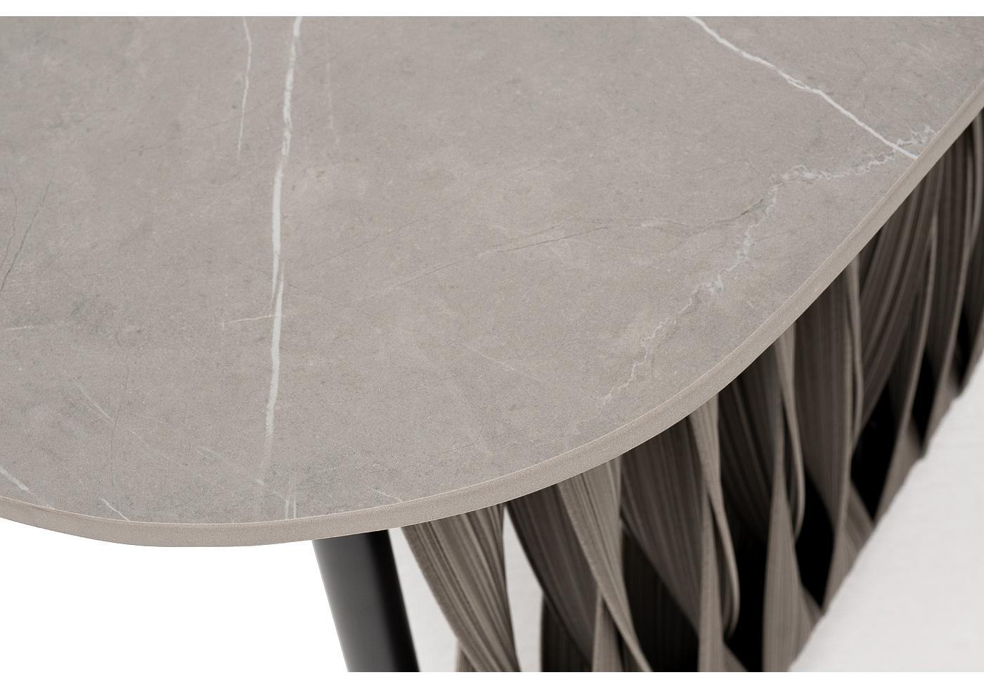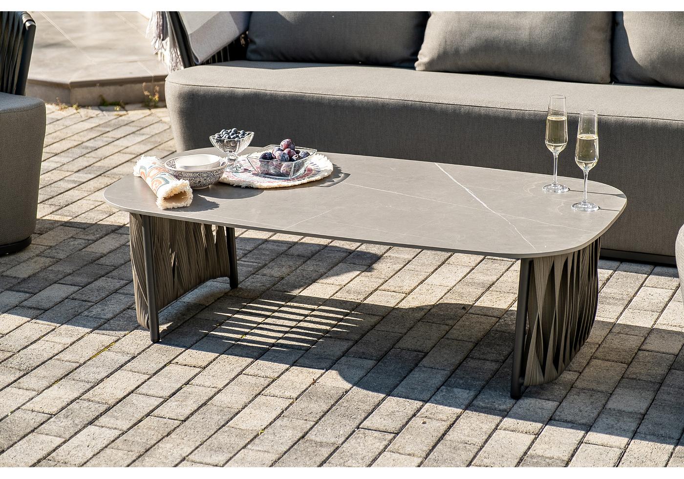 Журнальный столик выполнен из алюминия, окрашенного износостойкой краской графитового цвета. Столешница - овальная, выполнена из искусственного камня графитового цвета.
