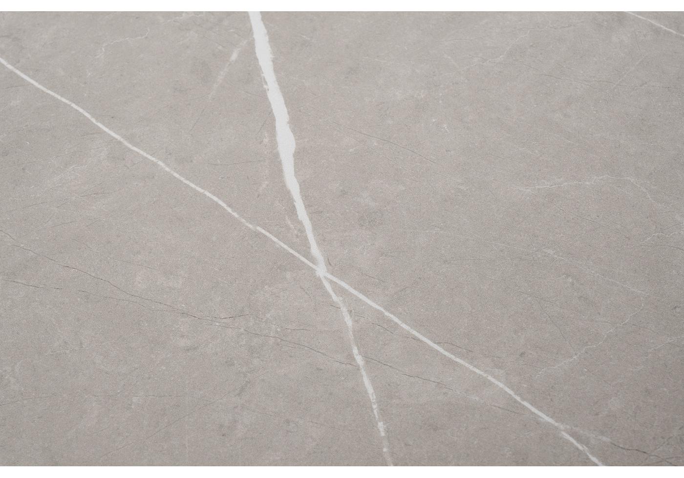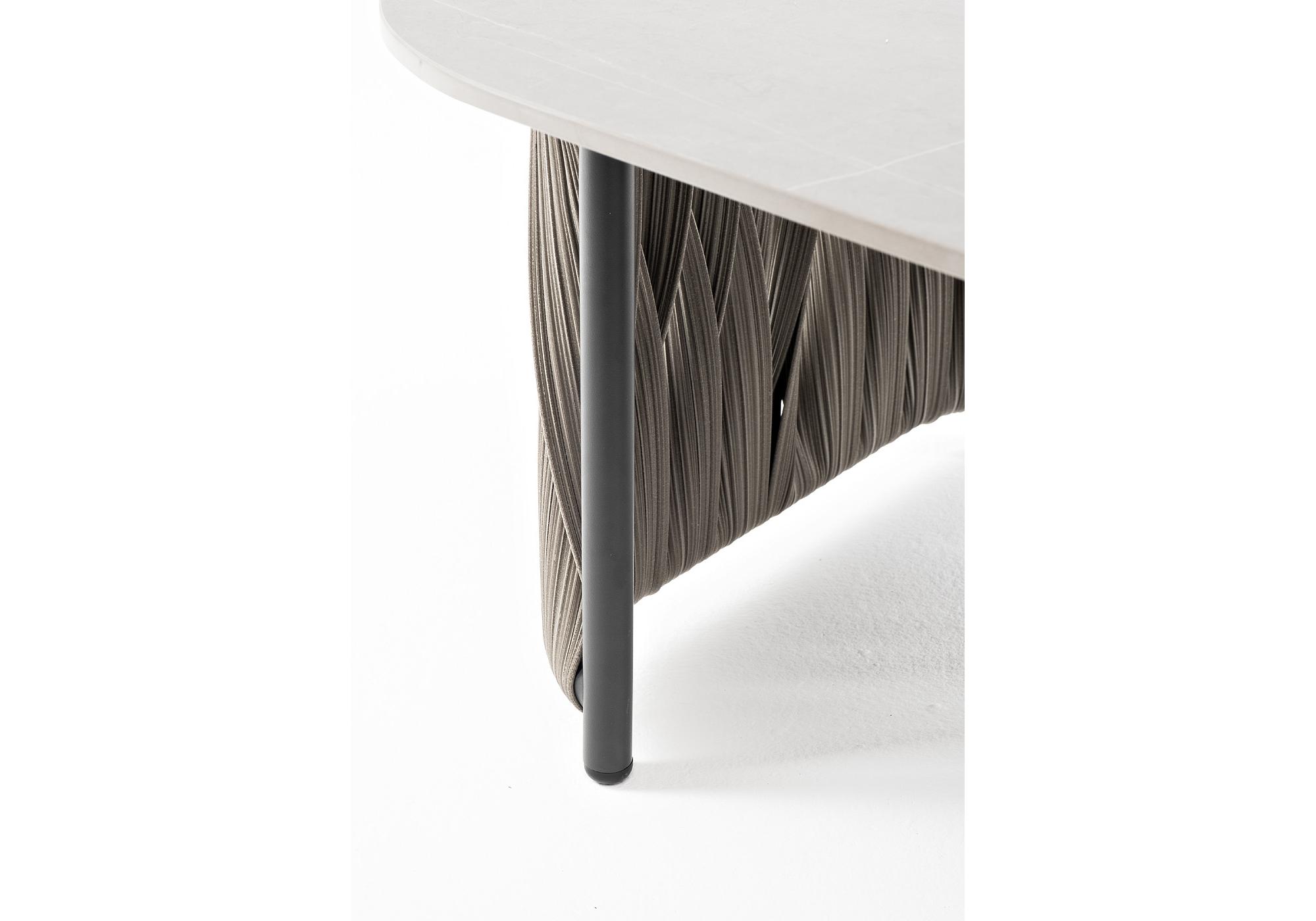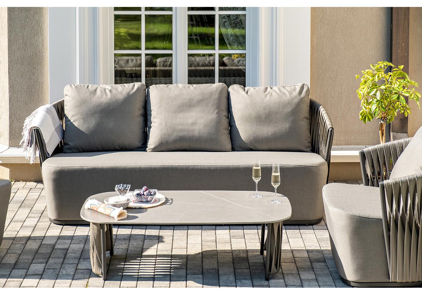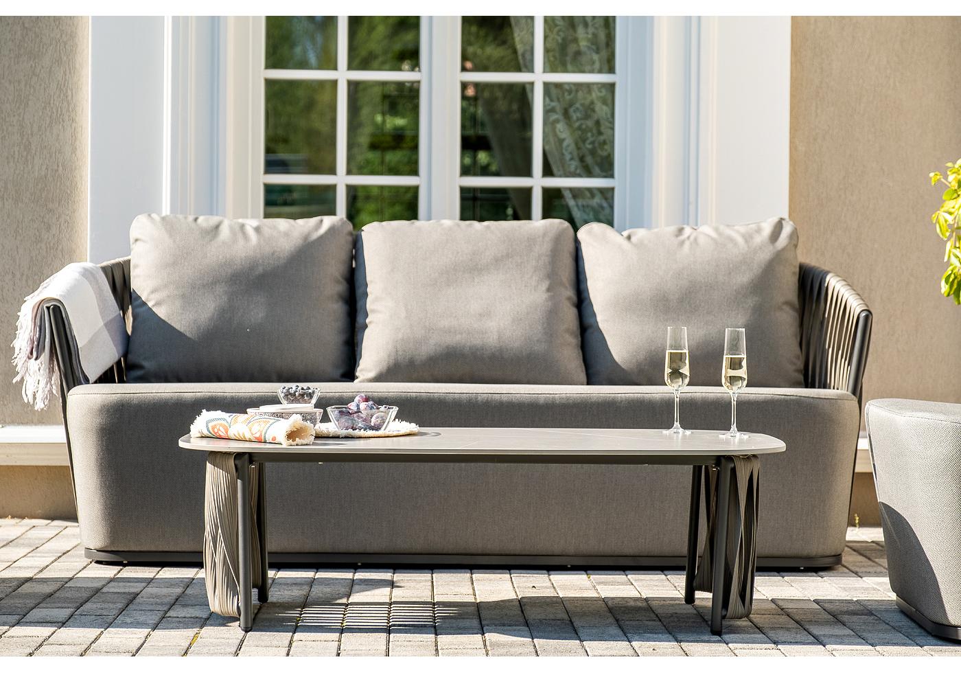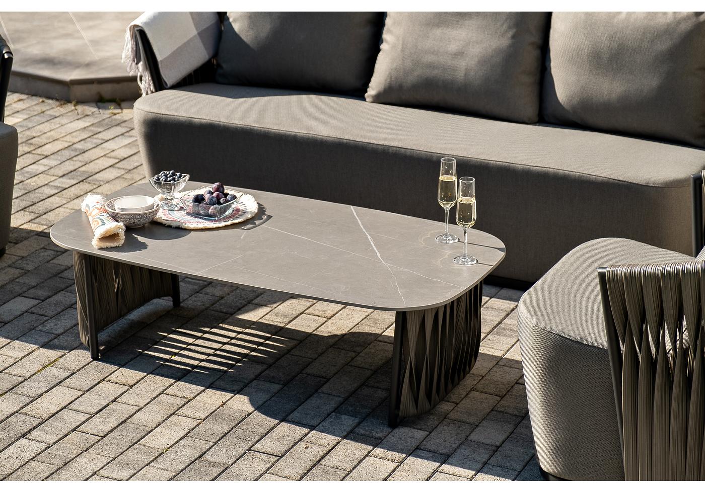 Журнальный столик выполнен из алюминия, окрашенного износостойкой краской графитового цвета. Столешница - овальная, выполнена из искусственного камня графитового цвета.