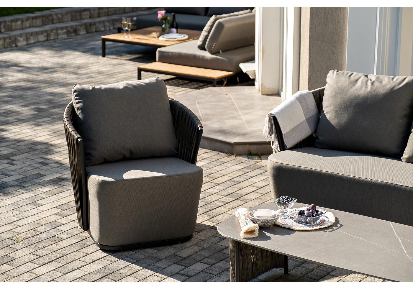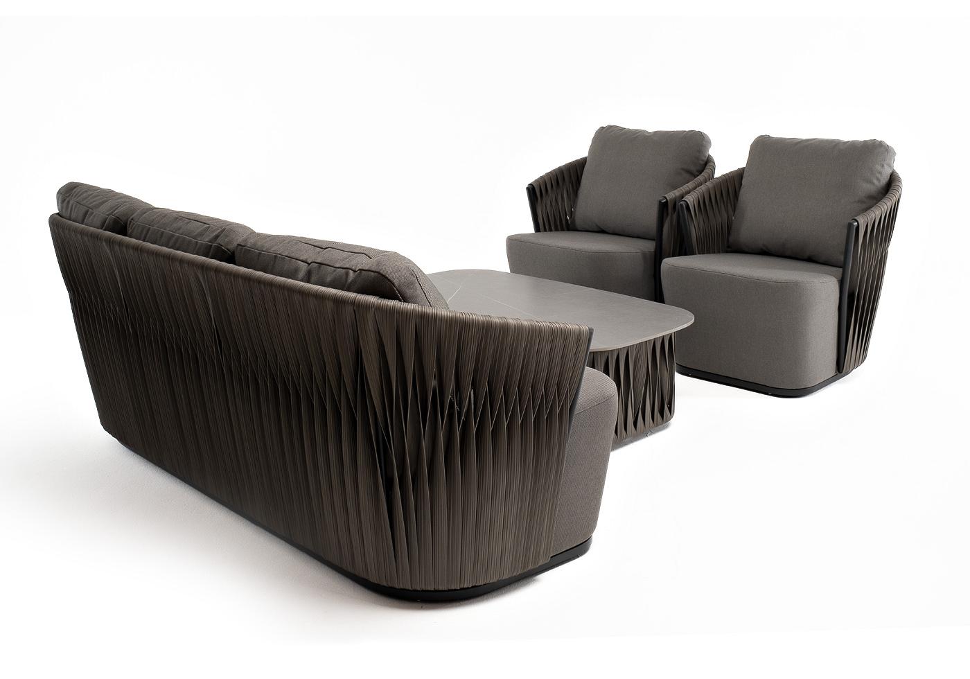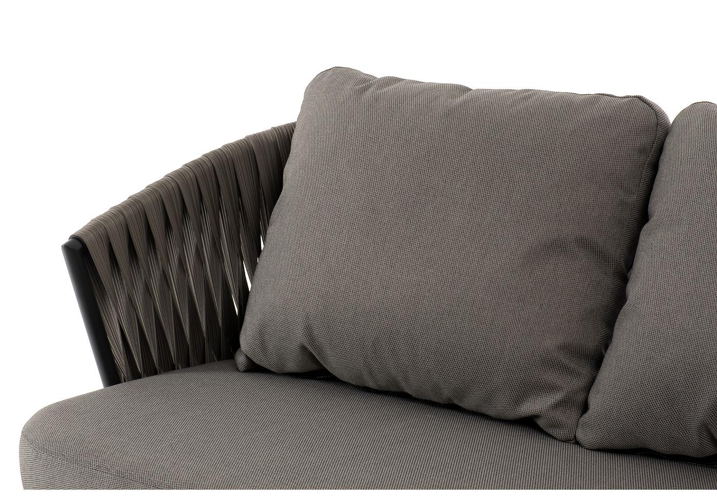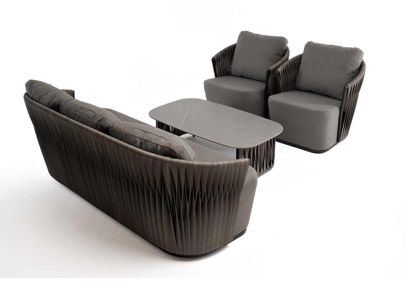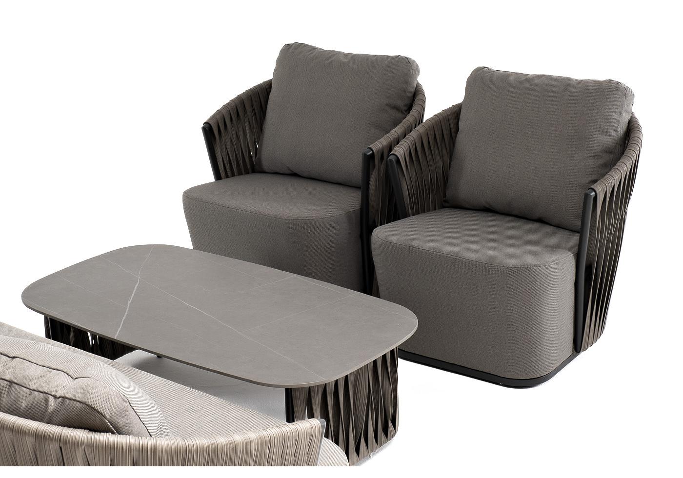 Из алюминия сделан устойчивый каркас мебели. Ее поверхность дополнена искусственным ротангом, из которого сделано ручное плетение - 50×3 мм, цвет графит.
