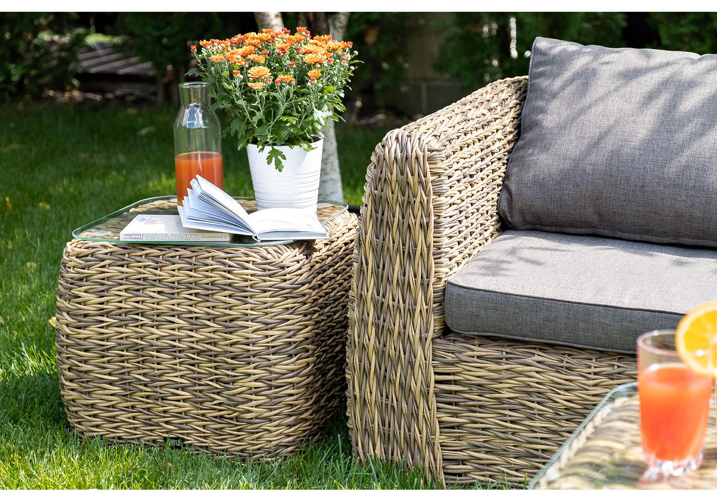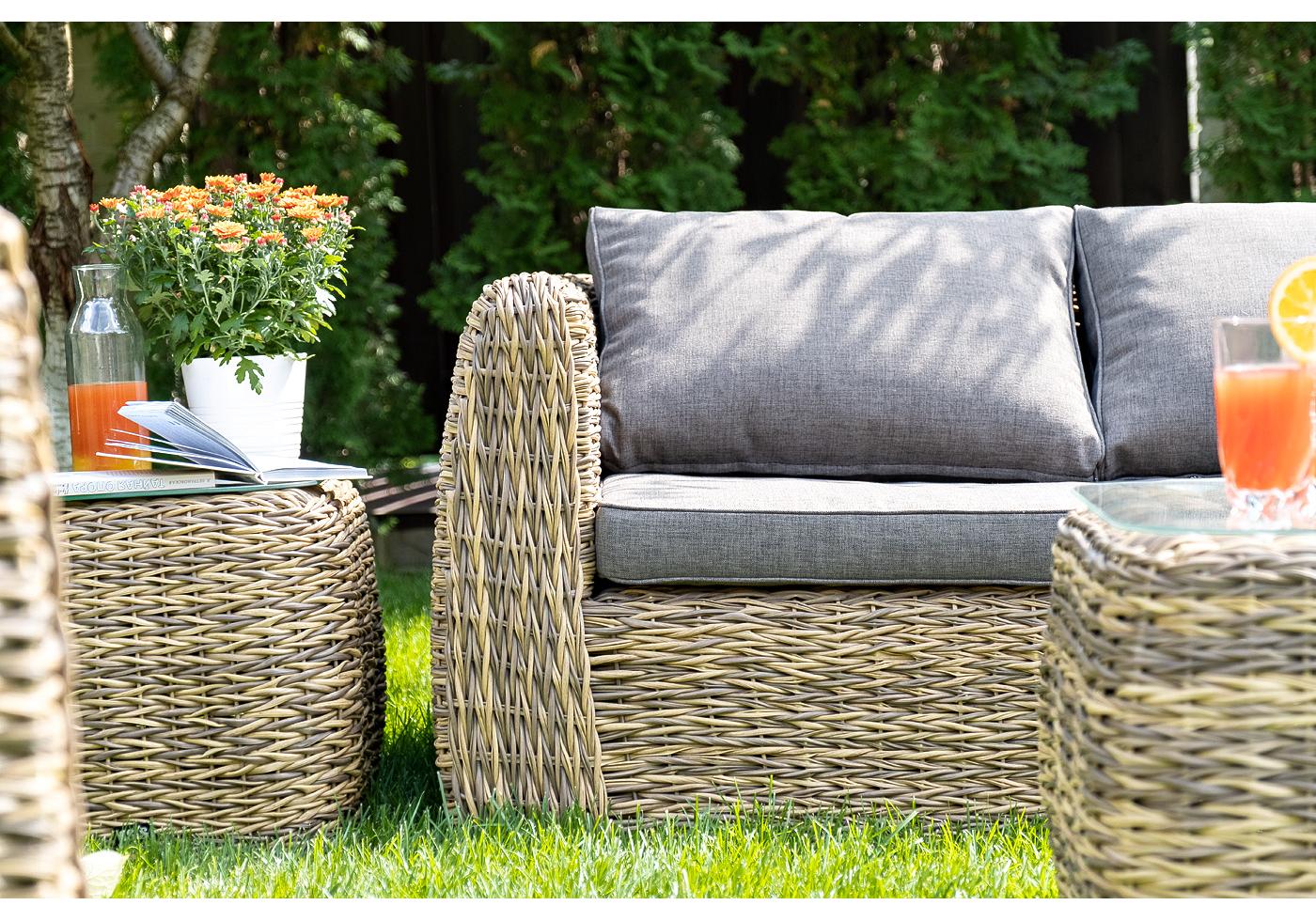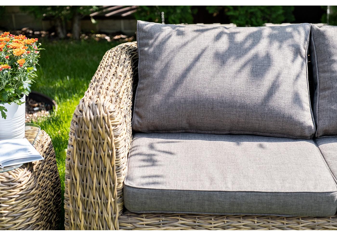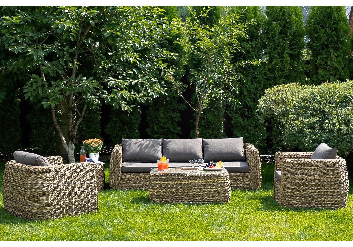 Комплект мебели представлен в соломенном цвете с плетением вида "гиацинт".