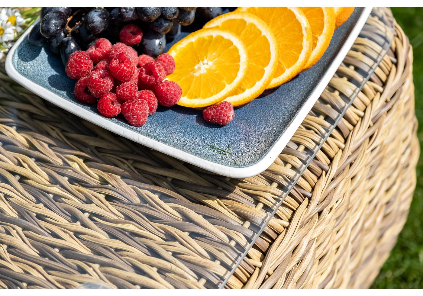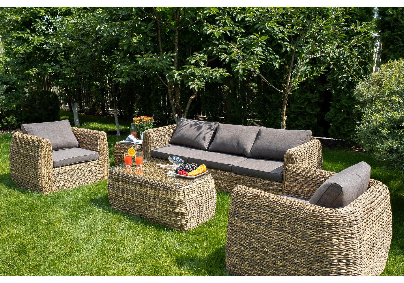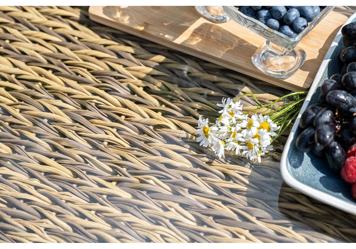 Комплект мебели представлен в соломенном цвете с плетением вида "гиацинт".
