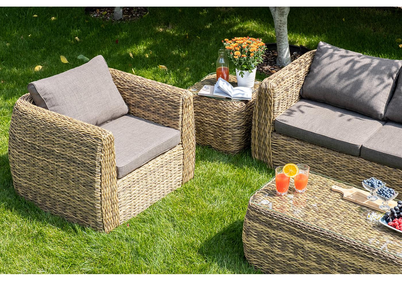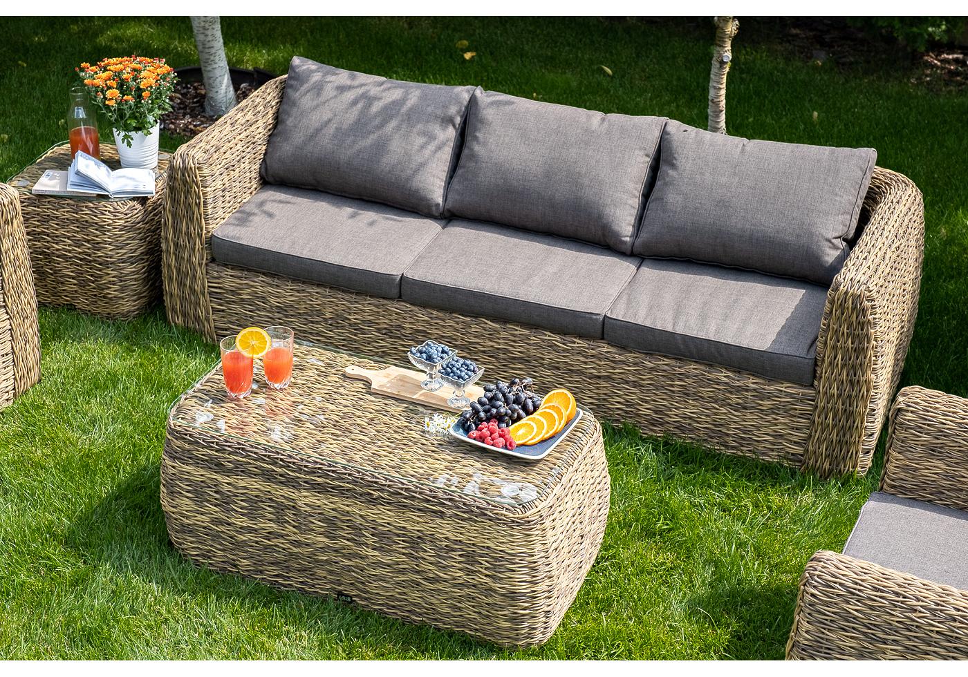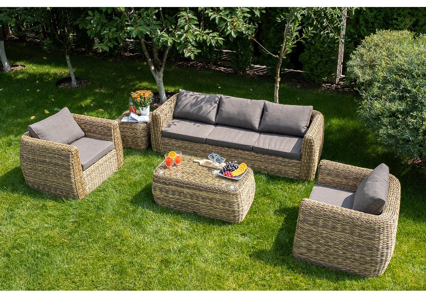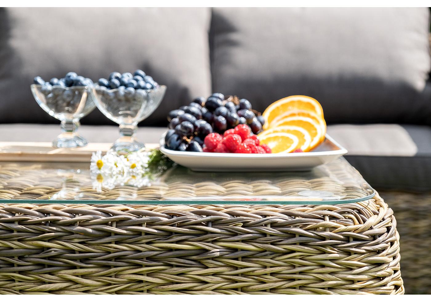 Комплект мебели представлен в соломенном цвете с плетением вида "гиацинт".