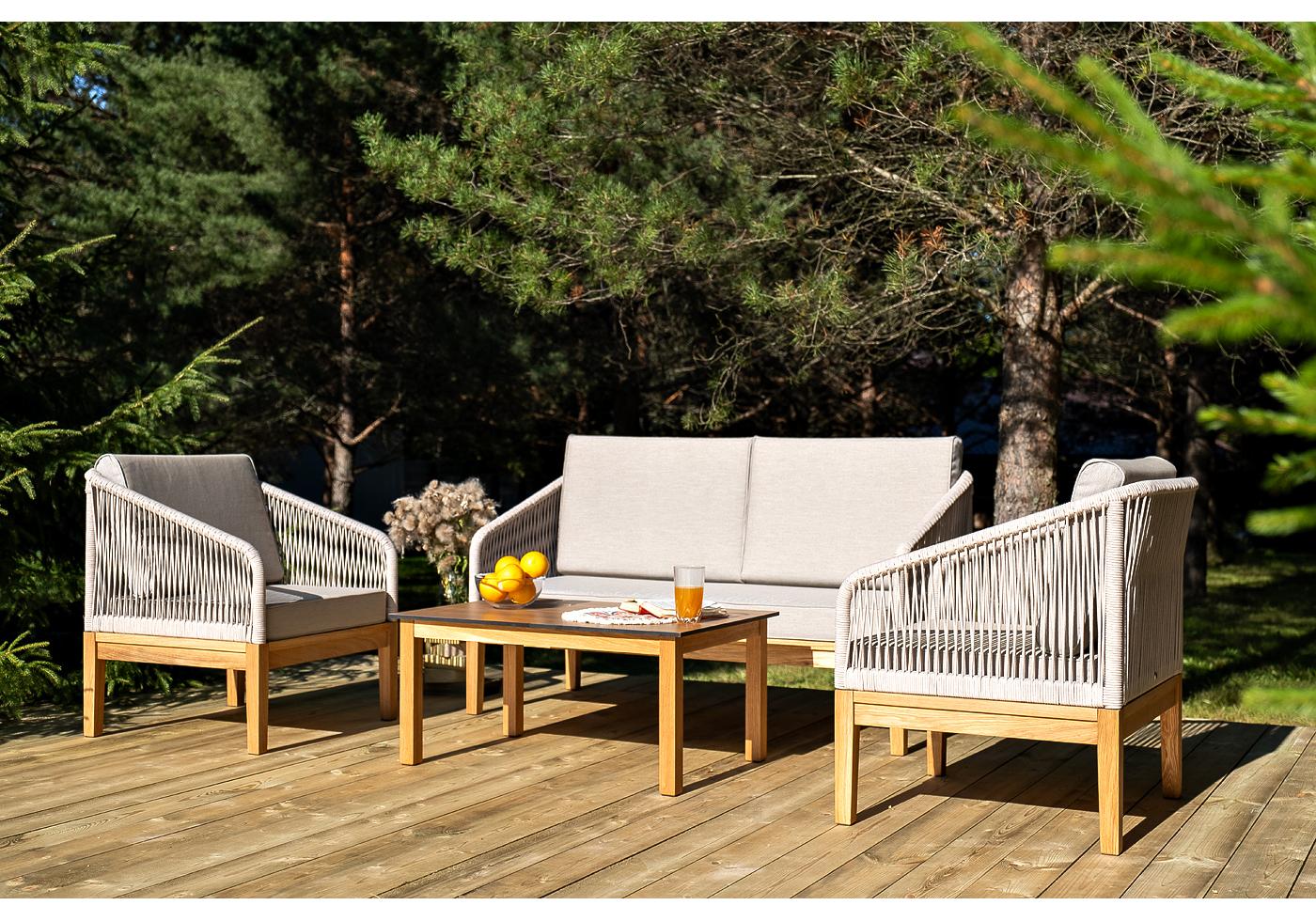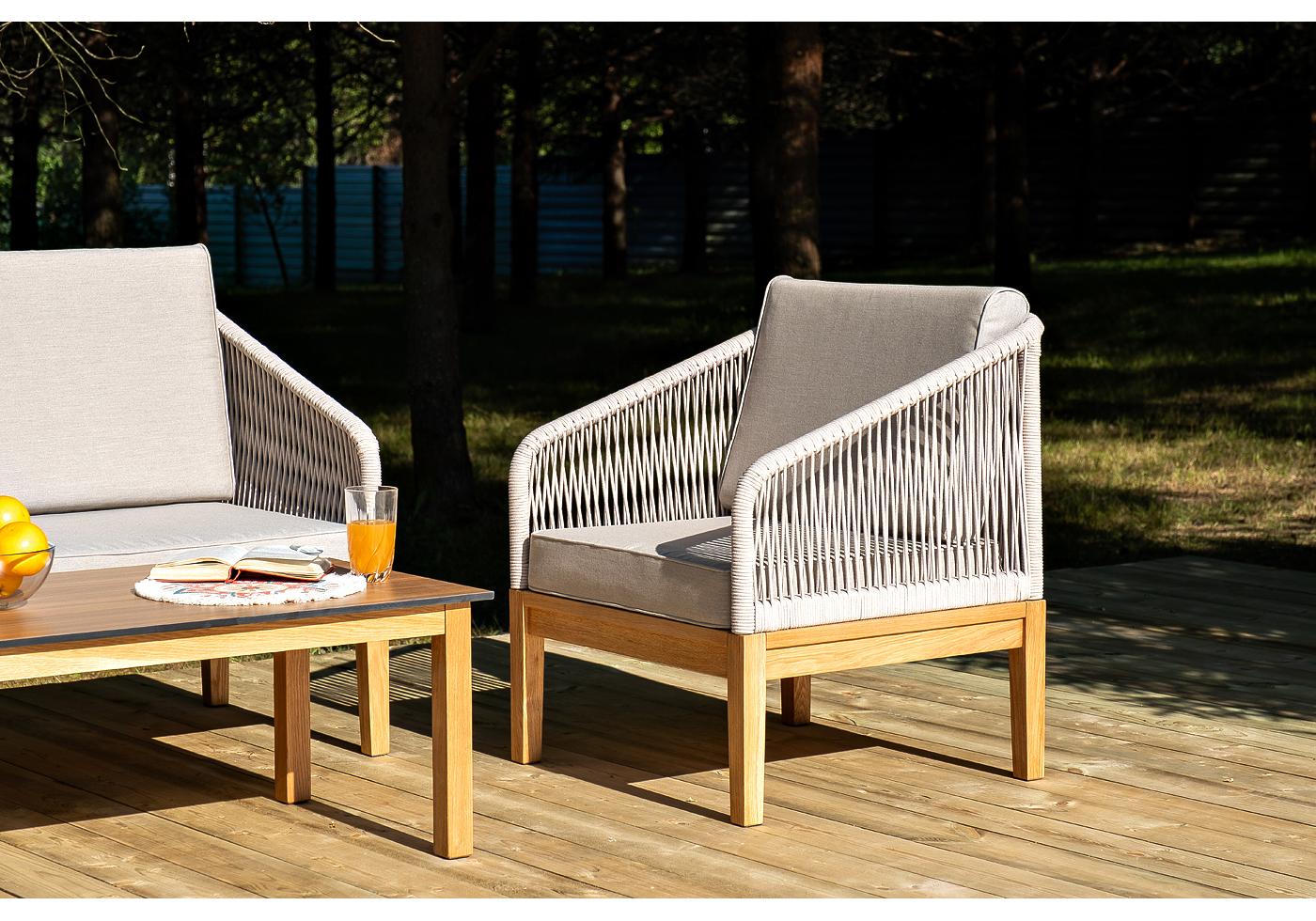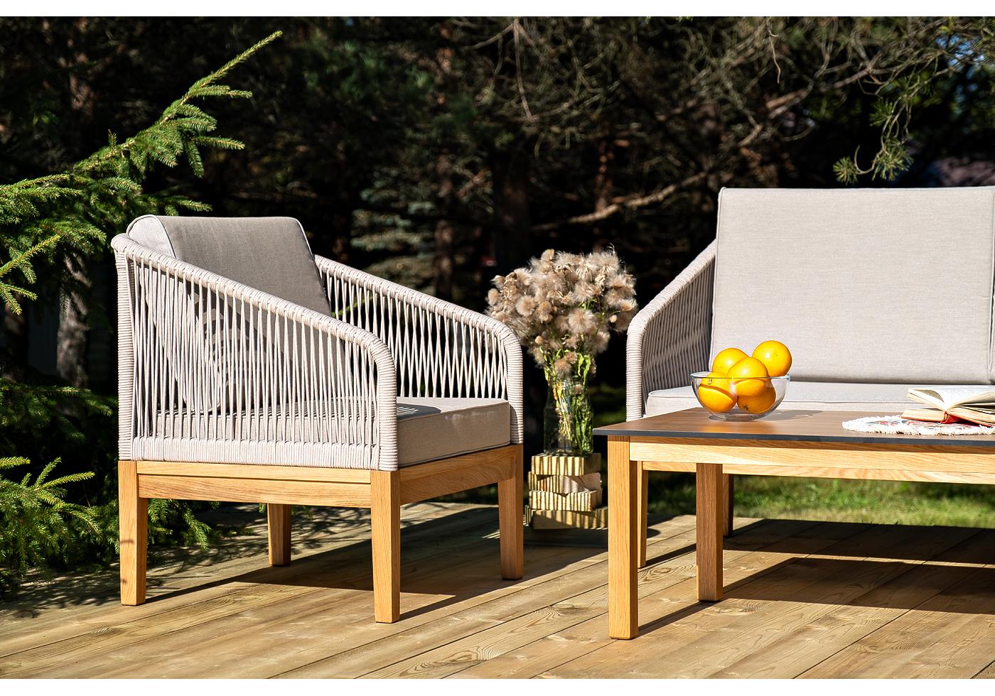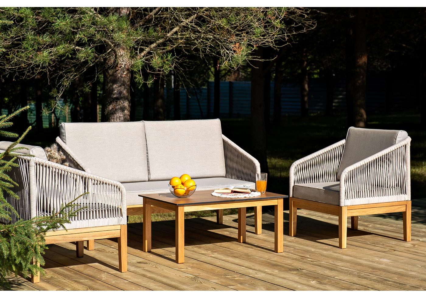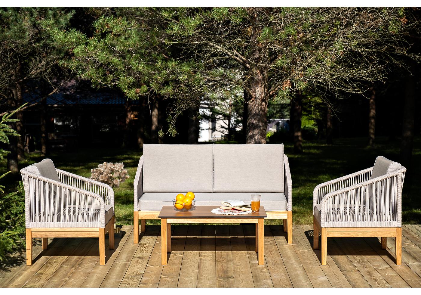 Каркас уличной мебели выполнен из дуба. Его дополняет бежевая оплетка, изготовленная на основе эластичных синтетических лент из полиэфирных волокон высокой "Канны" журнальный столик из HPL 90х60, H40, основание дуб, цвет столешницы "дуб" 1шт. 900Х600Х400, "Канны" диван 2-местный плетеный из роупа, основание дуб, роуп бежевый круглый, ткань бежевая 15052 1шт. 1 500Х700Х810, "Канны" кресло плетеное из роупа, основание дуб, роуп бежевый круглый, ткань бежевая 15052 2шт. 700Х700Х810,