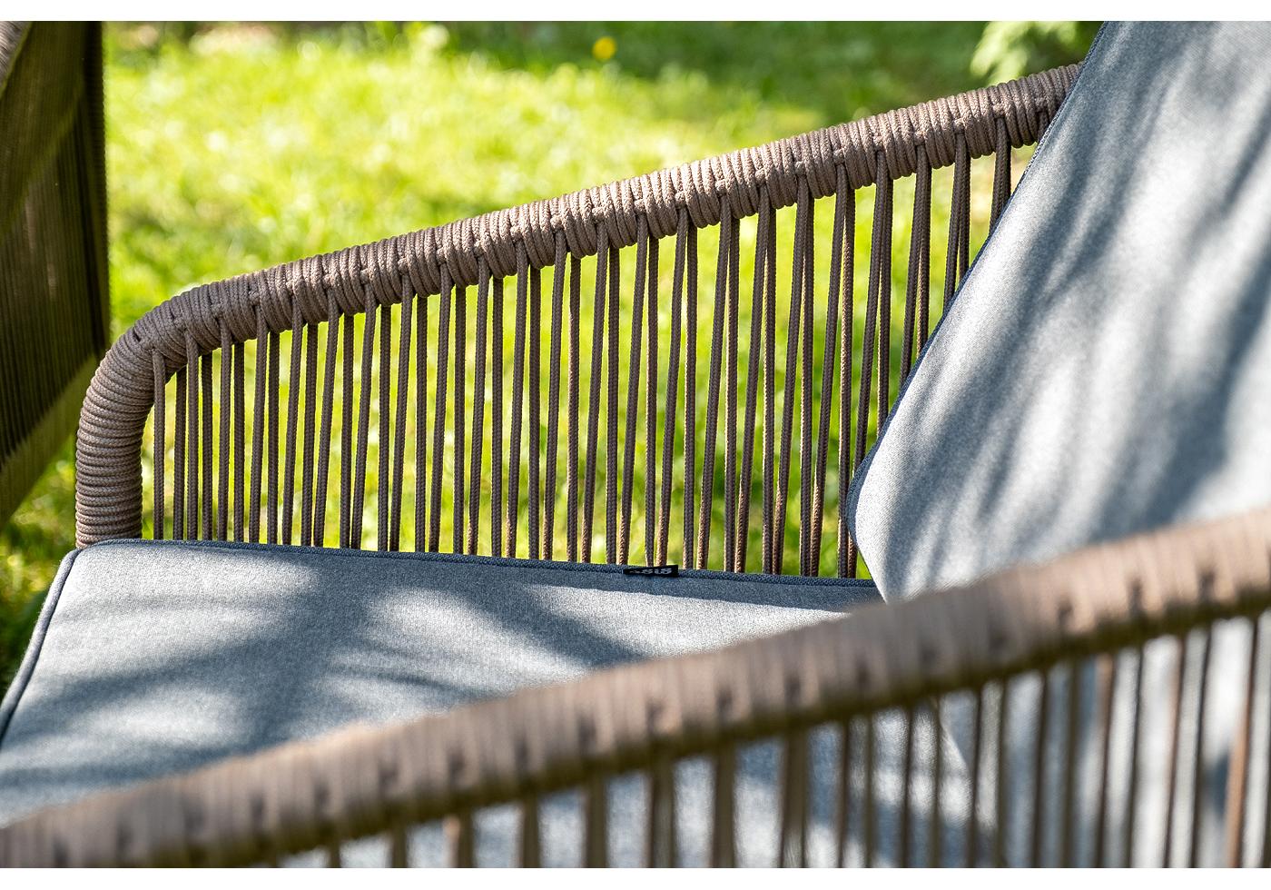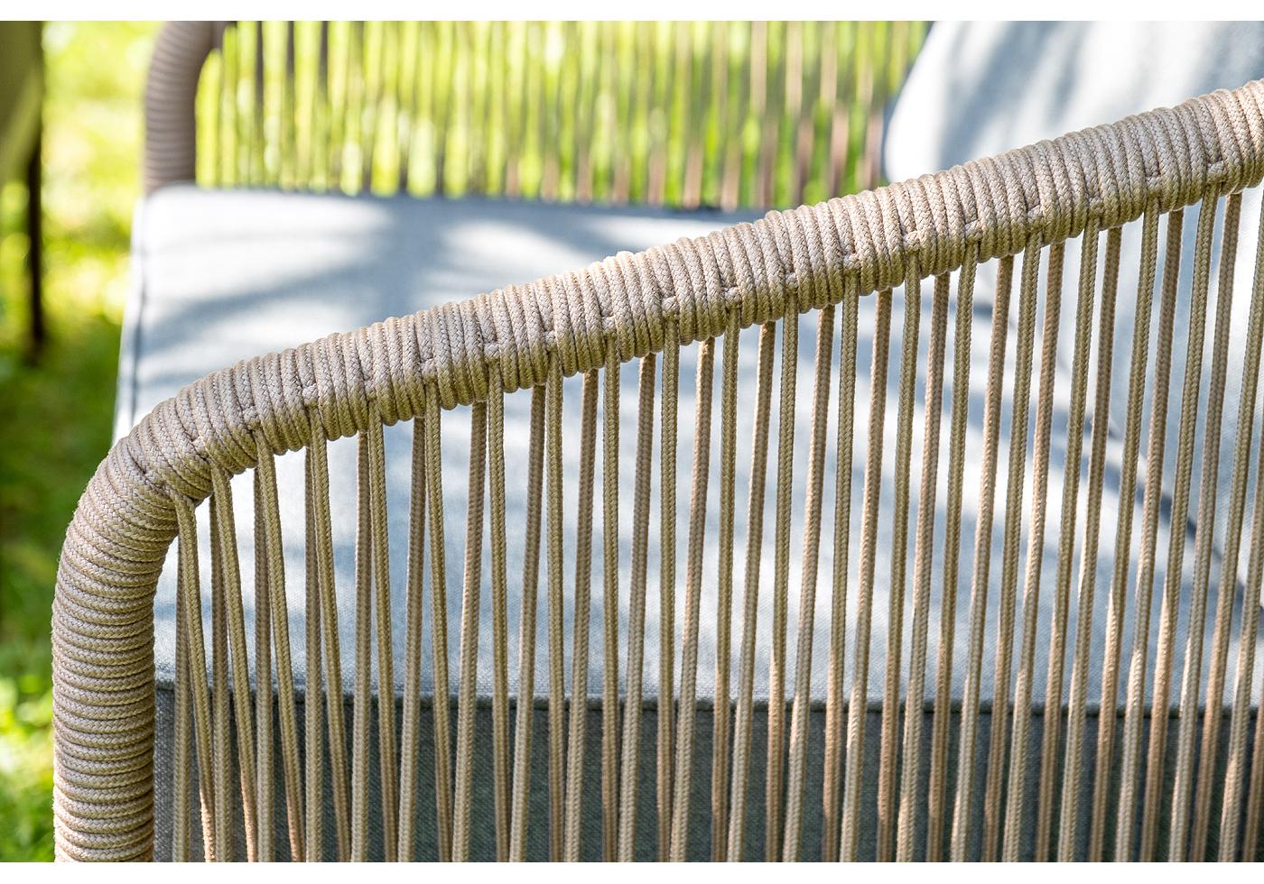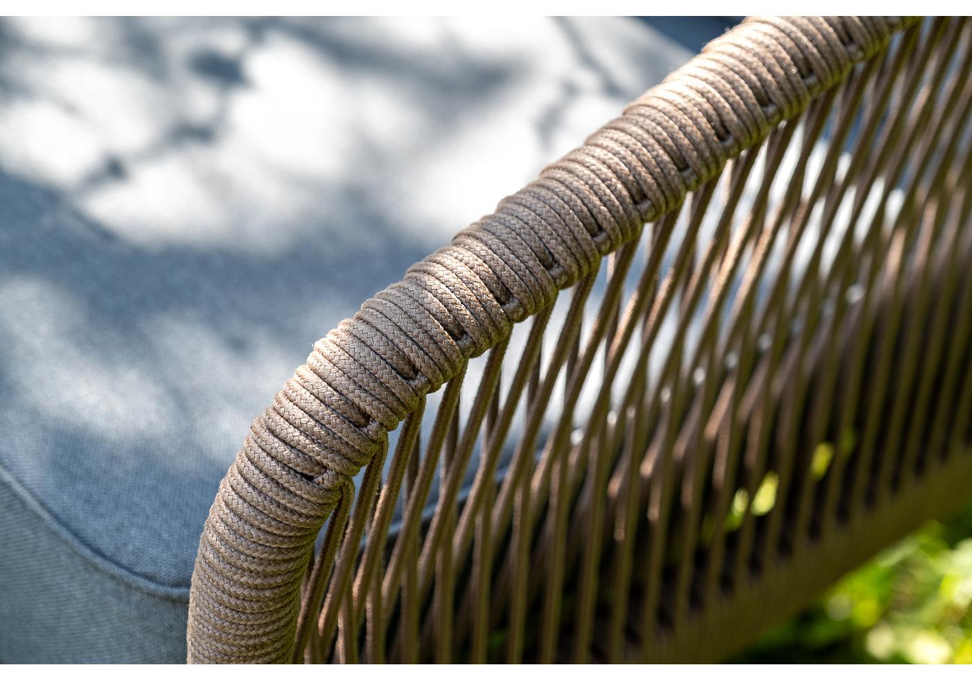 Каркас уличной мебели выполнен из прочного алюминия. Его дополняет коричневая оплетка, изготовленная на основе эластичных синтетических лент из полиэфирных волокон высокой прочности.