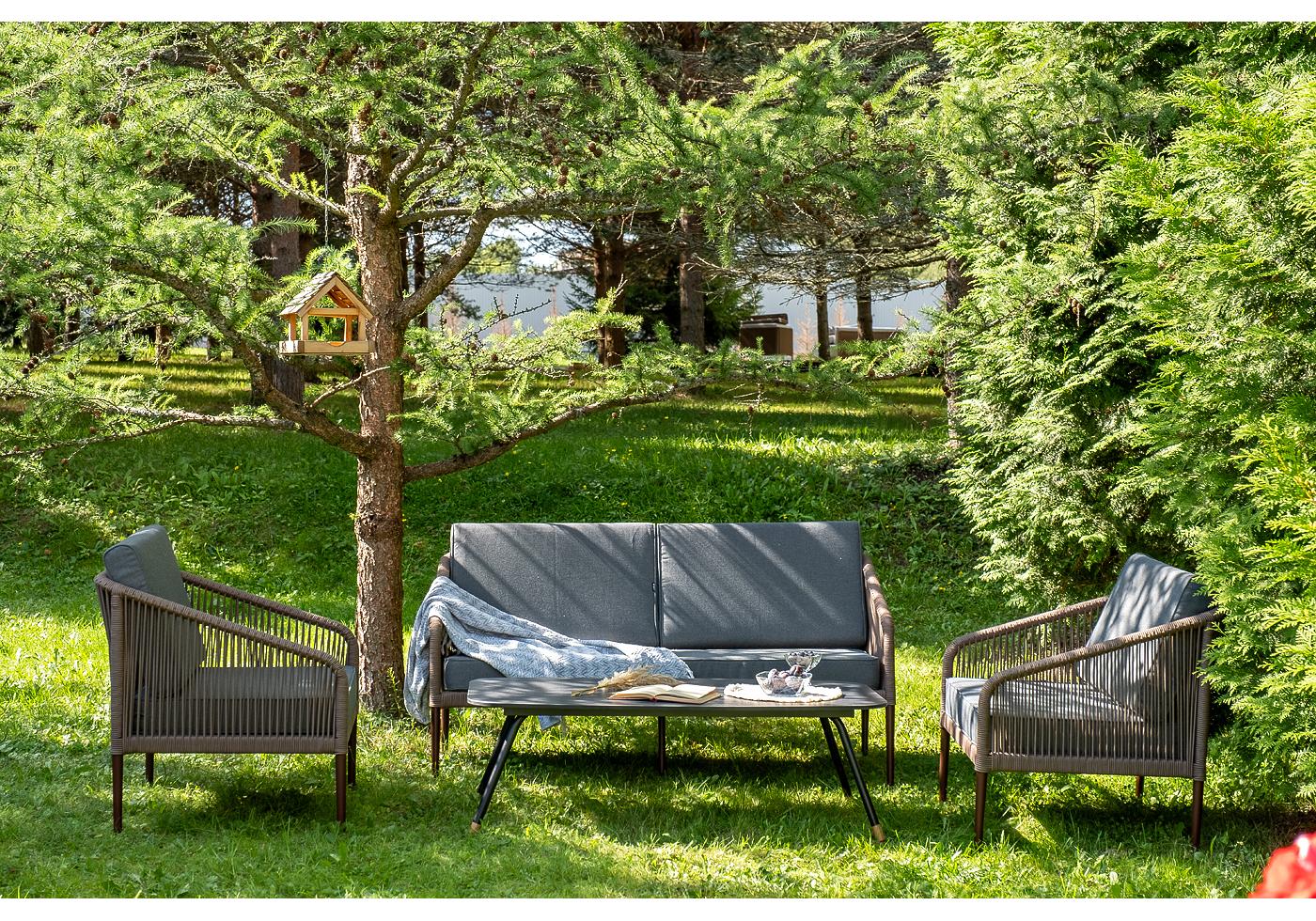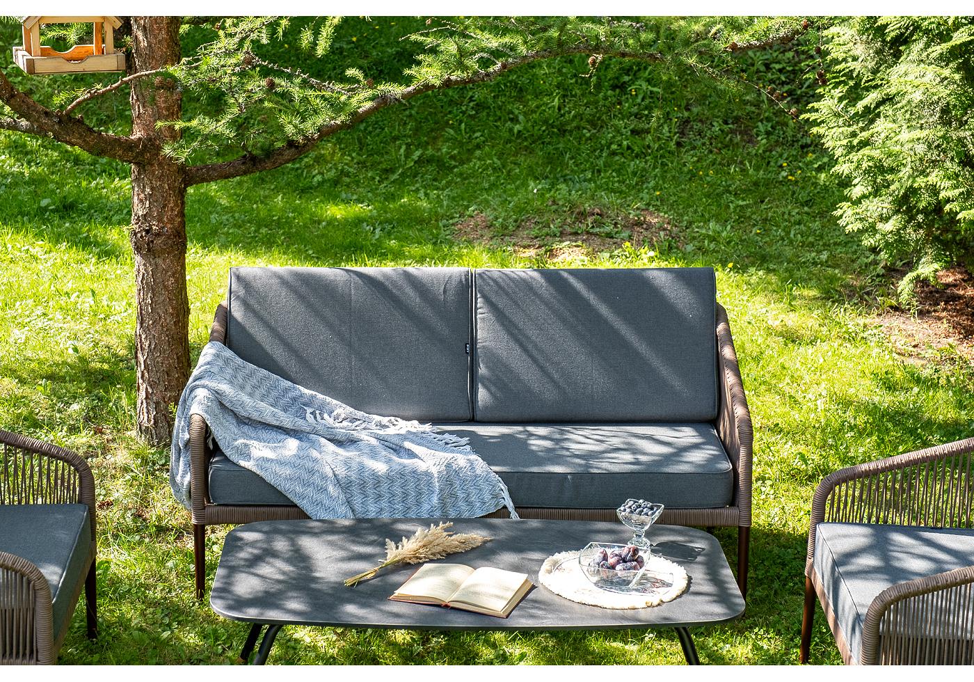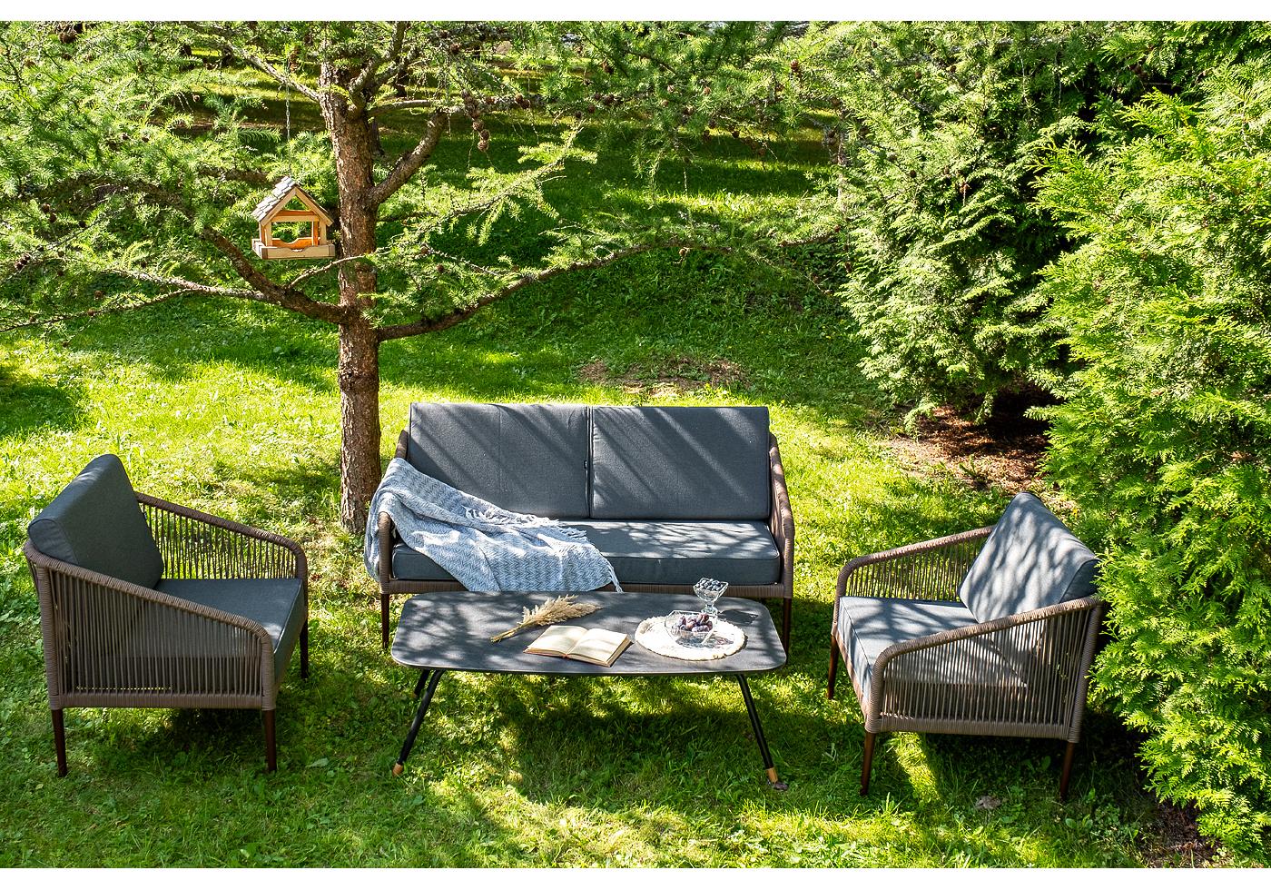 Каркас уличной мебели выполнен из прочного алюминия. Его дополняет коричневая оплетка, изготовленная на основе эластичных синтетических лент из полиэфирных волокон высокой прочности.