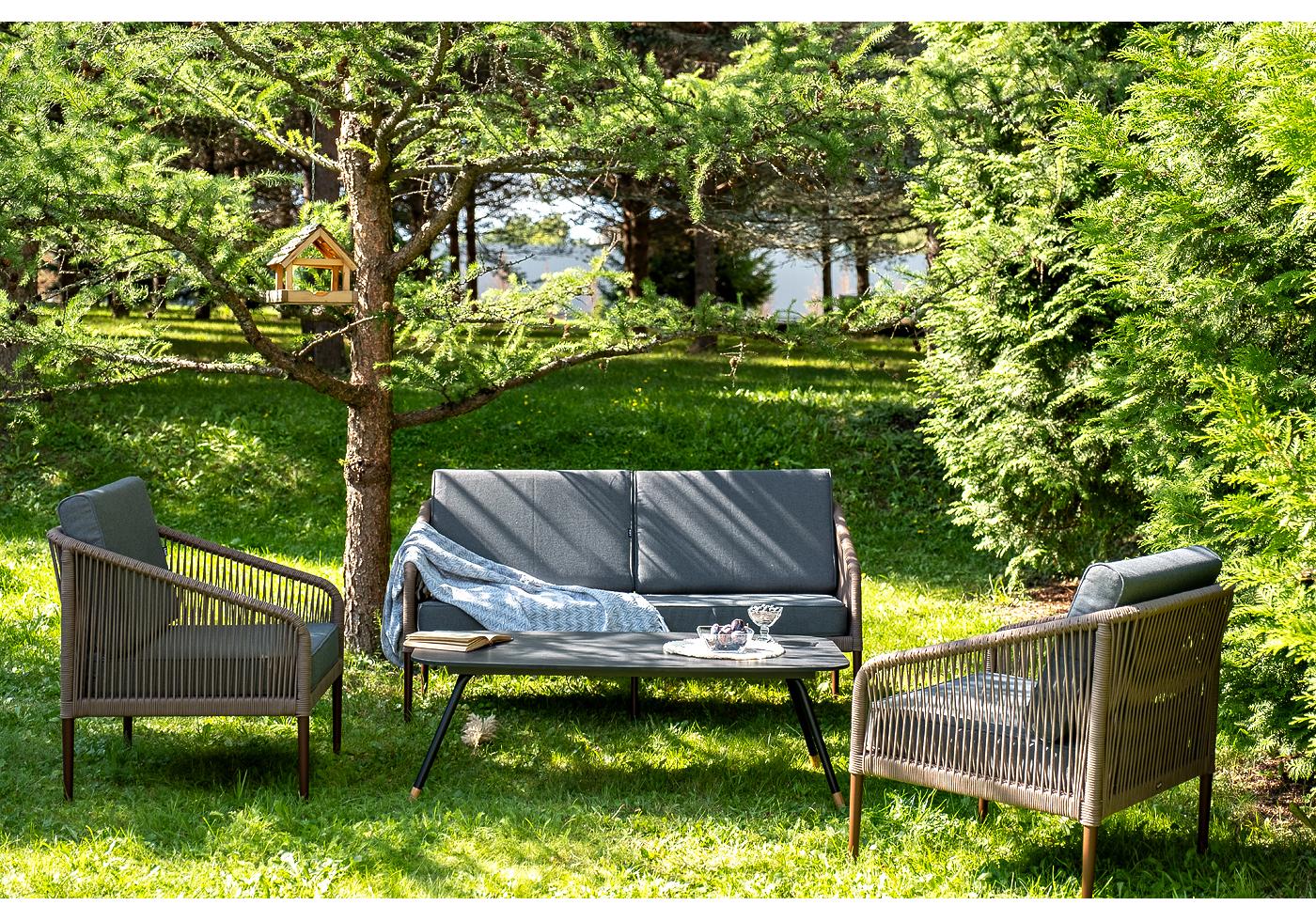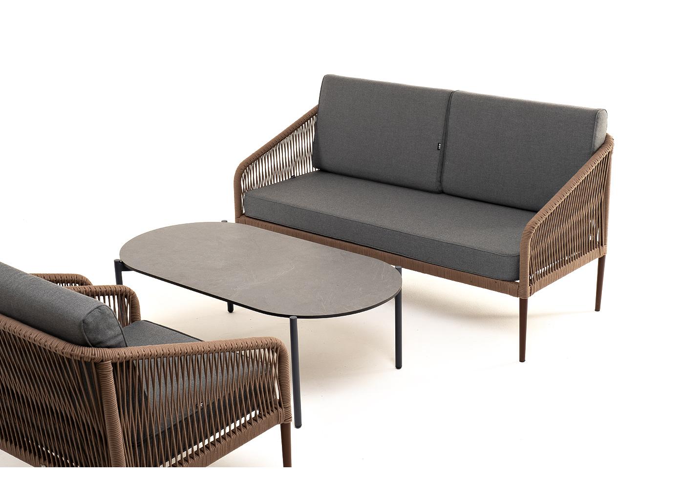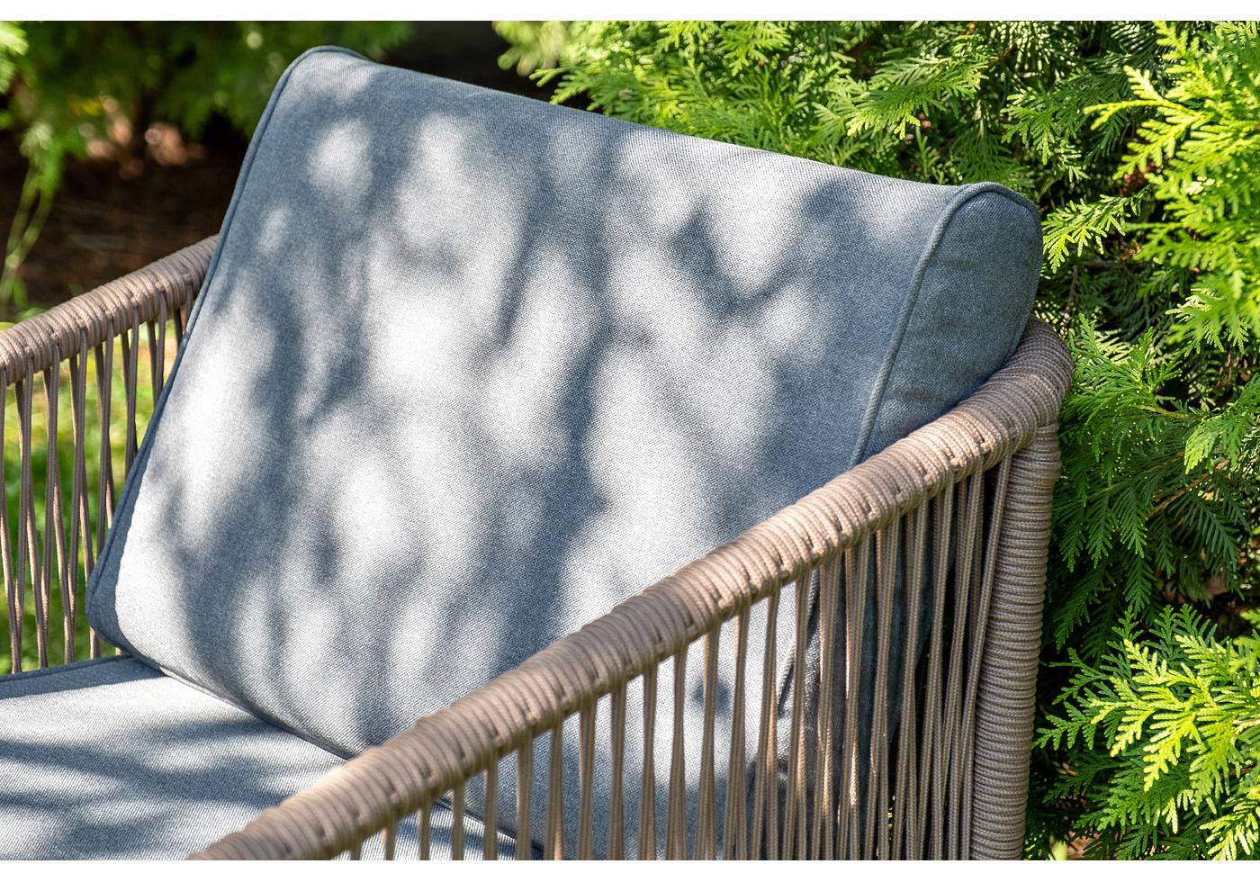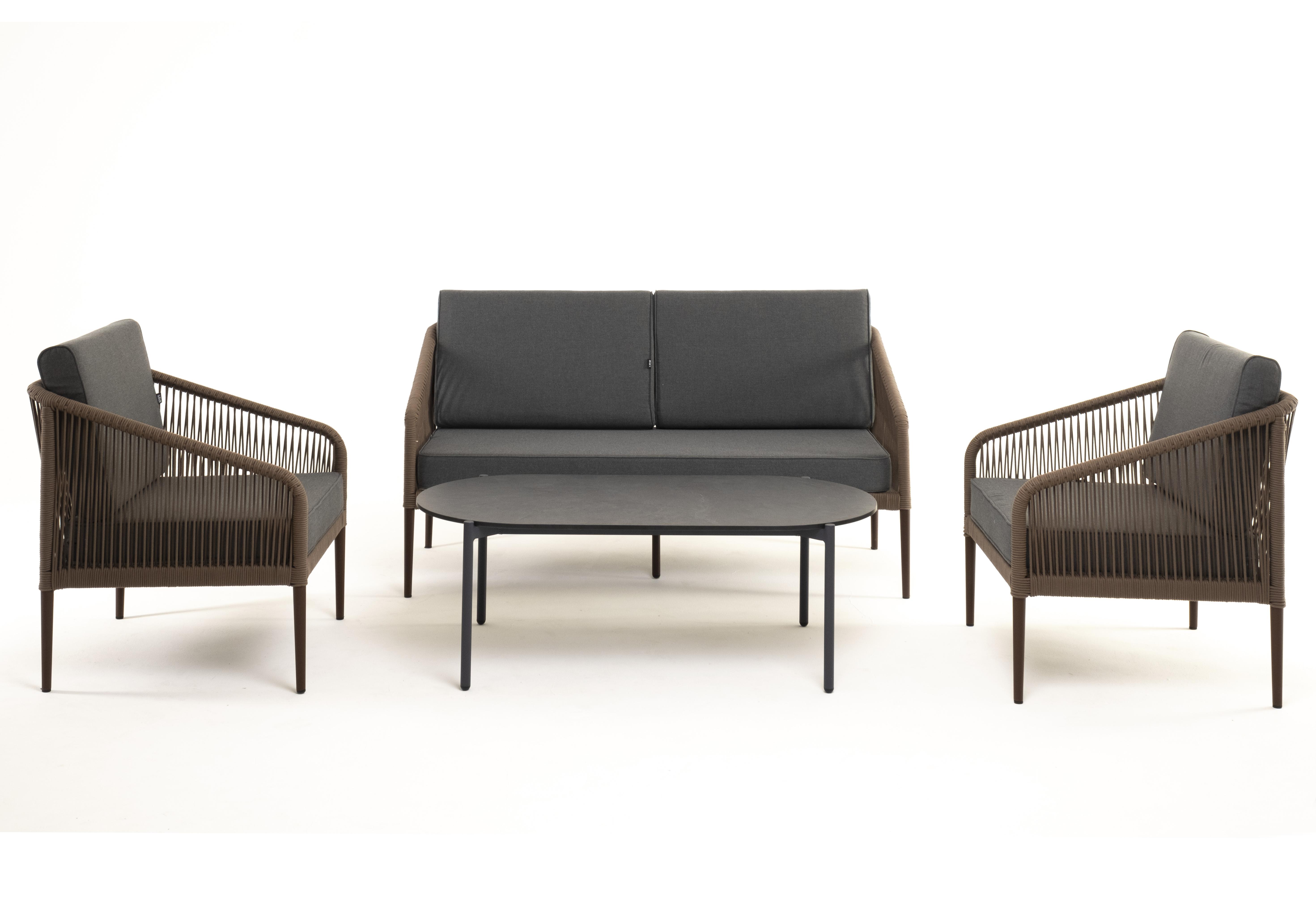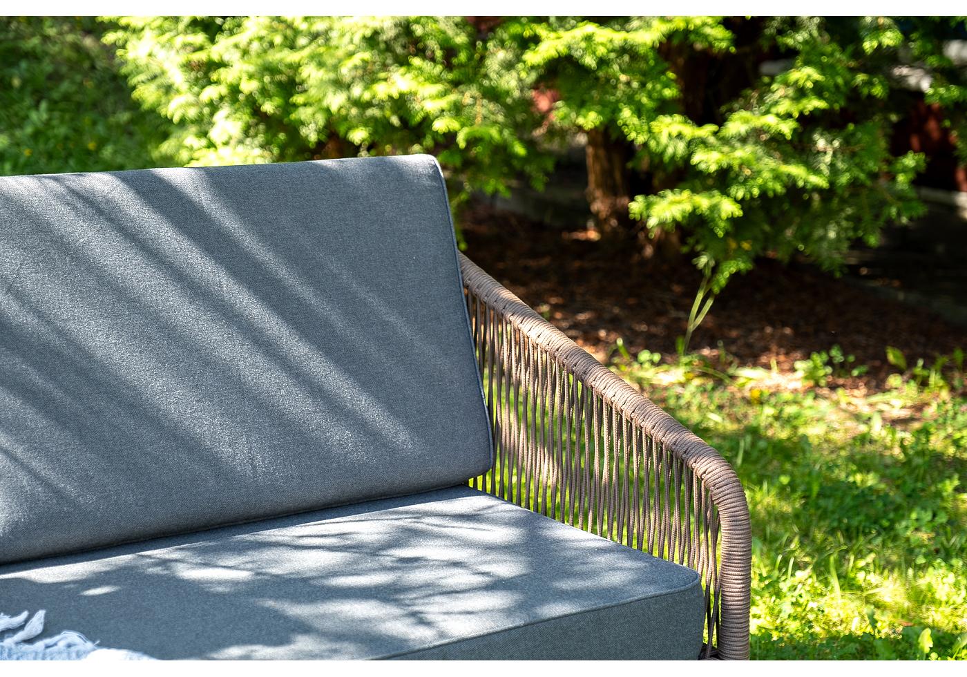 Кресла и диван идут в комплекте с мягкими подушками в чехлах темно-серого цвета. "Канны" диван 2-местный плетеный из роупа, каркас алюминий коричневый (RAL8016) муар, роуп коричневый круглый, ткань темно-серая 027 1шт. 1 500Х700Х750, "Канны" кресло плетеное из роупа, каркас алюминий коричневый (RAL8016) муар, роуп коричневый круглый, ткань темно-серая 027 2шт. 700Х700Х750, "Верона" журнальный стол из HPL 120х65, H40, каркас черный муар, цвет столешницы "серый гранит" 1шт. 1 200Х650Х400,