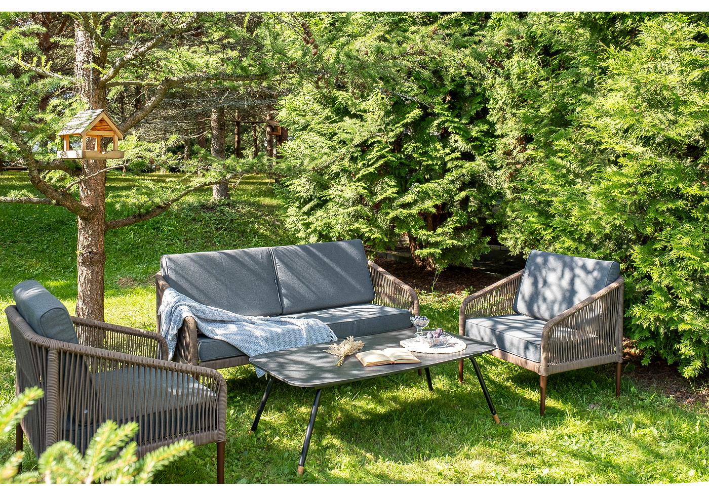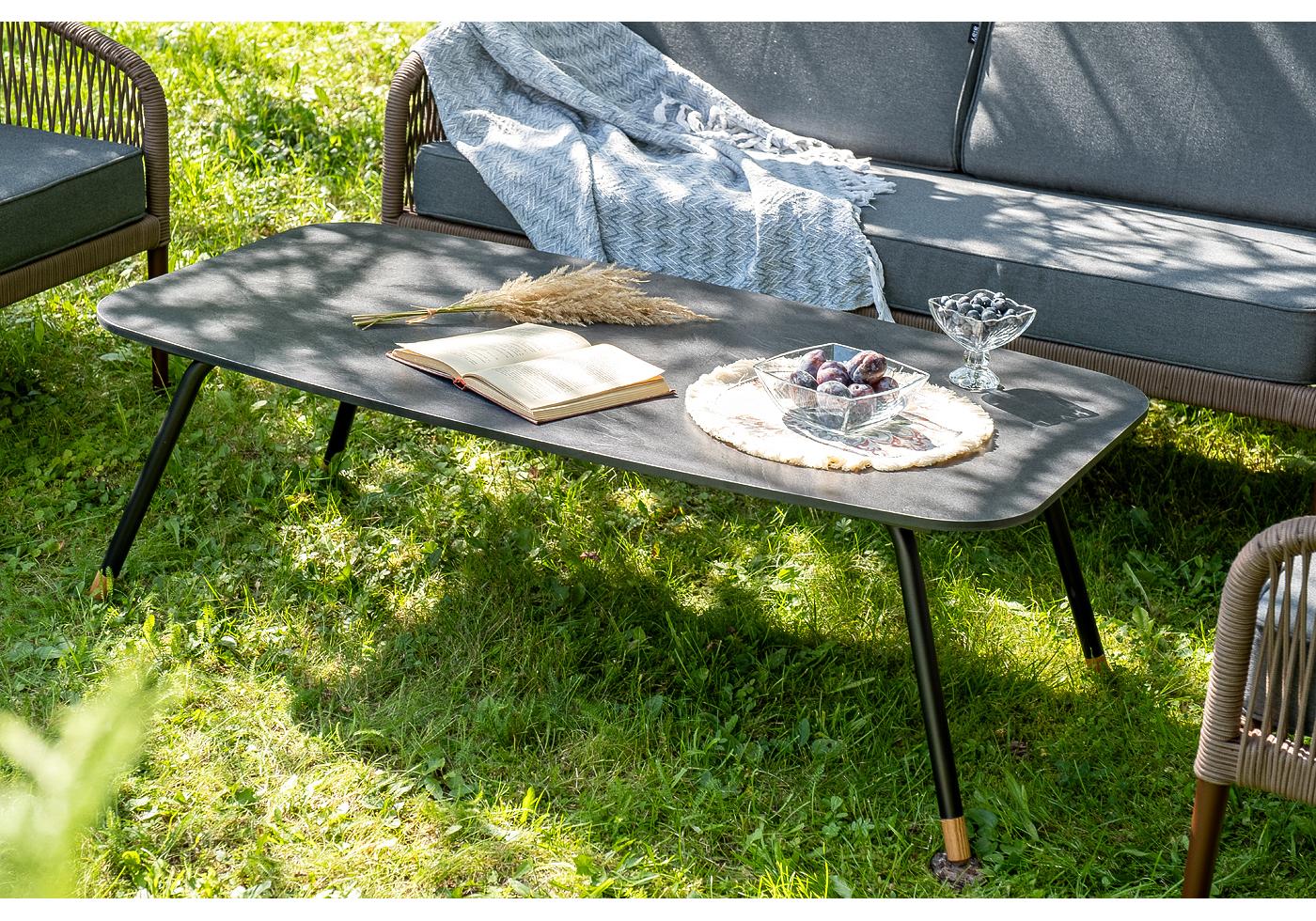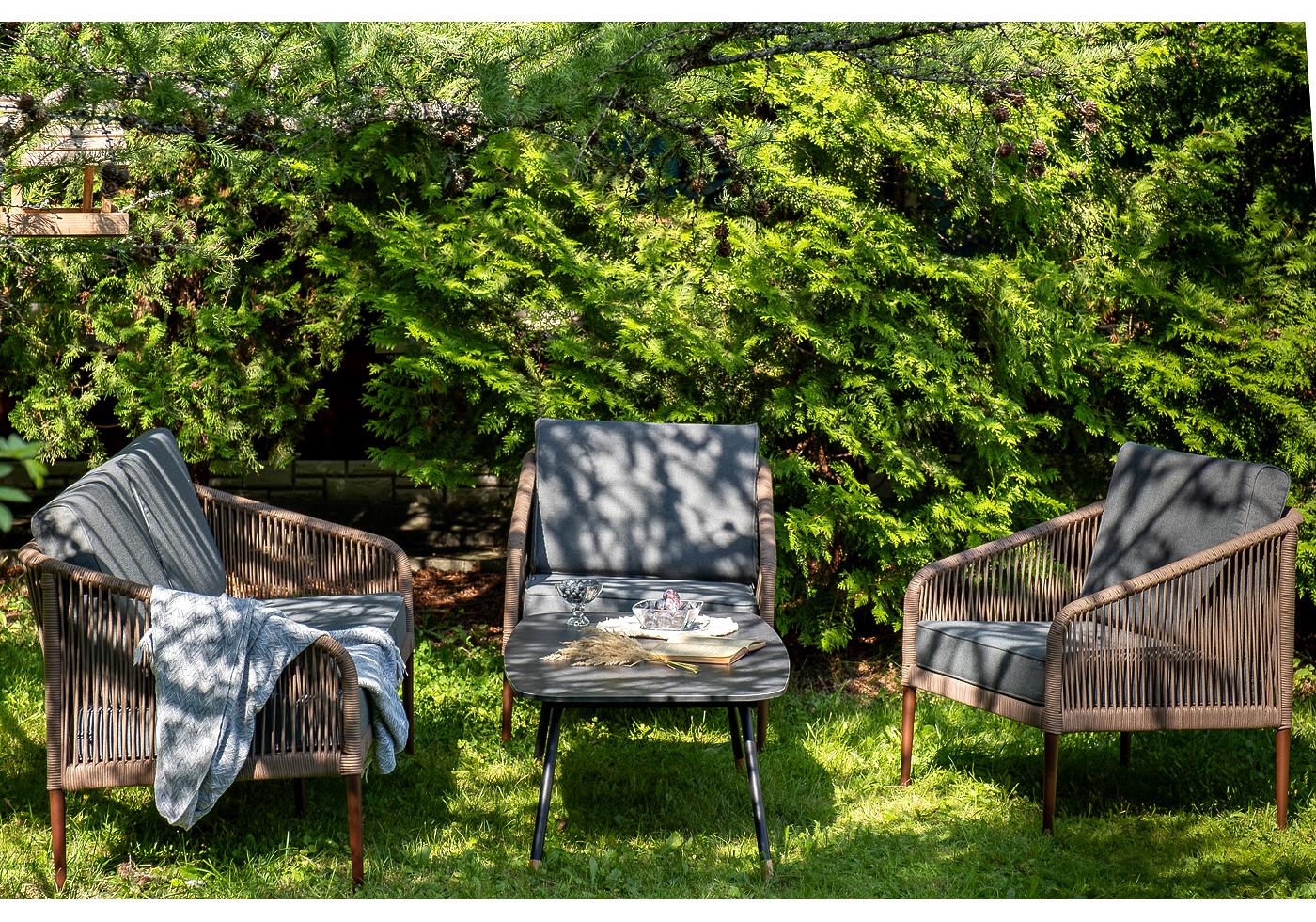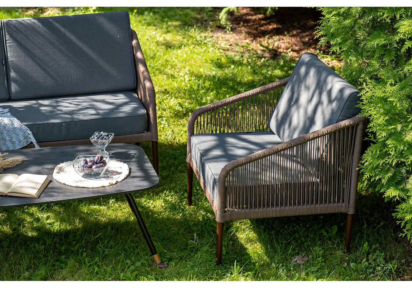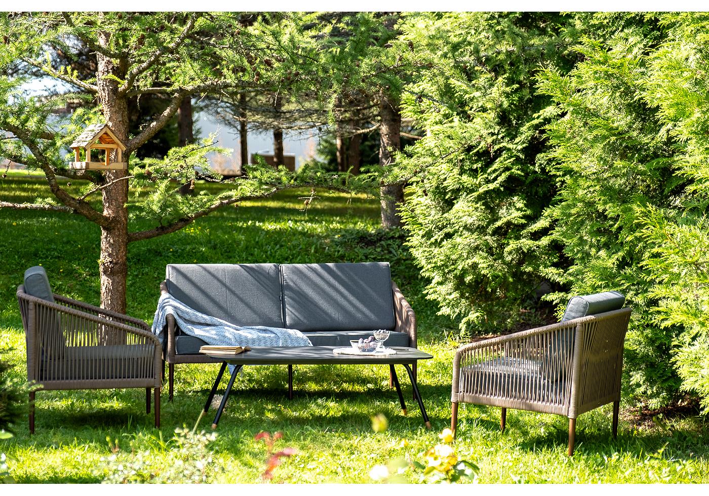 Кресла и диван идут в комплекте с мягкими подушками в чехлах темно-серого цвета. "Канны" диван 2-местный плетеный из роупа, каркас алюминий коричневый (RAL8016) муар, роуп коричневый круглый, ткань темно-серая 027 1шт. 1 500Х700Х750, "Канны" кресло плетеное из роупа, каркас алюминий коричневый (RAL8016) муар, роуп коричневый круглый, ткань темно-серая 027 2шт. 700Х700Х750, "Верона" журнальный стол из HPL 120х65, H40, каркас черный муар, цвет столешницы "серый гранит" 1шт. 1 200Х650Х400,