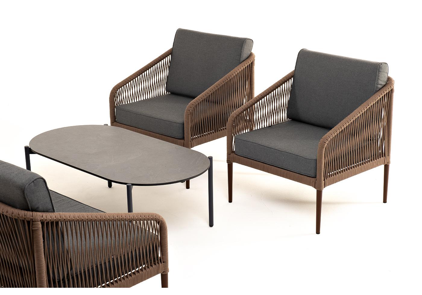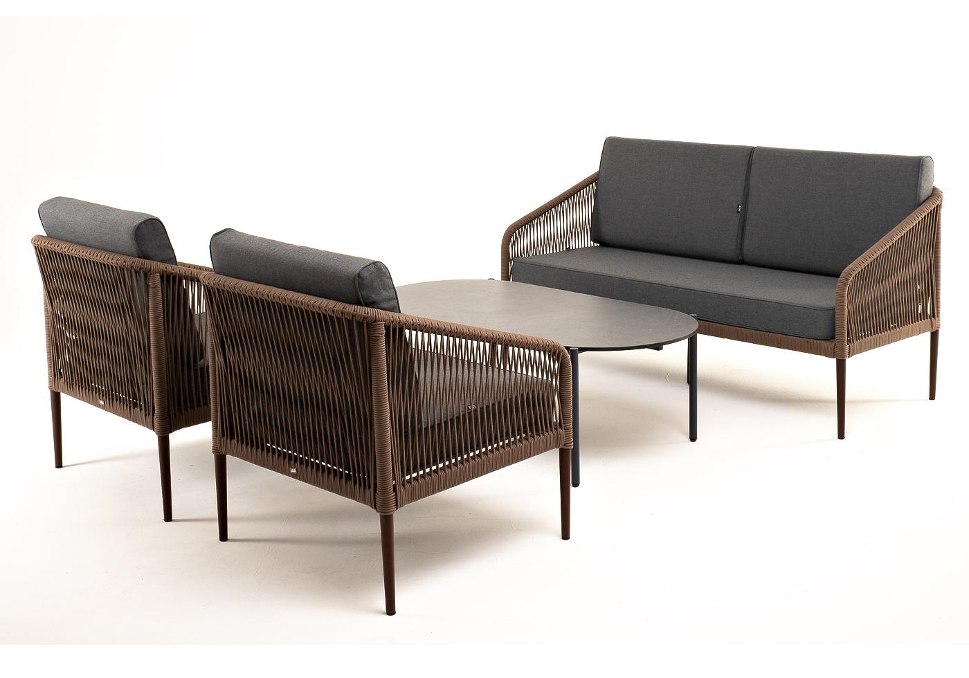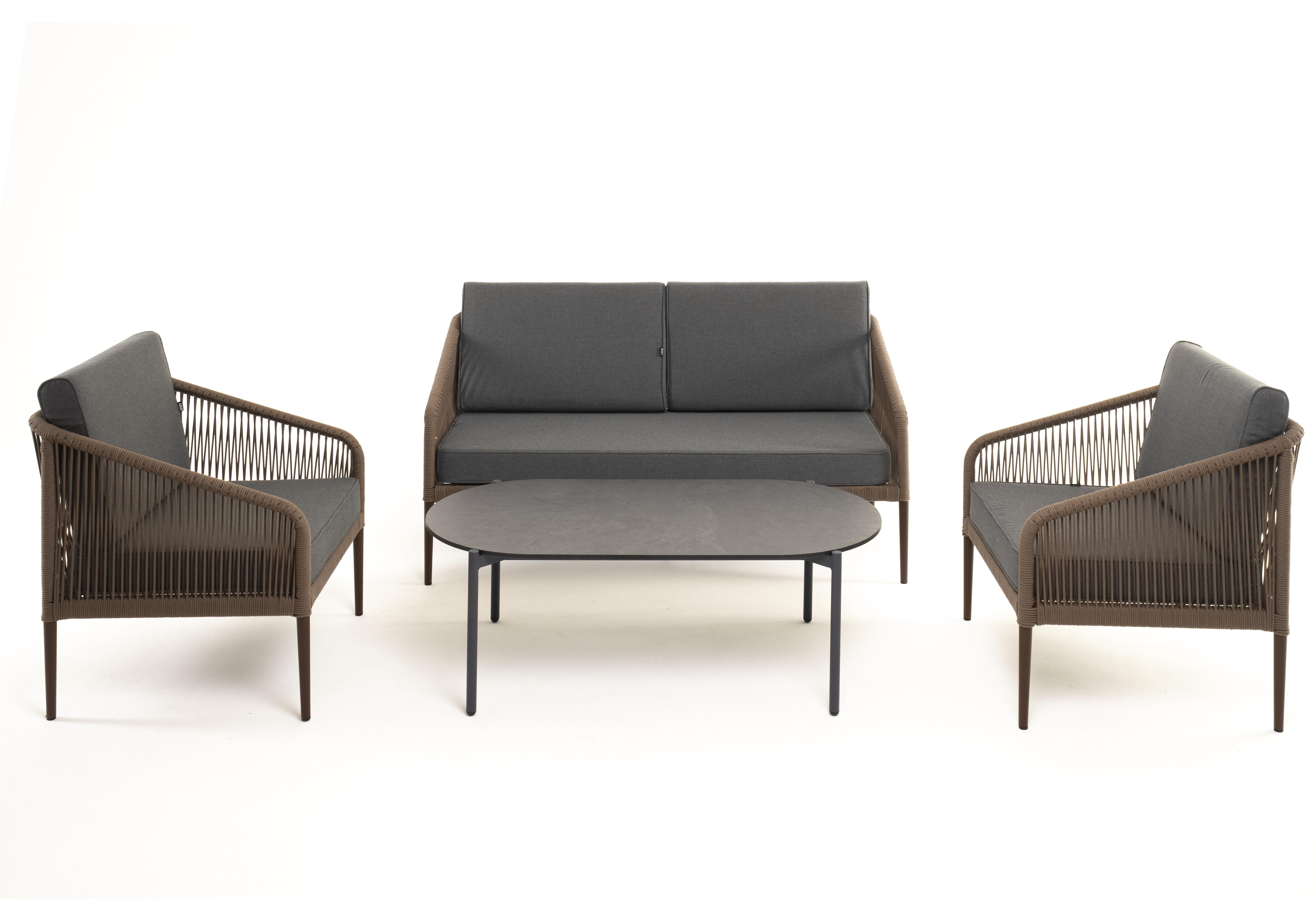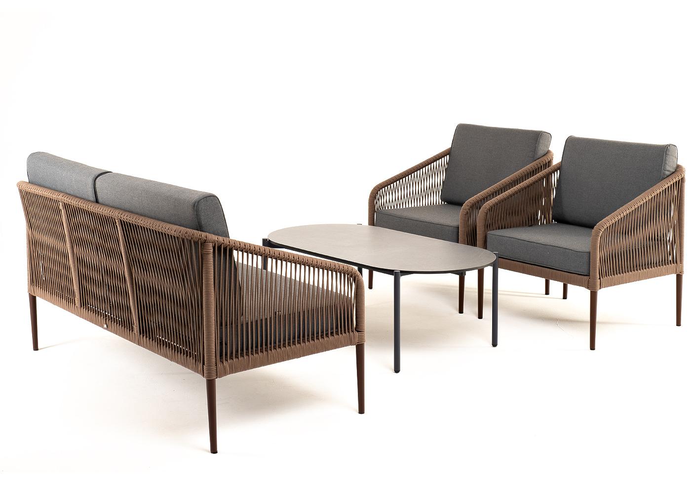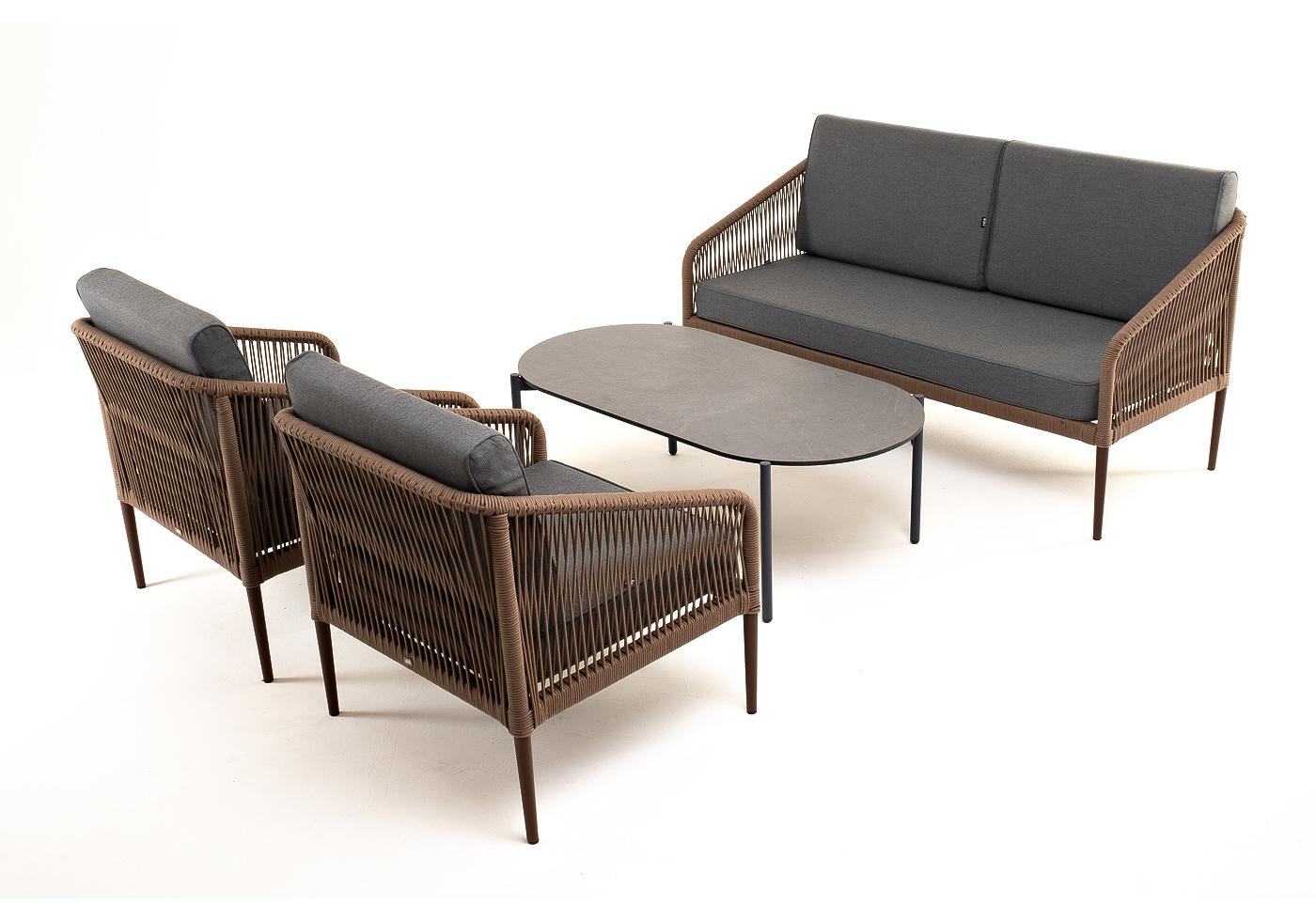 "Канны" лаунж-зона 4-местная из роупа со столом "Верона" (серый гранит), каркас алюминиевый коричневый, роуп коричневый