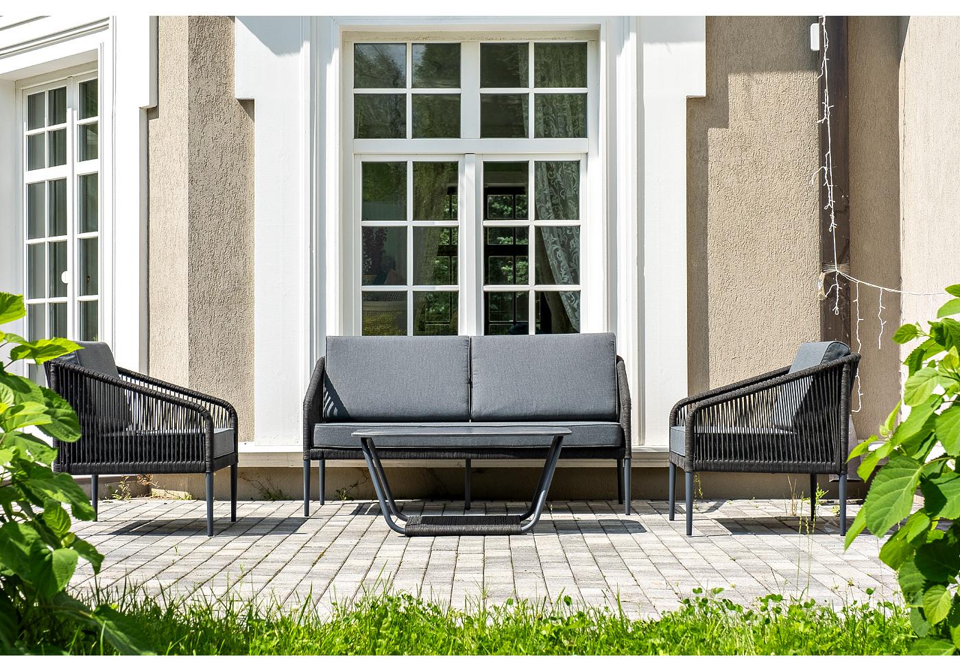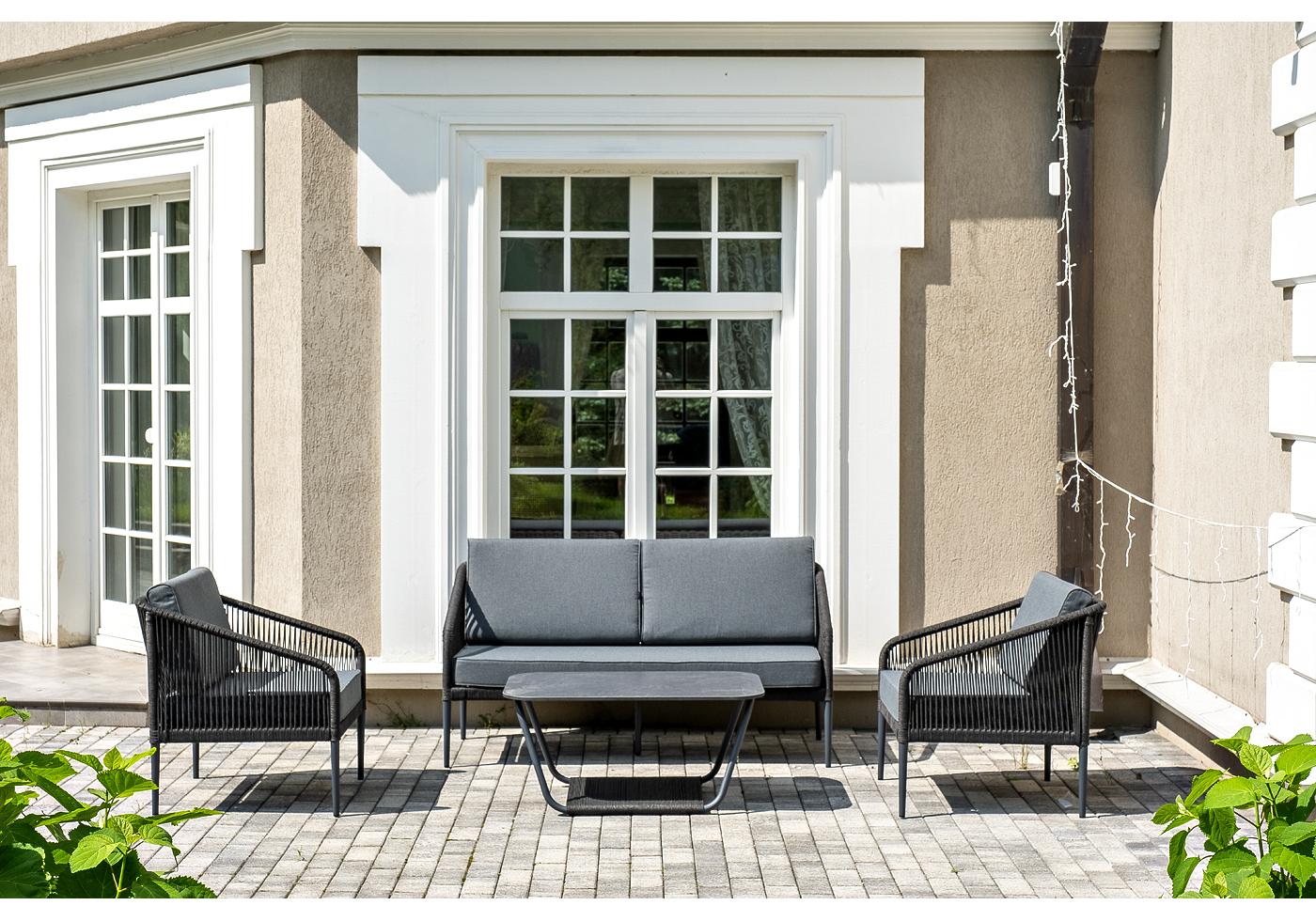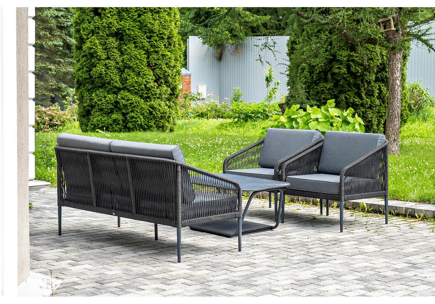 Кресла и диван идут в комплекте с мягкими подушками в чехлах темно-серог "Канны" диван 2-местный плетеный из роупа, каркас алюминий темно-серый (RAL7024) муар, роуп темно-серый круглый, ткань темно-серая 027 1шт. 1 500Х700Х750, "Канны" кресло плетеное из роупа, каркас алюминий темно-серый (RAL7024) муар, роуп темно-серый круглый, ткань темно-серая 027 2шт. 700Х700Х750, "Гранада" журнальный стол 90х60см из HPL, цвет "серый гранит", каркас темно-серый (RAL7024) муар, роуп темно-серый круглый 1шт. 900Х600Х420,