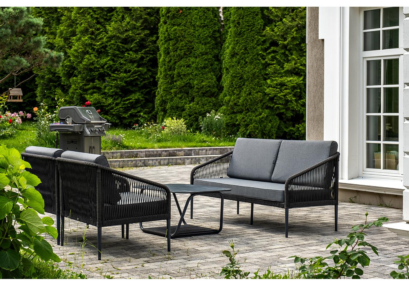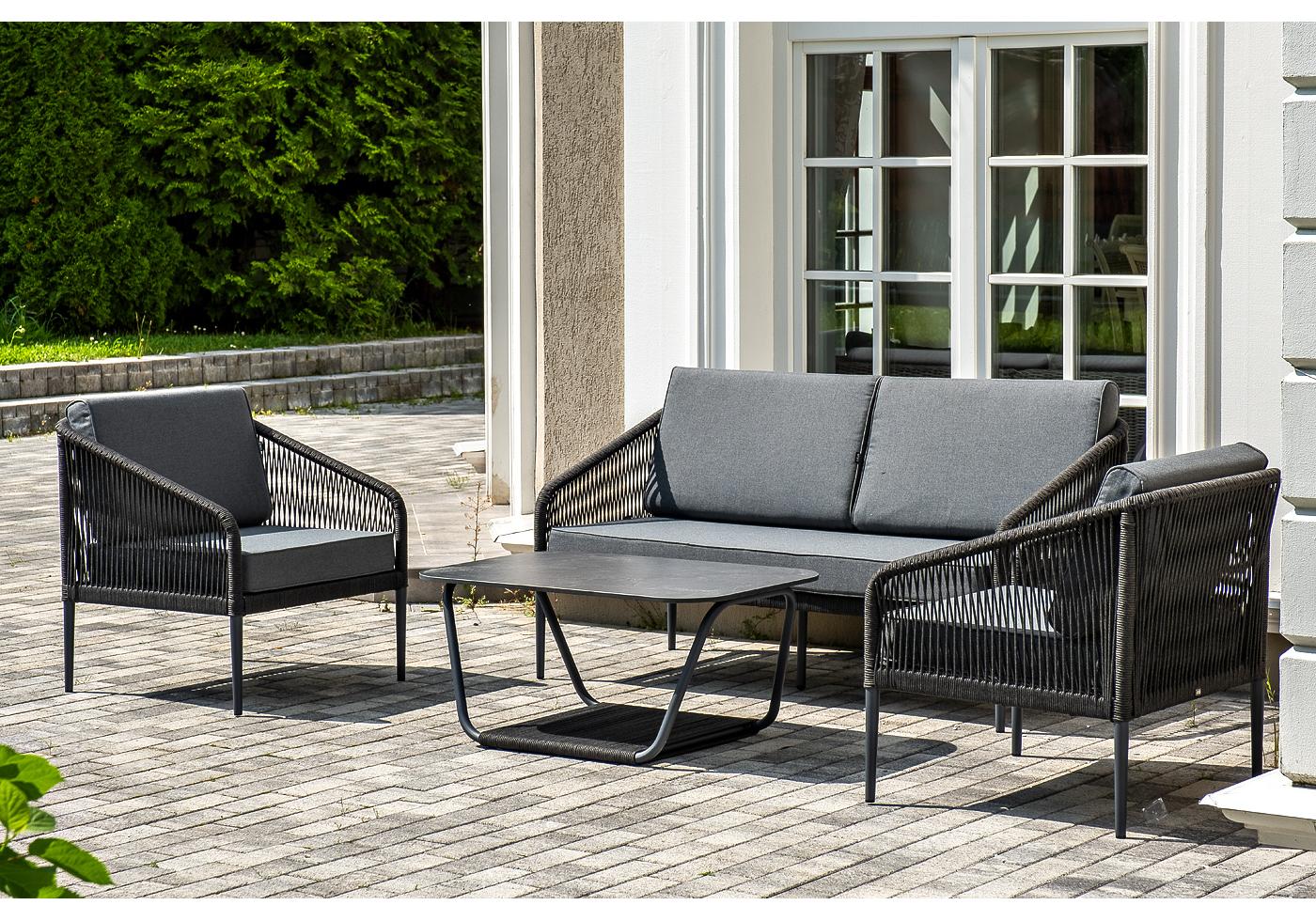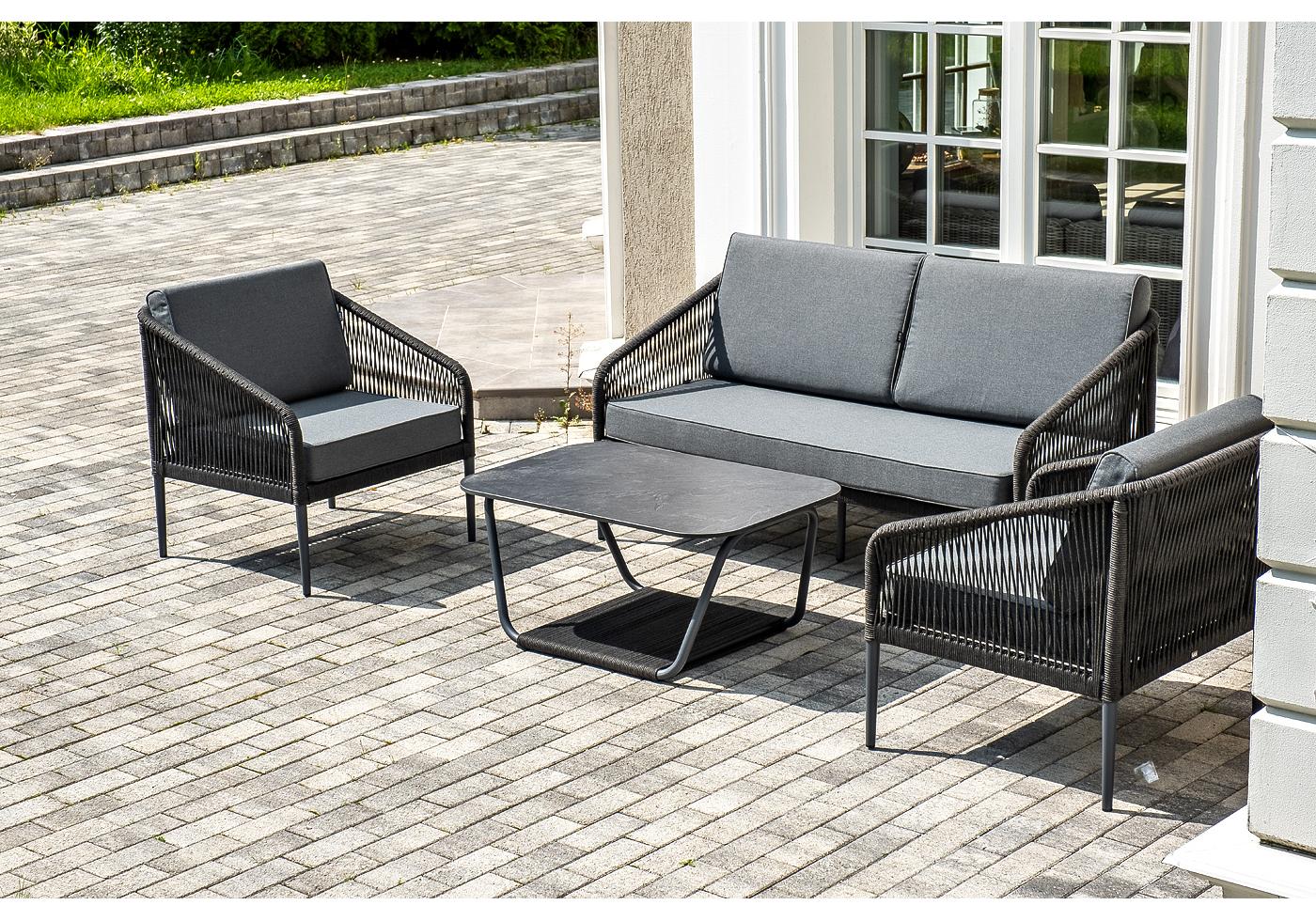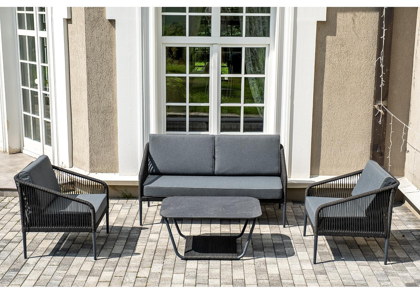 Кресла и диван идут в комплекте с мягкими подушками в чехлах темно-серог "Канны" диван 2-местный плетеный из роупа, каркас алюминий темно-серый (RAL7024) муар, роуп темно-серый круглый, ткань темно-серая 027 1шт. 1 500Х700Х750, "Канны" кресло плетеное из роупа, каркас алюминий темно-серый (RAL7024) муар, роуп темно-серый круглый, ткань темно-серая 027 2шт. 700Х700Х750, "Гранада" журнальный стол 90х60см из HPL, цвет "серый гранит", каркас темно-серый (RAL7024) муар, роуп темно-серый круглый 1шт. 900Х600Х420,