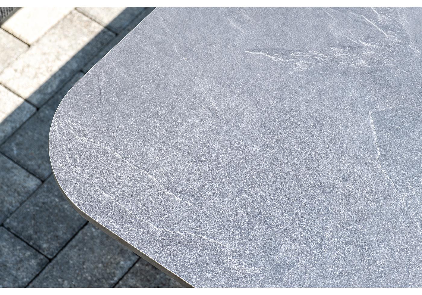 Каркас уличной мебели выполнен из износостойкого алюминия. Его дополняет серая ручная оплетка, изготовленная на основе эластичных синтетических лент из полиэфирных волокон высокой прочности.