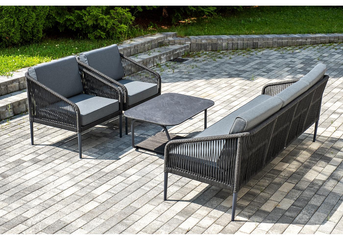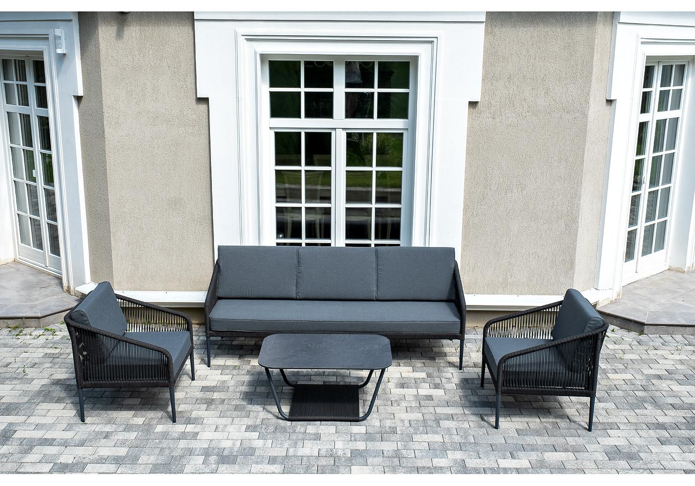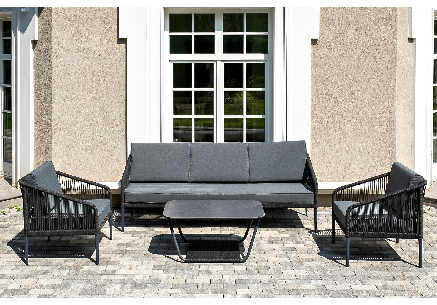 Кресла и диван идут в комплекте с мягкими подушками в чехлах серого цвета. "Канны" диван 3-местный плетеный из роупа, каркас алюминий темно-серый (RAL7024) муар, роуп темно-серый круглый, ткань темно-серая 027 1шт. 2 030Х700Х750, "Канны" кресло плетеное из роупа, каркас алюминий темно-серый (RAL7024) муар, роуп темно-серый круглый, ткань темно-серая 027 2шт. 700Х700Х750, "Гранада" журнальный стол 90х60см из HPL, цвет "серый гранит", каркас темно-серый (RAL7024) муар, роуп темно-серый круглый 1шт. 900Х600Х420,