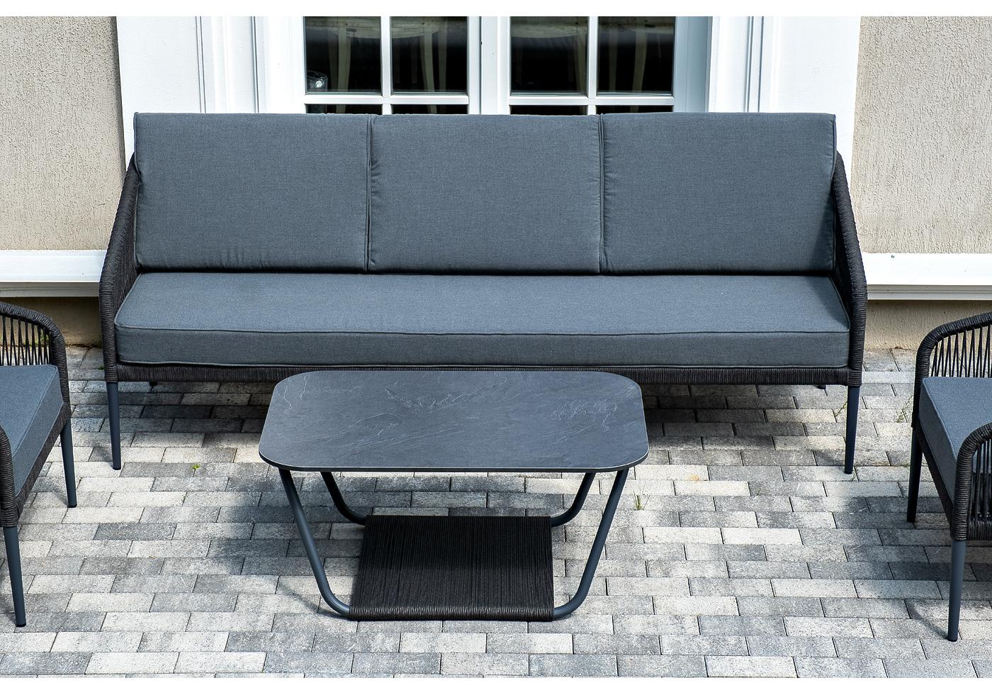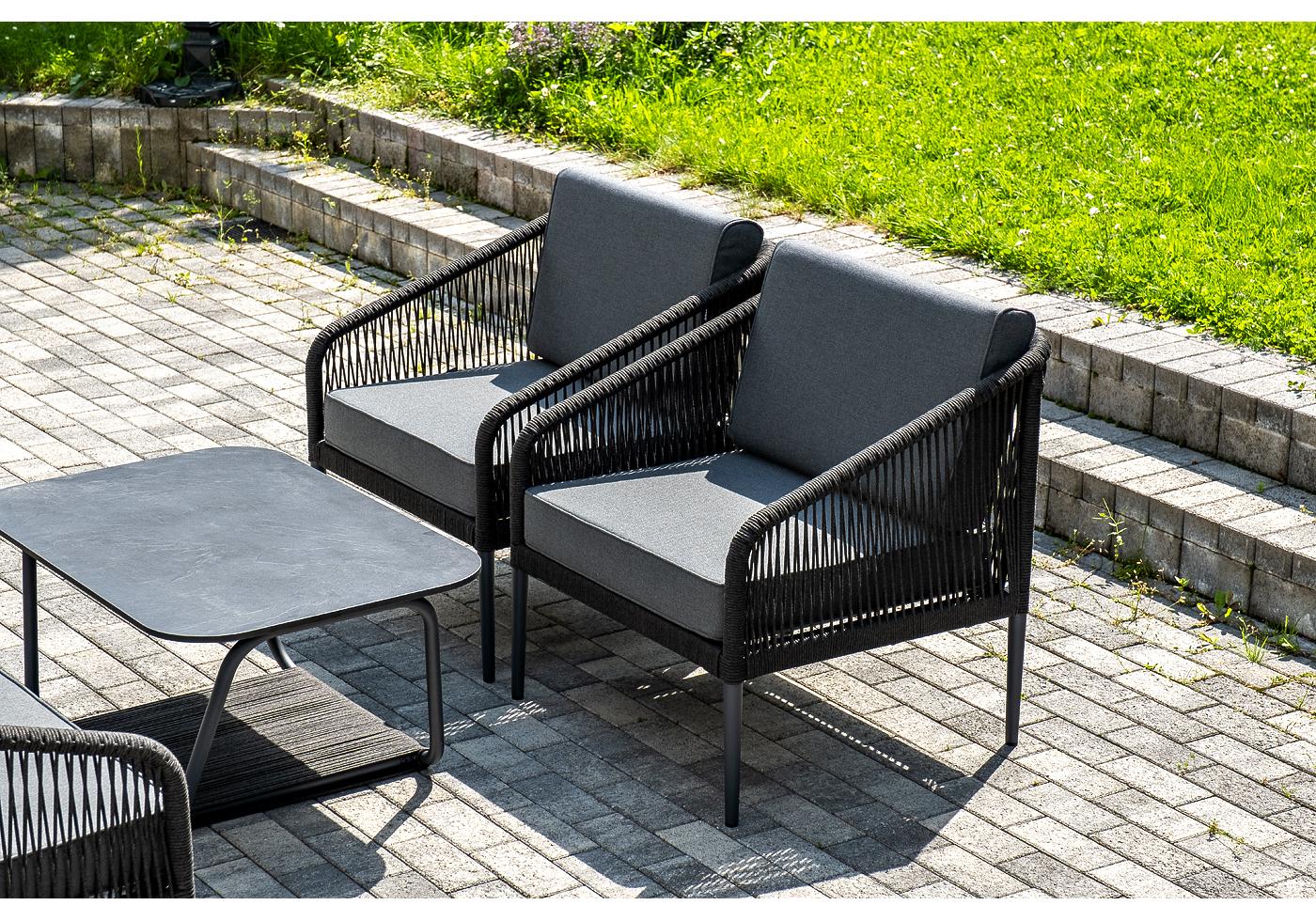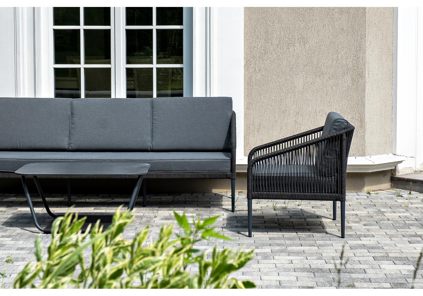 Кресла и диван идут в комплекте с мягкими подушками в чехлах серого цвета. "Канны" диван 3-местный плетеный из роупа, каркас алюминий темно-серый (RAL7024) муар, роуп темно-серый круглый, ткань темно-серая 027 1шт. 2 030Х700Х750, "Канны" кресло плетеное из роупа, каркас алюминий темно-серый (RAL7024) муар, роуп темно-серый круглый, ткань темно-серая 027 2шт. 700Х700Х750, "Гранада" журнальный стол 90х60см из HPL, цвет "серый гранит", каркас темно-серый (RAL7024) муар, роуп темно-серый круглый 1шт. 900Х600Х420,