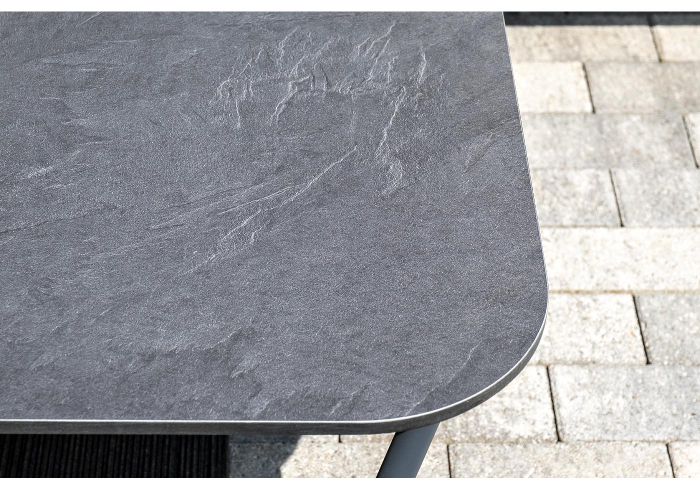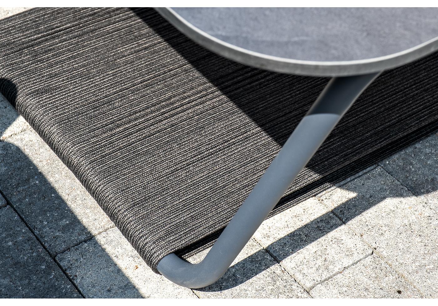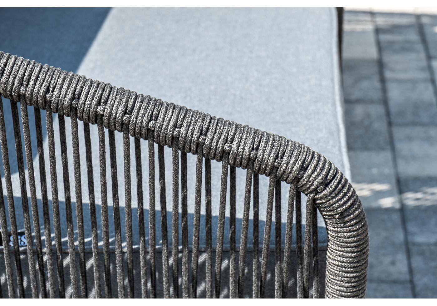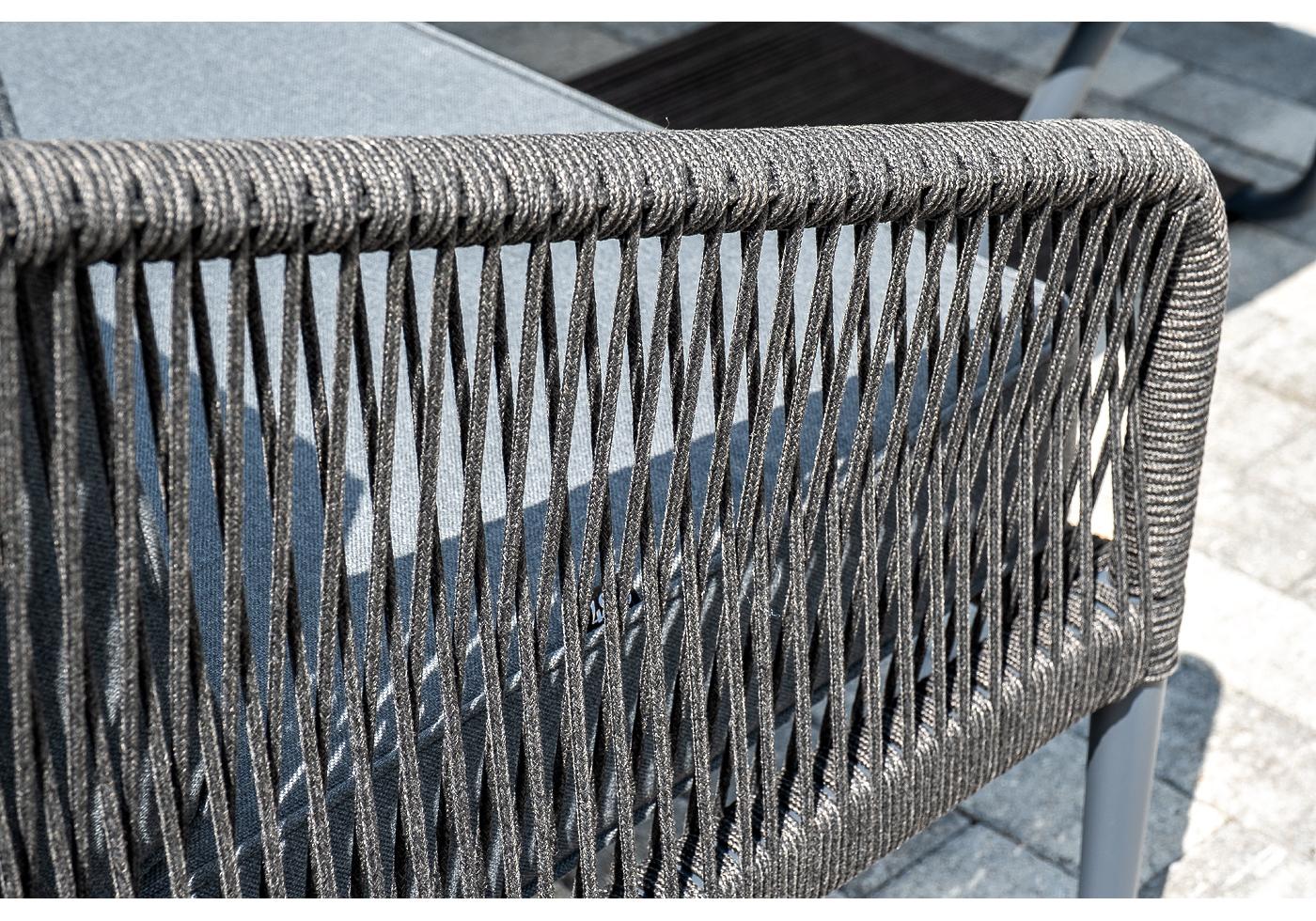 Каркас уличной мебели выполнен из износостойкого алюминия. Его дополняет темно-серая ручная оплетка, изготовленная на основе эластичных синтетических лент из полиэфирных волокон высокой прочности.