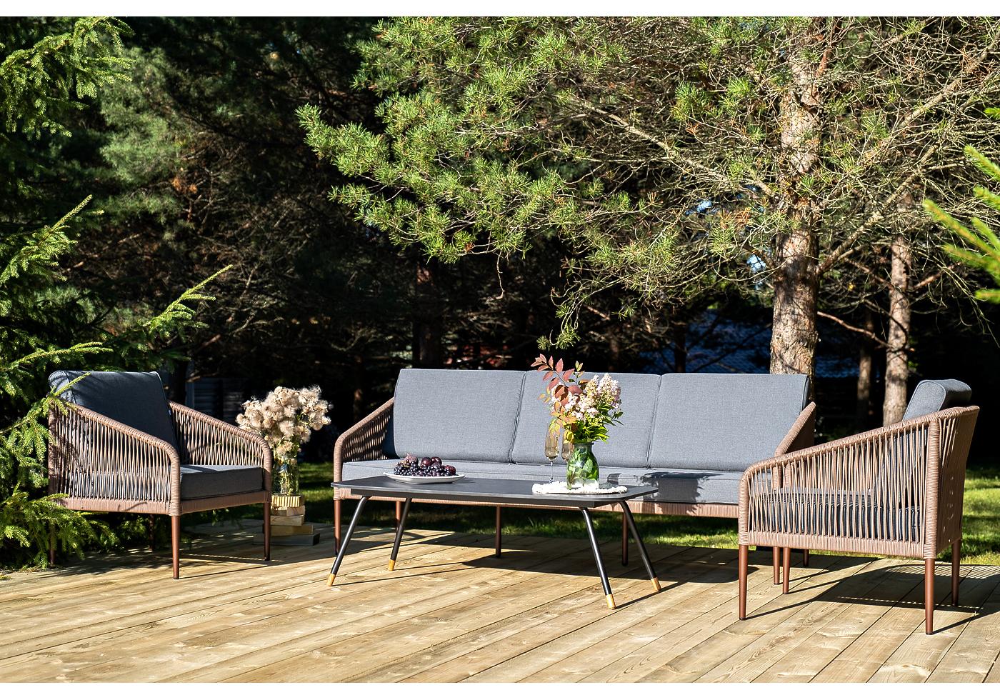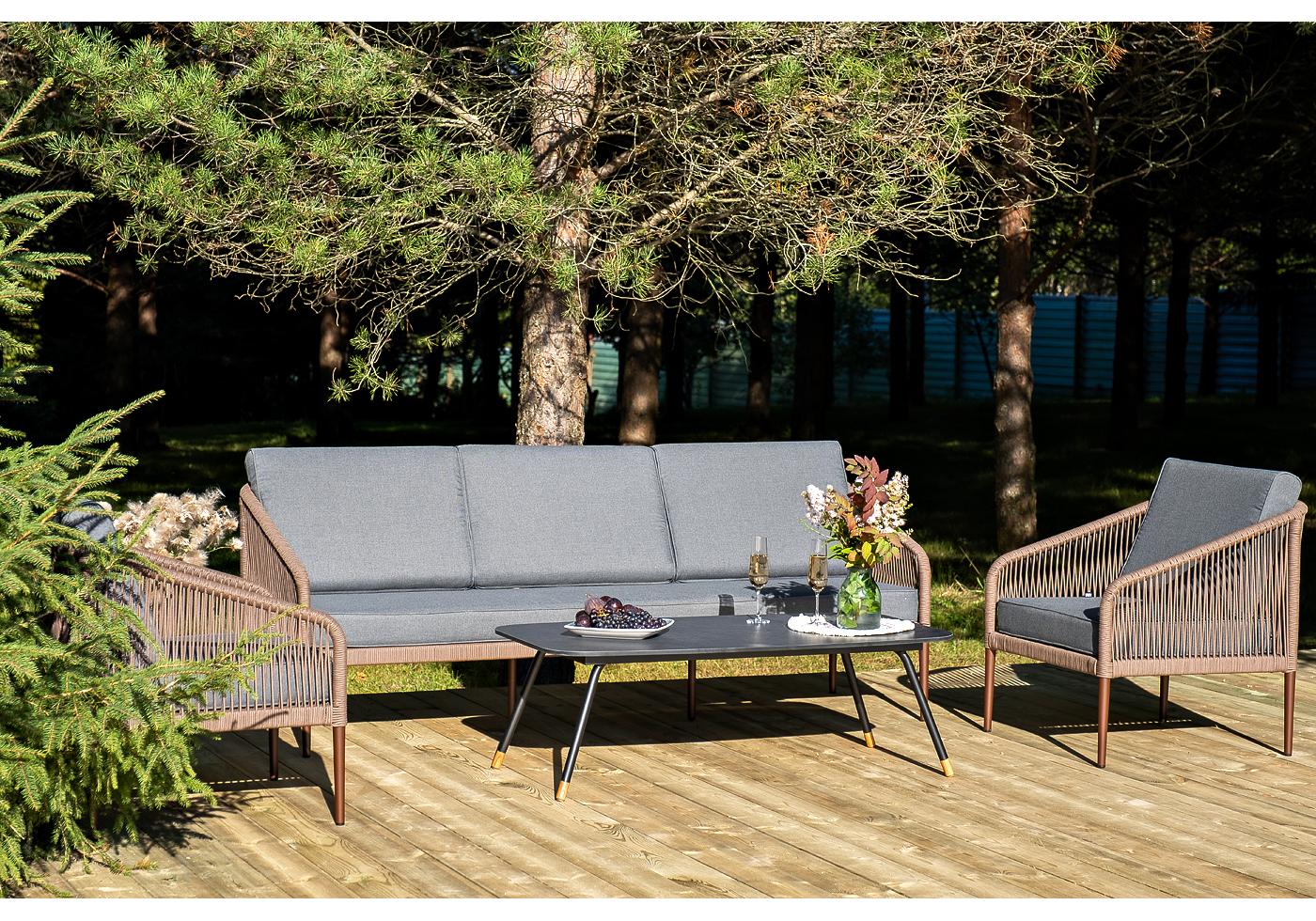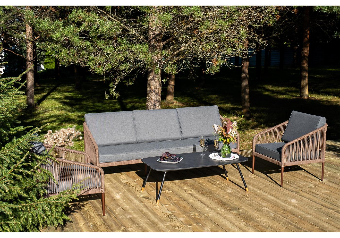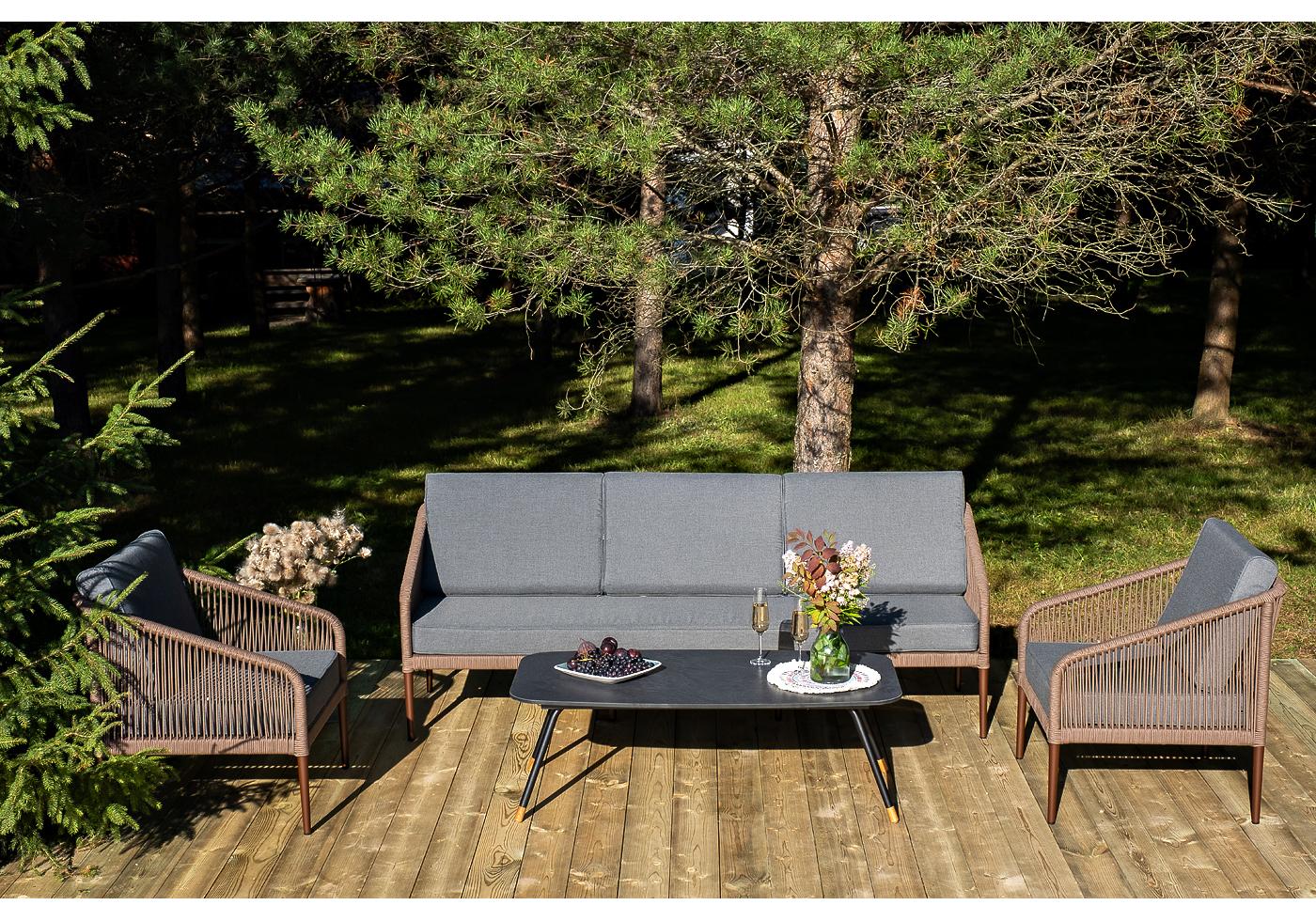 Кресла и диван идут в комплекте с мягкими подушками в чехлах темно-серого цвета. "Верона" журнальный стол из HPL 120х65, H40, каркас черный муар, цвет столешницы "серый гранит" 1шт. 1 200Х650Х400, "Канны" диван 3-местный плетеный из роупа, каркас алюминий коричневый (RAL8016) муар, роуп коричневый круглый, ткань темно-серая 027 1шт. 2 030Х700Х750, "Канны" кресло плетеное из роупа, каркас алюминий коричневый (RAL8016) муар, роуп коричневый круглый, ткань темно-серая 027 2шт. 700Х700Х750,