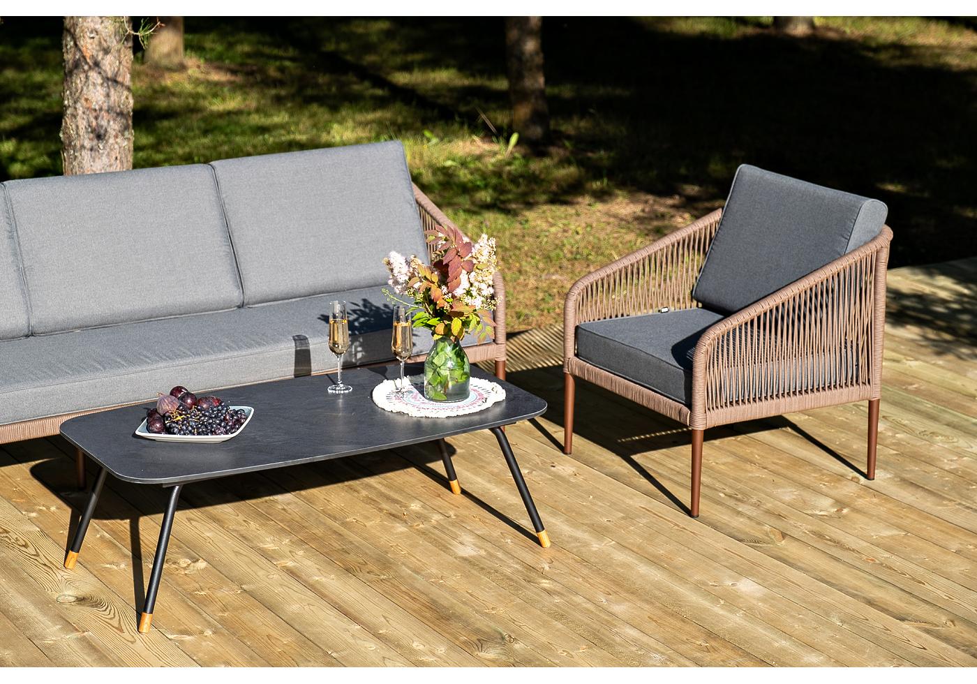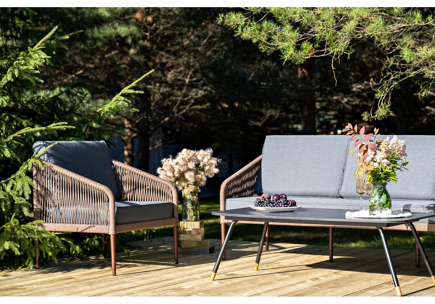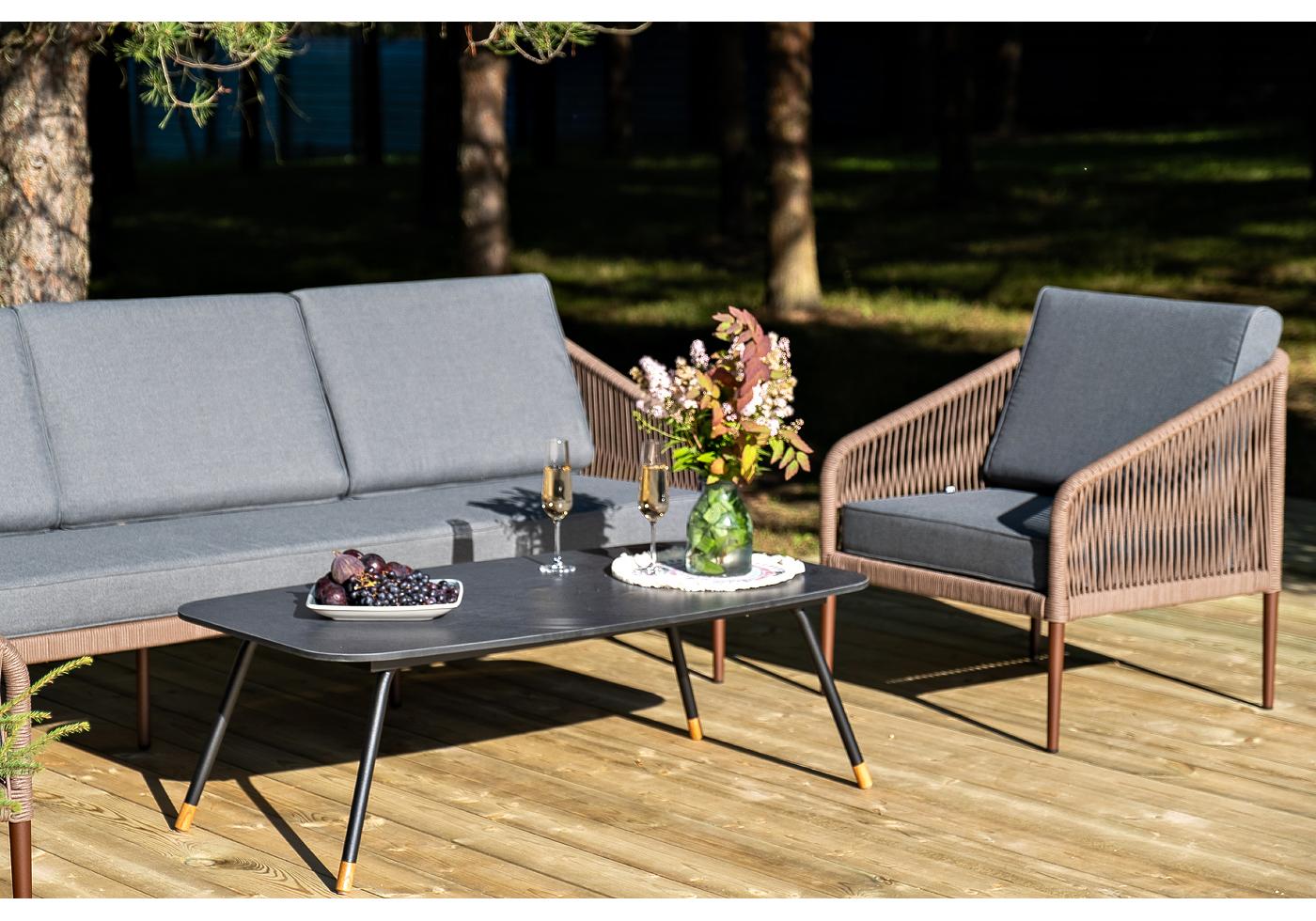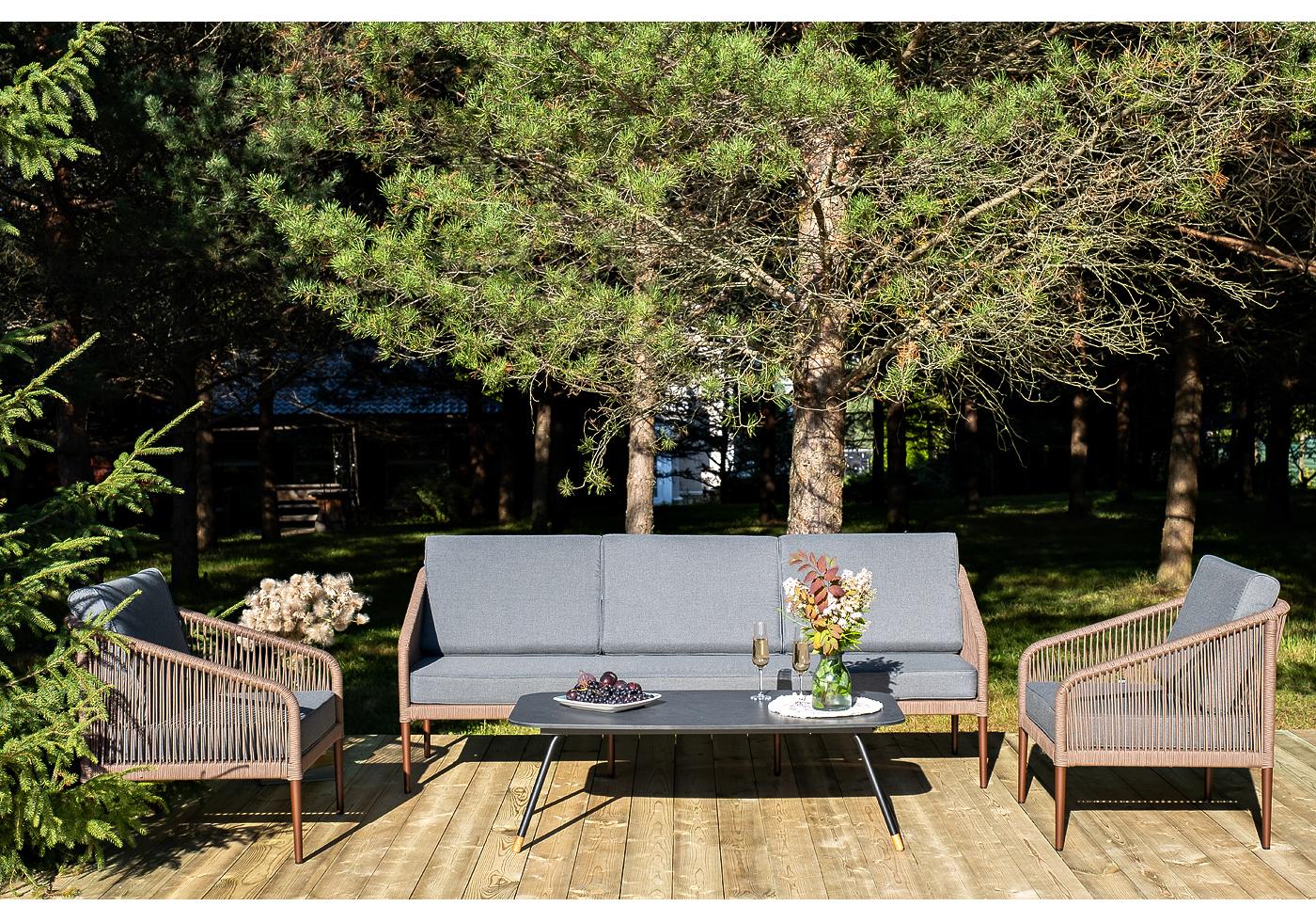 Кресла и диван идут в комплекте с мягкими подушками в чехлах темно-серого цвета. "Верона" журнальный стол из HPL 120х65, H40, каркас черный муар, цвет столешницы "серый гранит" 1шт. 1 200Х650Х400, "Канны" диван 3-местный плетеный из роупа, каркас алюминий коричневый (RAL8016) муар, роуп коричневый круглый, ткань темно-серая 027 1шт. 2 030Х700Х750, "Канны" кресло плетеное из роупа, каркас алюминий коричневый (RAL8016) муар, роуп коричневый круглый, ткань темно-серая 027 2шт. 700Х700Х750,