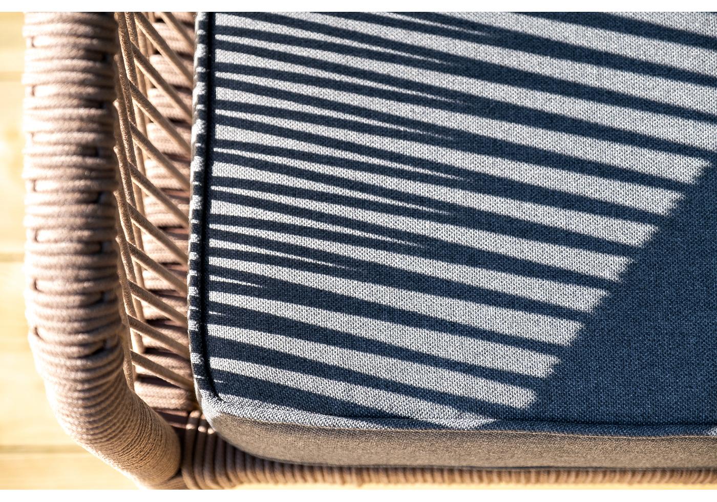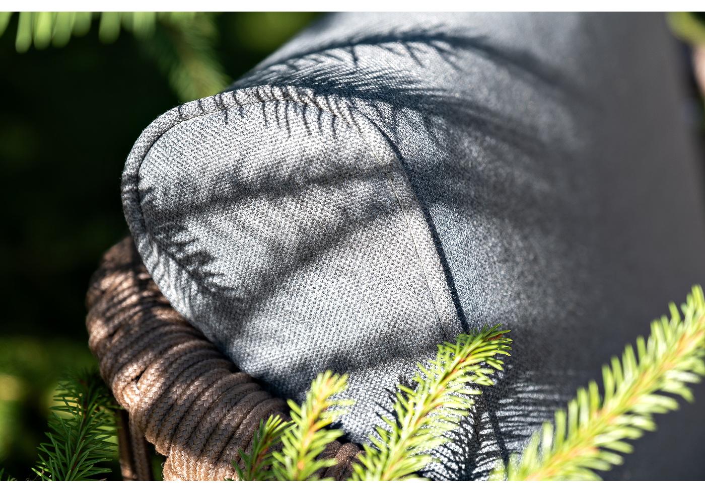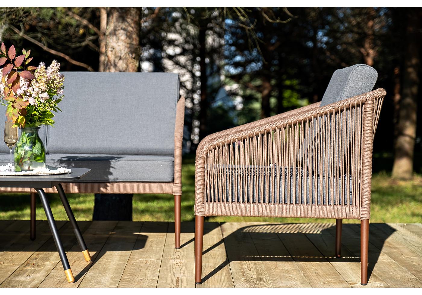 Каркас уличной мебели выполнен из износостойкого алюминия. Его дополняет коричневая ручная оплетка, изготовленная на основе эластичных синтетических лент из полиэфирных волокон высокой прочности.