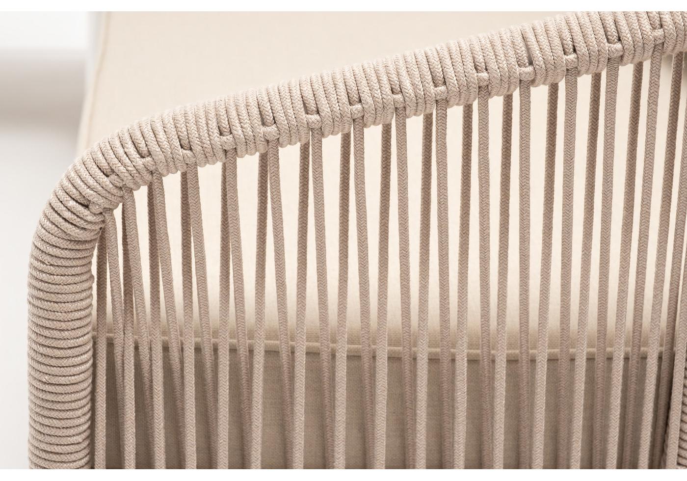 Каркас уличной мебели выполнен из износостойкого алюминия. Его дополняет бежевая ручная оплетка, изготовленная на основе эластичных синтетических лент из полиэфирных волокон высокой прочности (роупа).