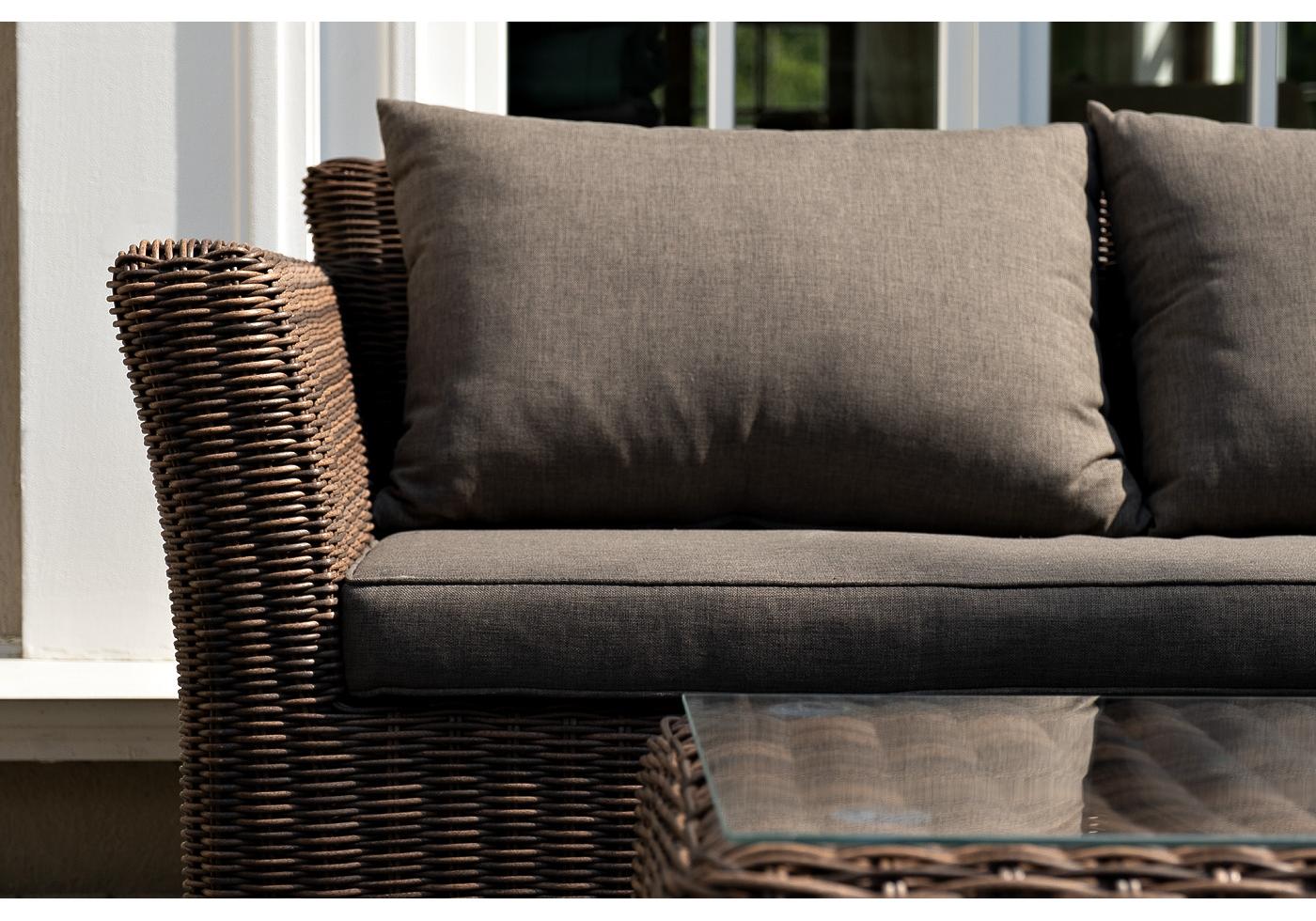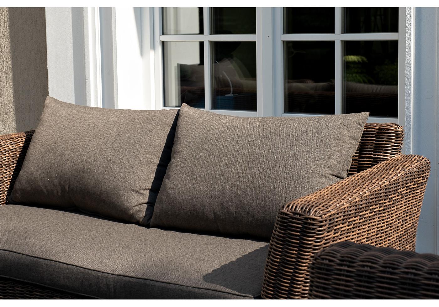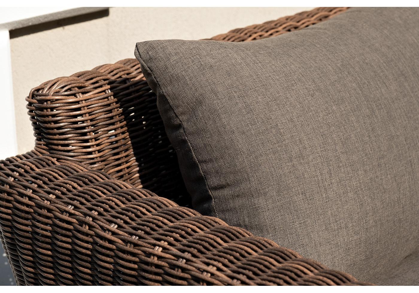 Серые подушки с влагоотталкивающей пропиткой дополн "Капучино" диван из искусственного ротанга двухместный, цвет коричневый 1шт. 1 700Х865Х815, "Капучино" журнальный столик из искусственного ротанга, цвет коричневый 1шт. 1 100Х660Х340, "Капучино" кресло из искусственного ротанга, цвет коричневый 2шт. 1 040Х865Х815,