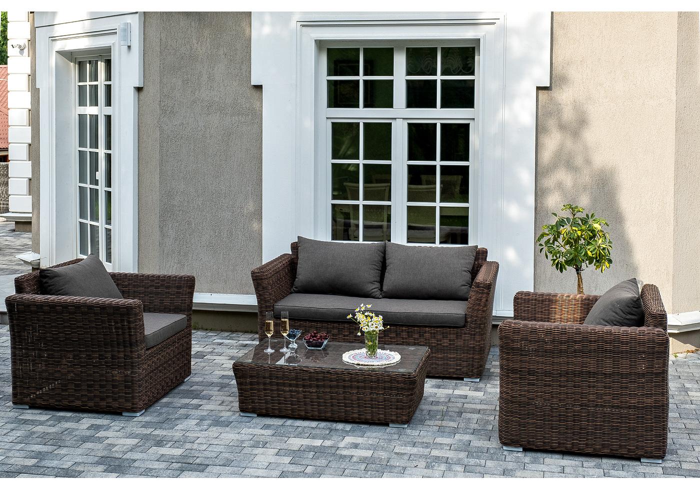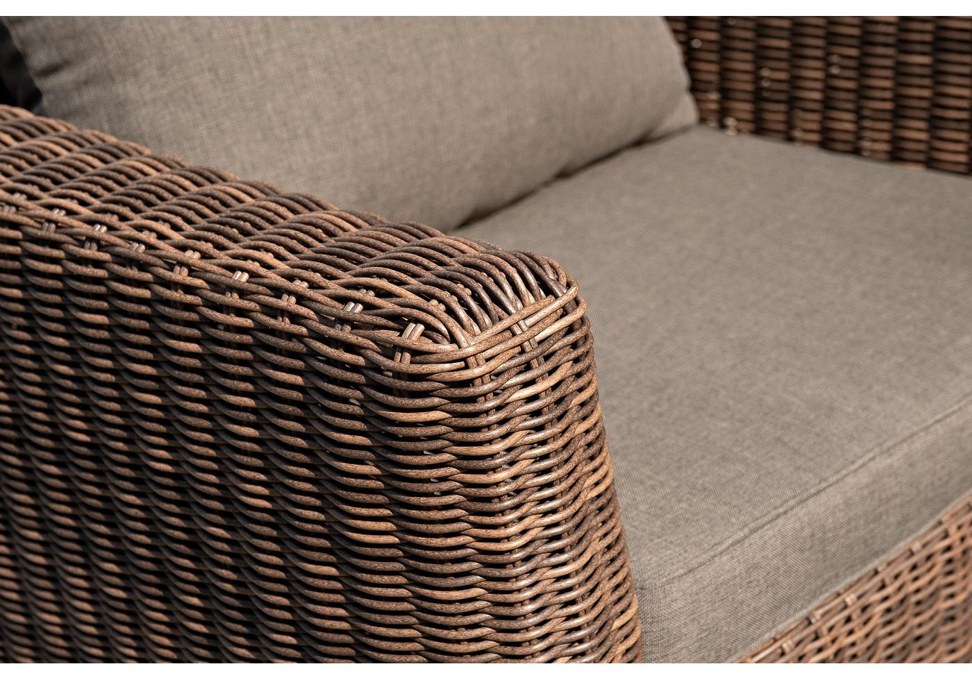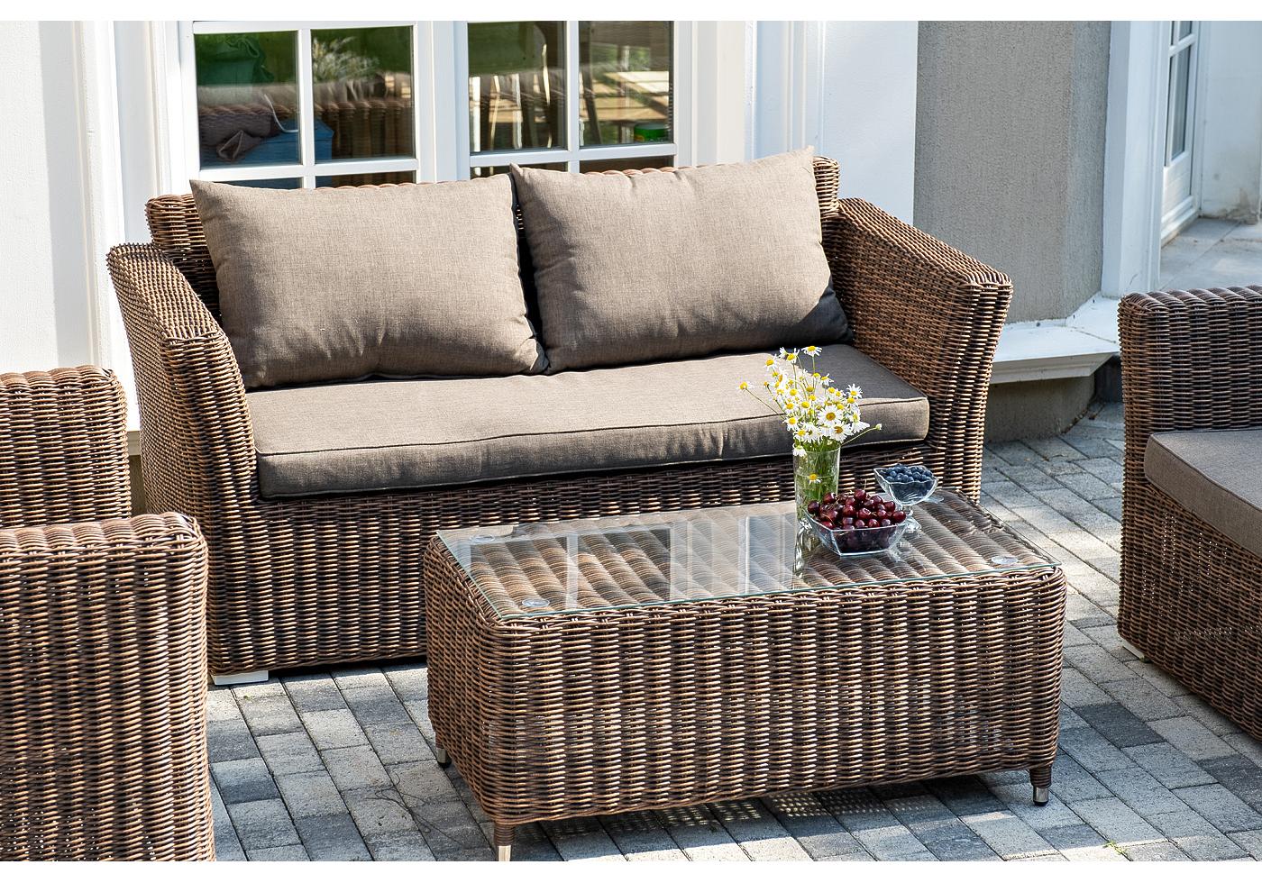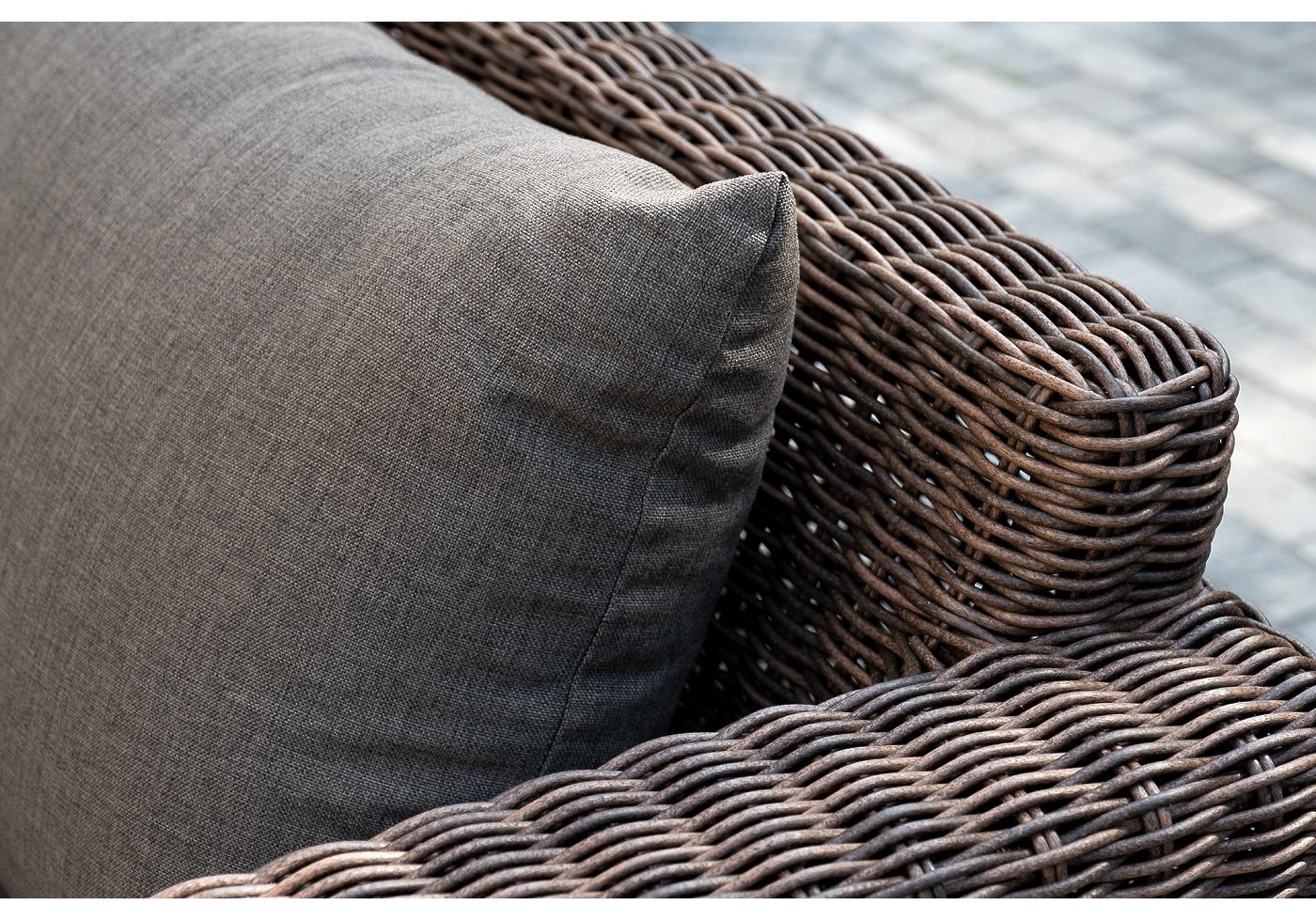 Серые подушки с влагоотталкивающей пропиткой дополн "Капучино" диван из искусственного ротанга двухместный, цвет коричневый 1шт. 1 700Х865Х815, "Капучино" журнальный столик из искусственного ротанга, цвет коричневый 1шт. 1 100Х660Х340, "Капучино" кресло из искусственного ротанга, цвет коричневый 2шт. 1 040Х865Х815,