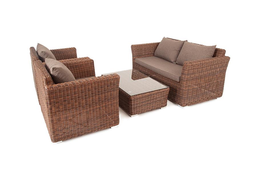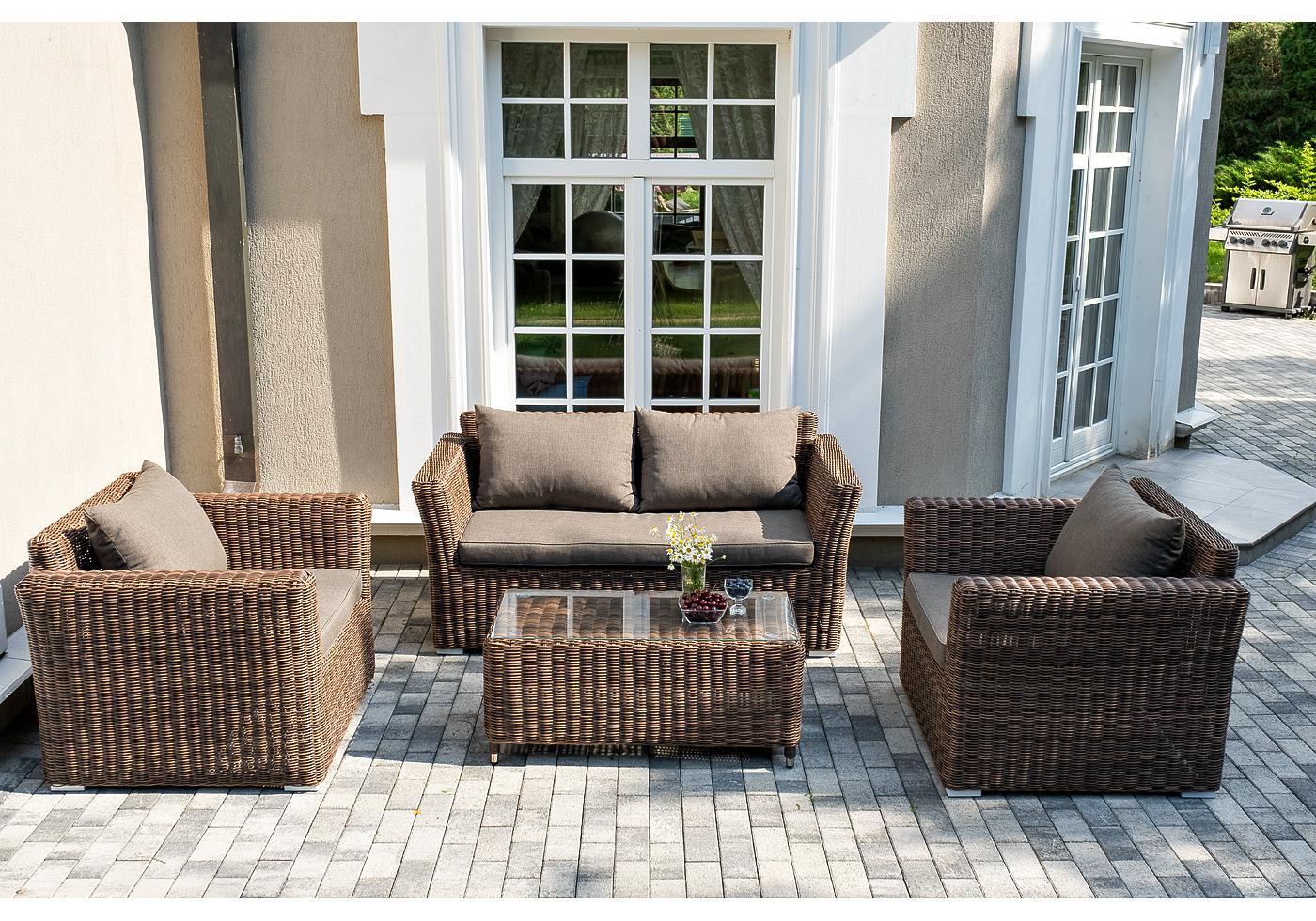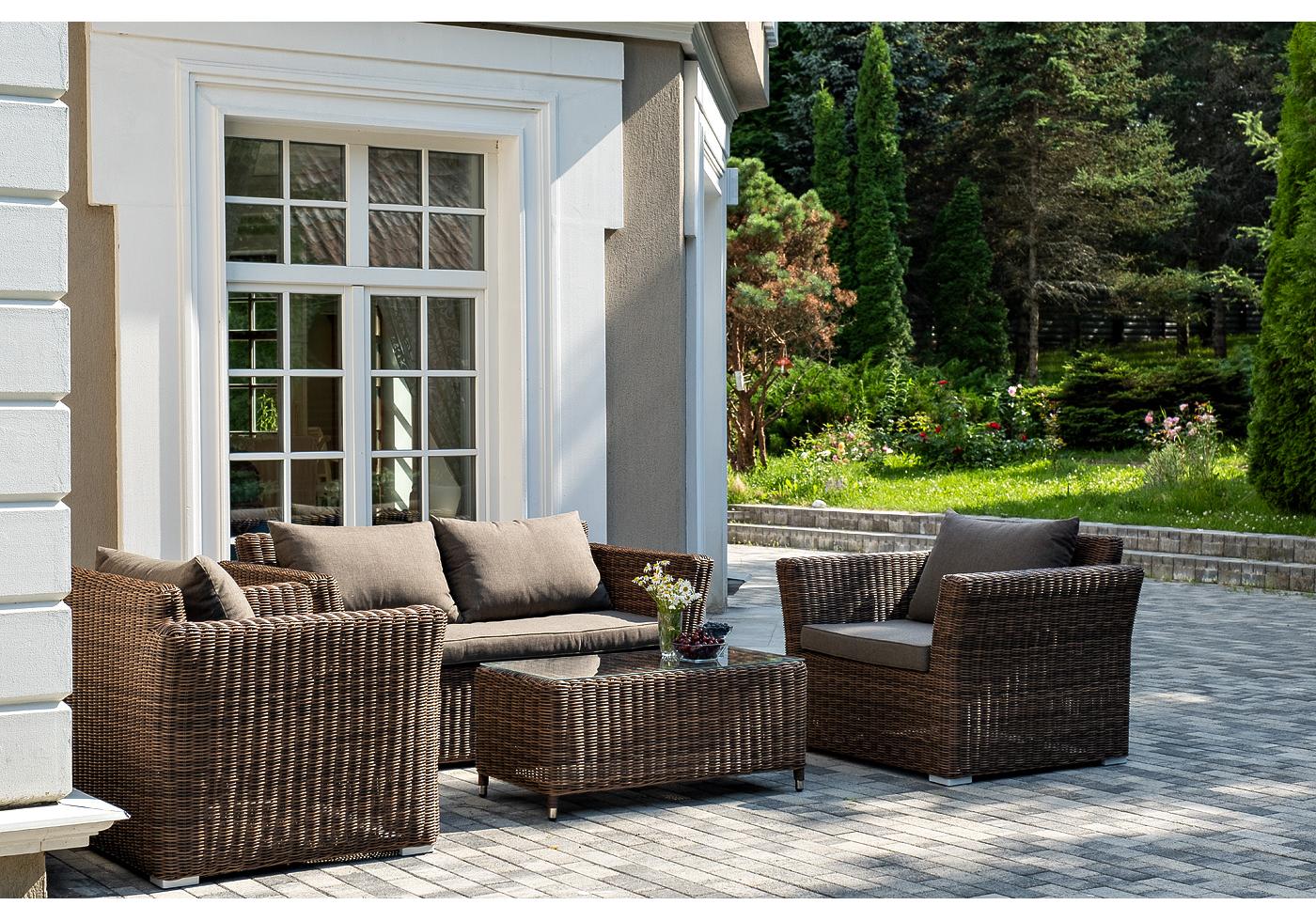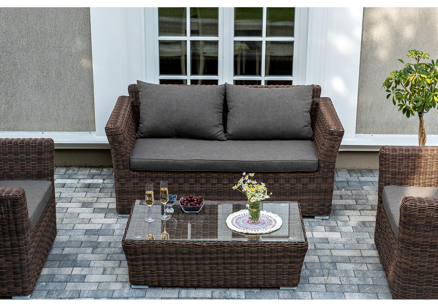 Серые подушки с влагоотталкивающей пропиткой дополн "Капучино" диван из искусственного ротанга двухместный, цвет коричневый 1шт. 1 700Х865Х815, "Капучино" журнальный столик из искусственного ротанга, цвет коричневый 1шт. 1 100Х660Х340, "Капучино" кресло из искусственного ротанга, цвет коричневый 2шт. 1 040Х865Х815,