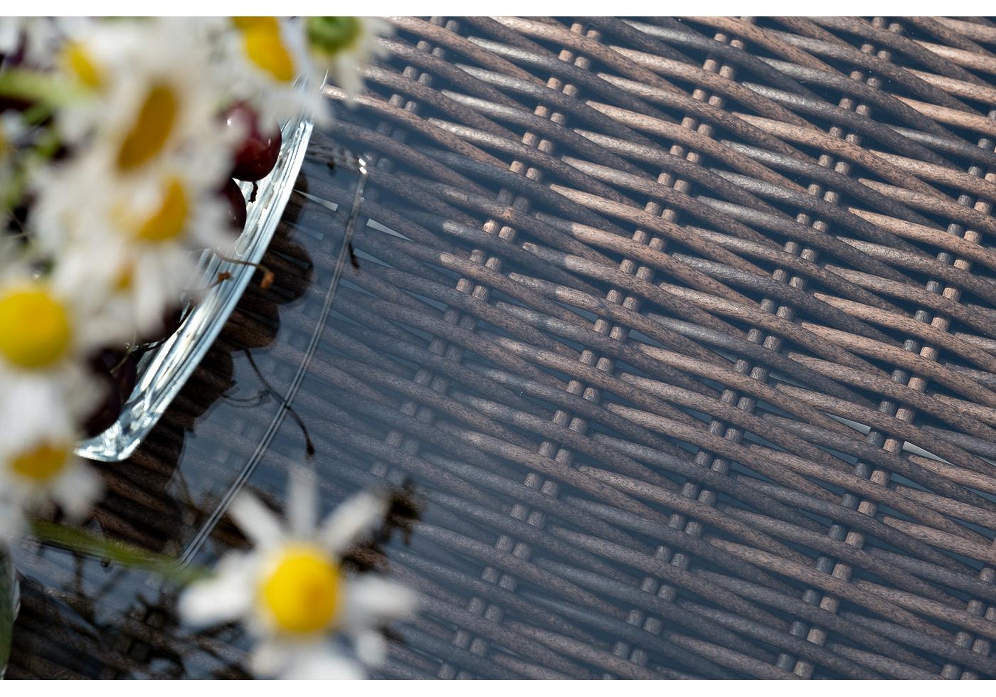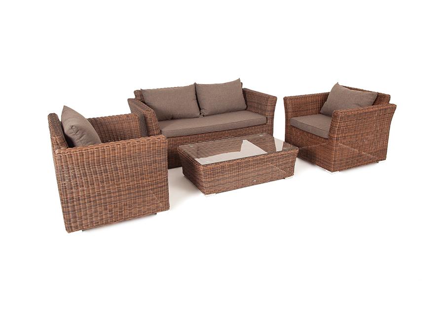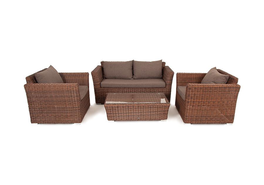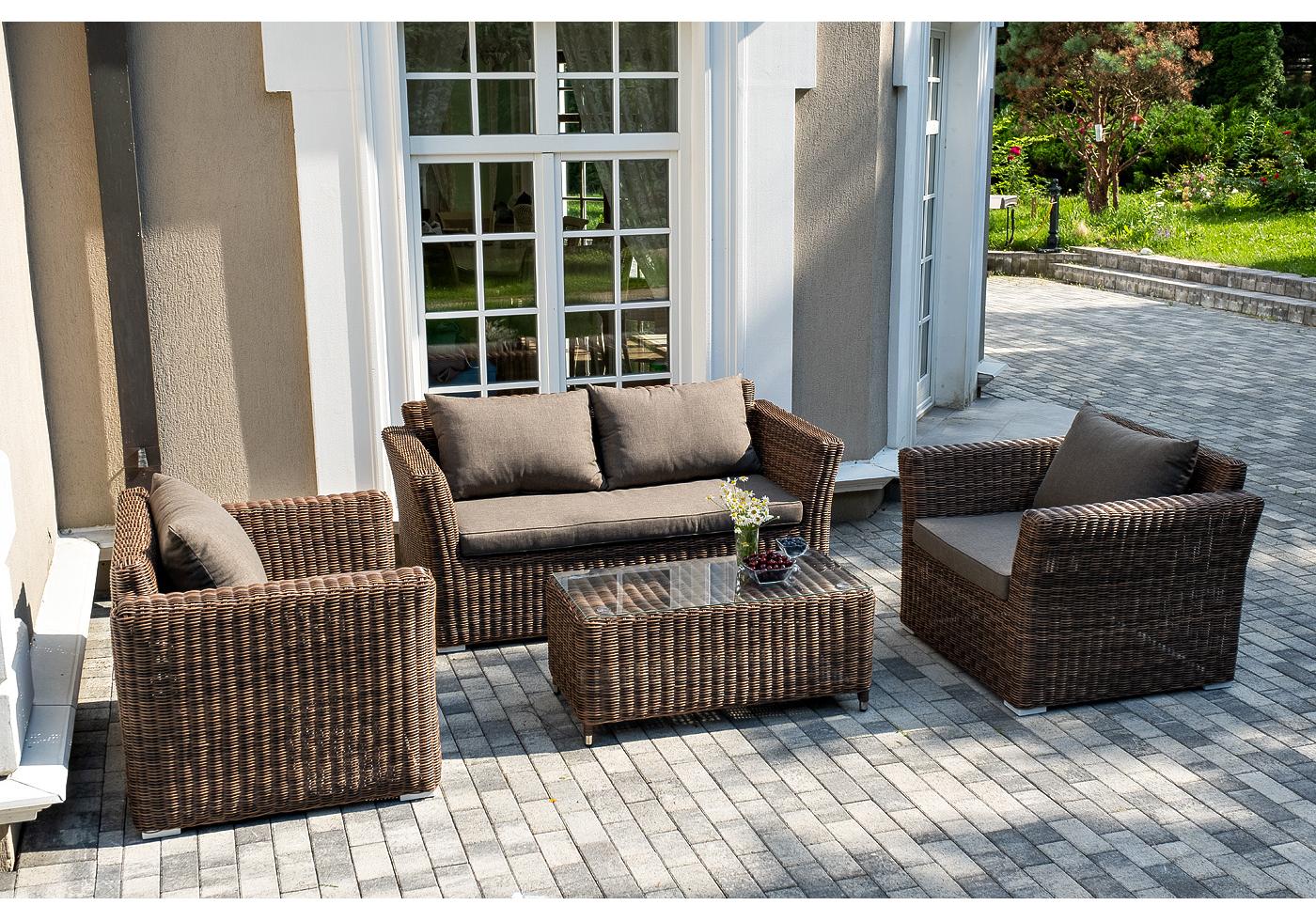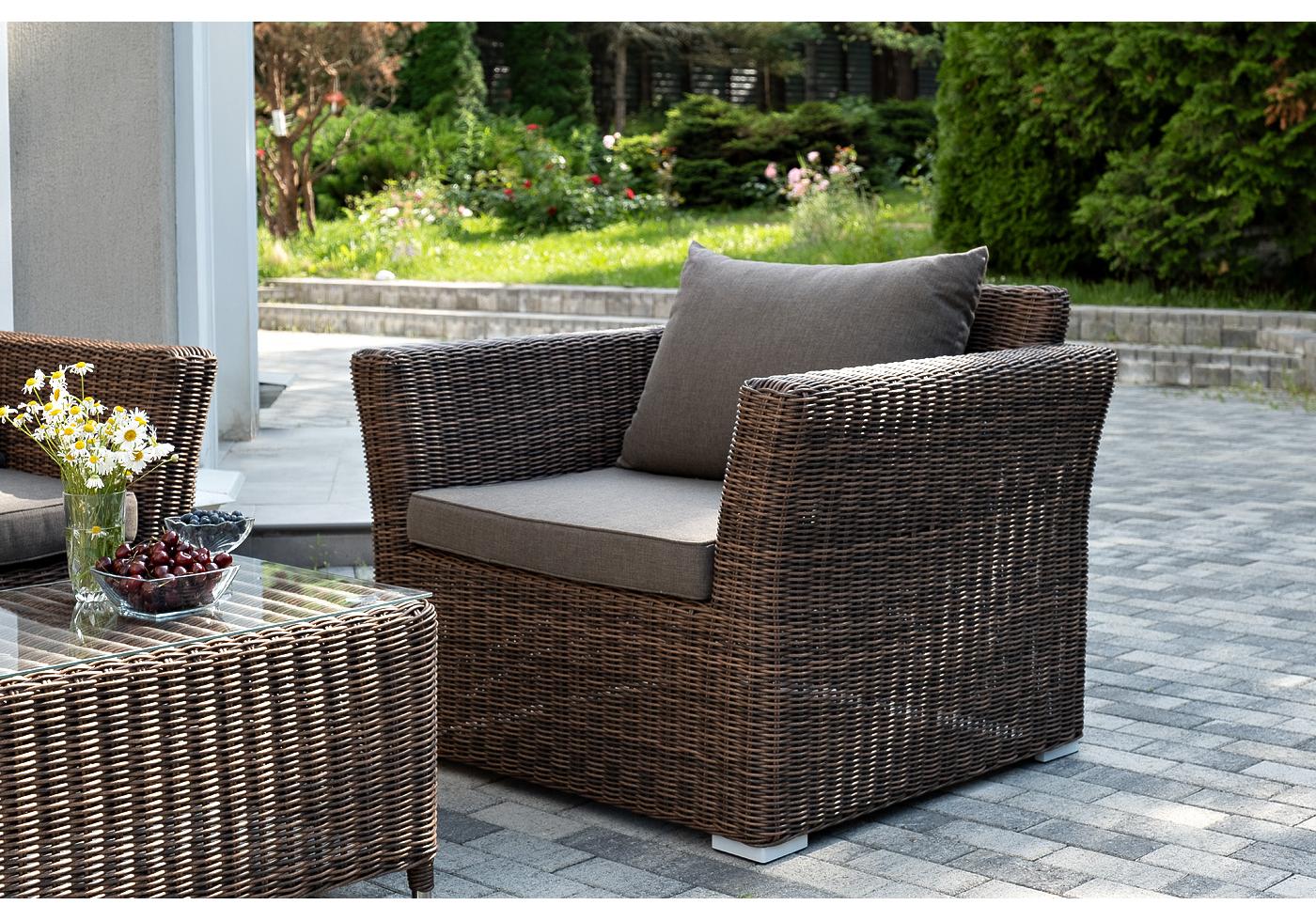 Мебель изготовлена из алюминиевого каркаса и круглого искусственного ротанга, которым вручную оплетается корпус. Цвет комплекта – коричневый.