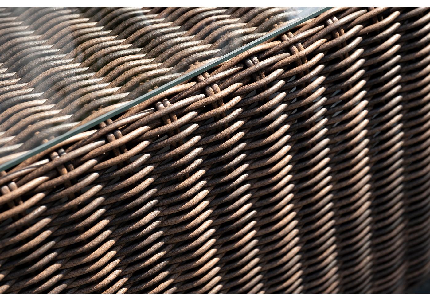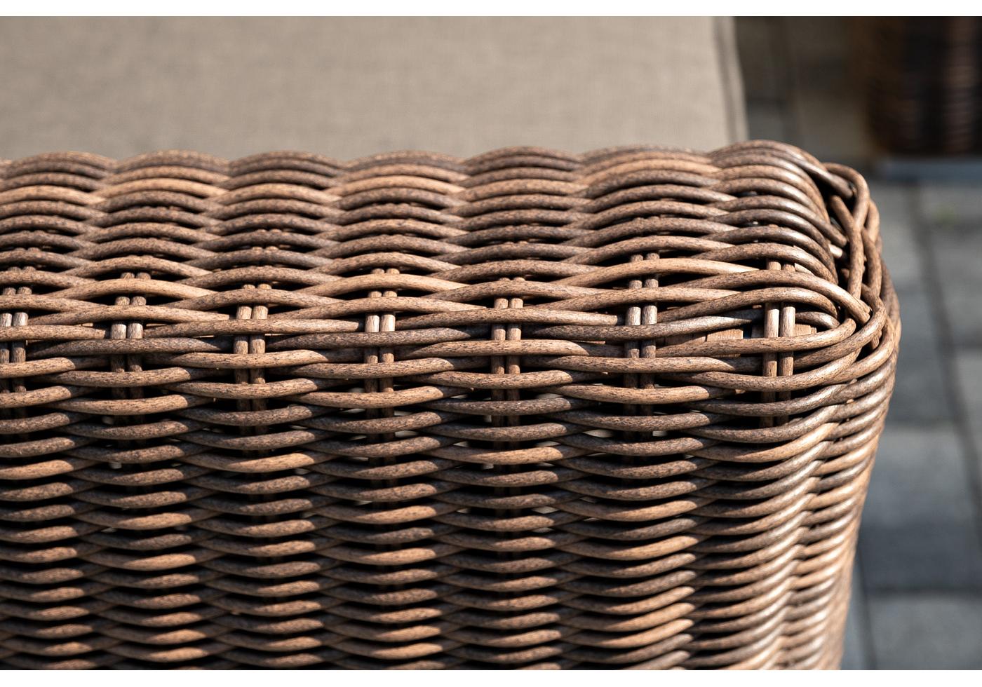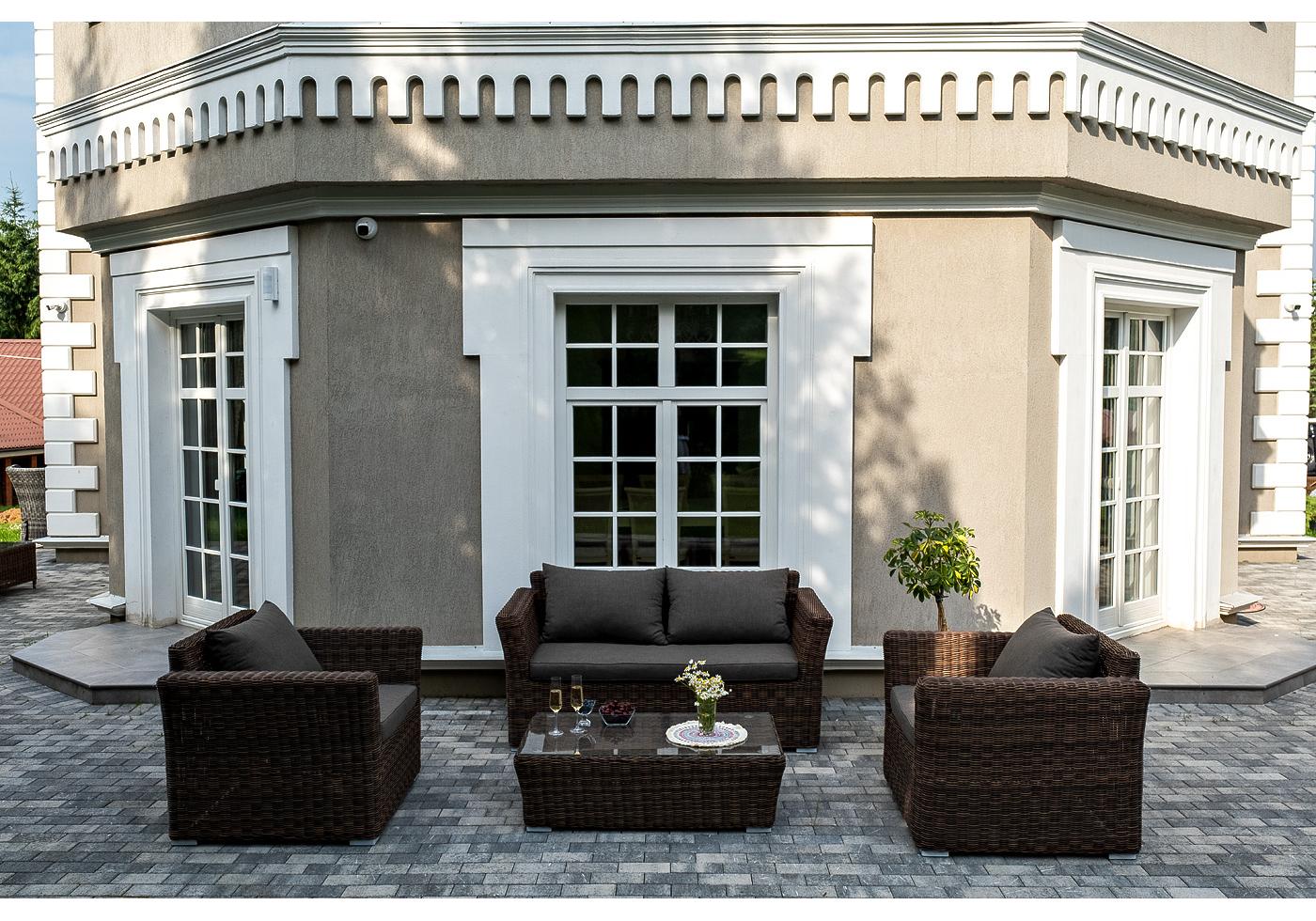 Мебель изготовлена из алюминиевого каркаса и круглого искусственного ротанга, которым вручную оплетается корпус. Цвет комплекта – коричневый.