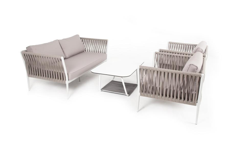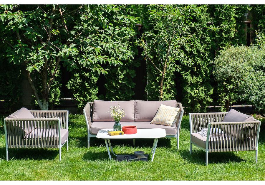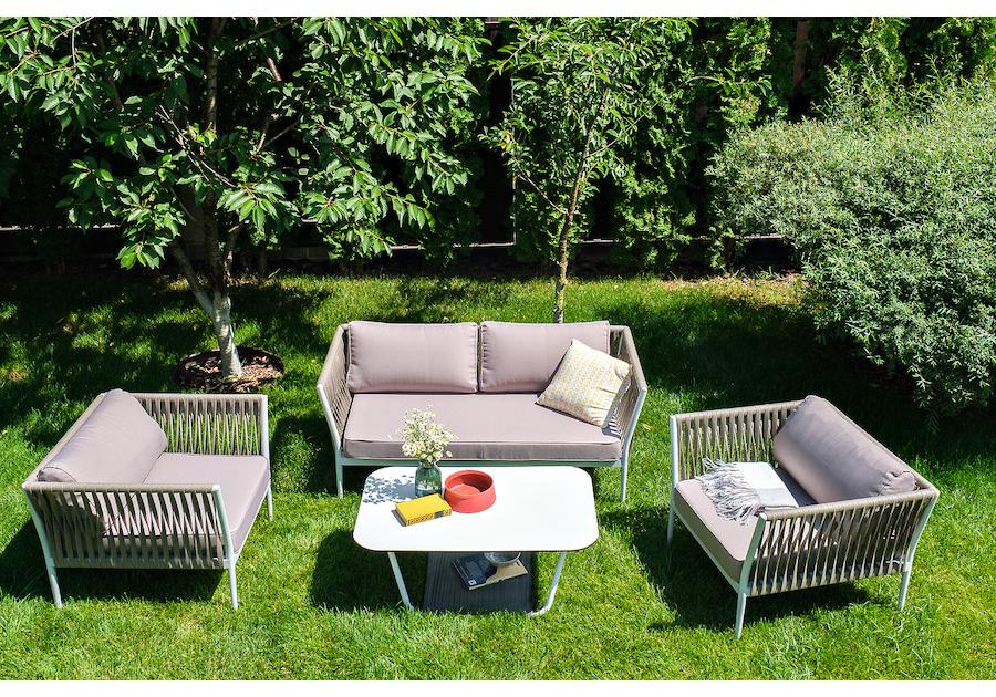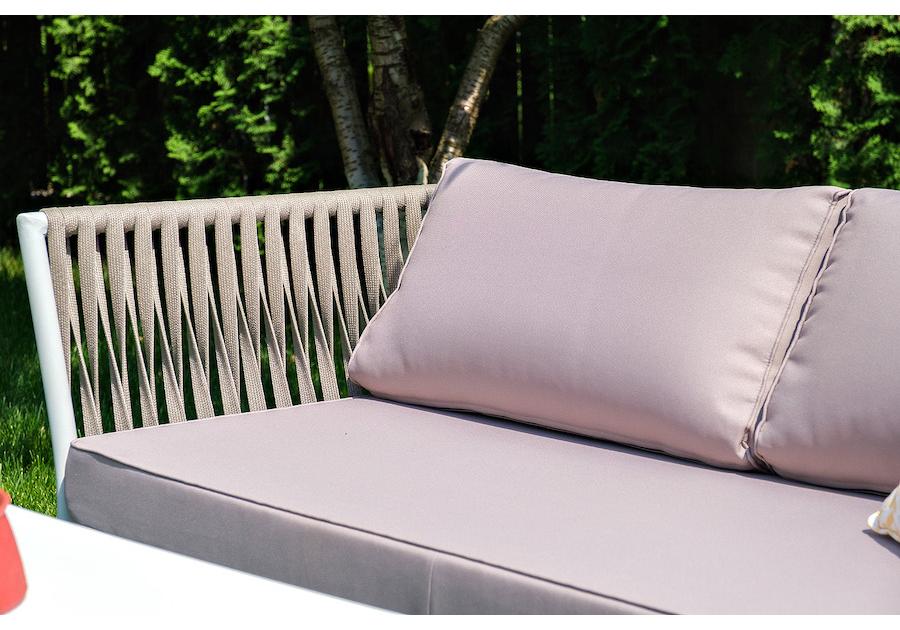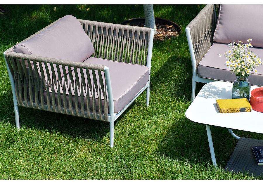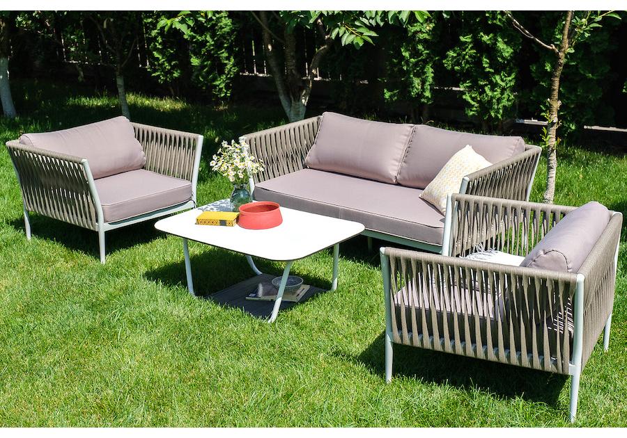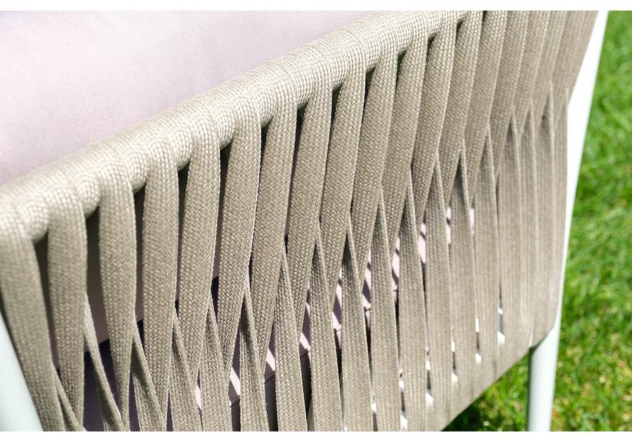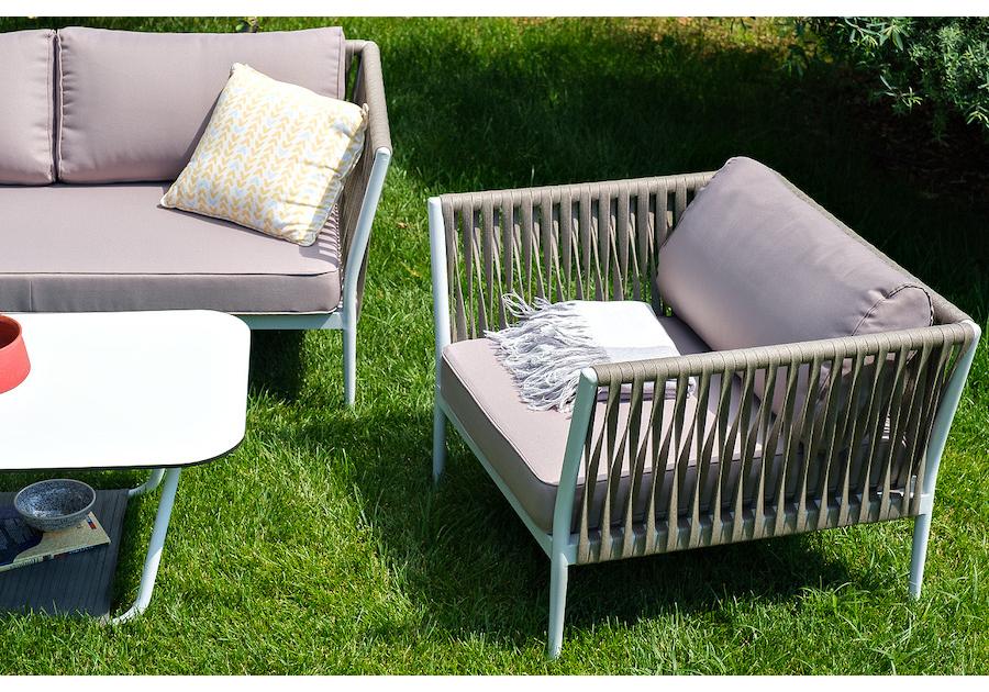 Диван и кресла изготовлены их алюминиевого прочного каркаса, оплетенного ручным способом роупом серо-коричневого цвета. Это эластичные ленты из полиэфирных волокон высокого качества.