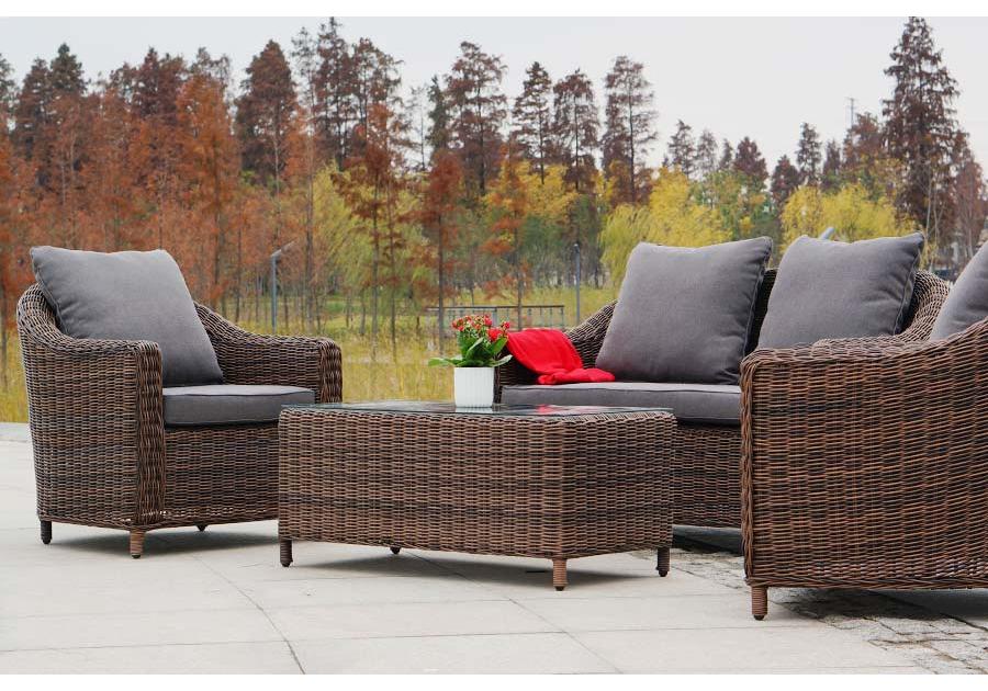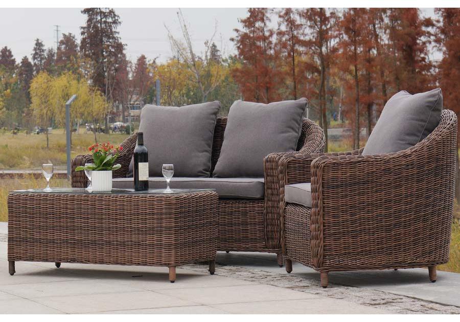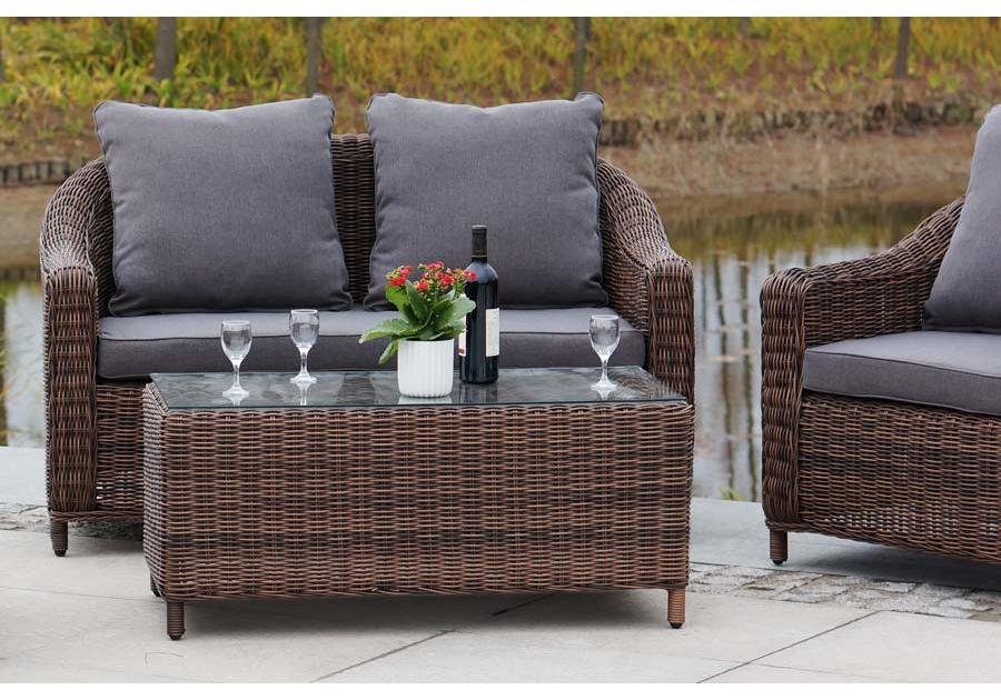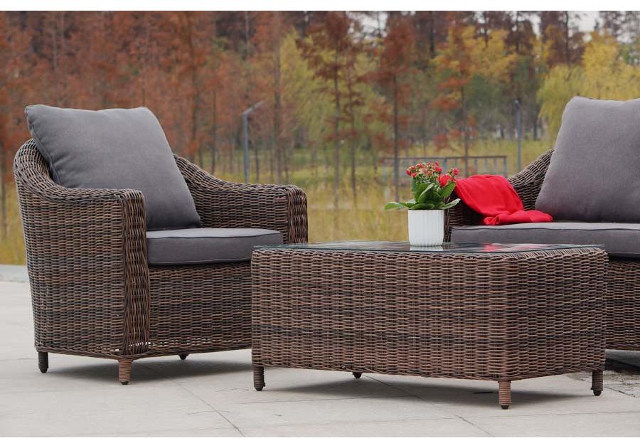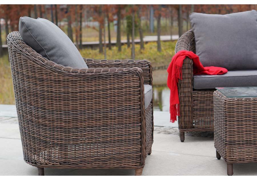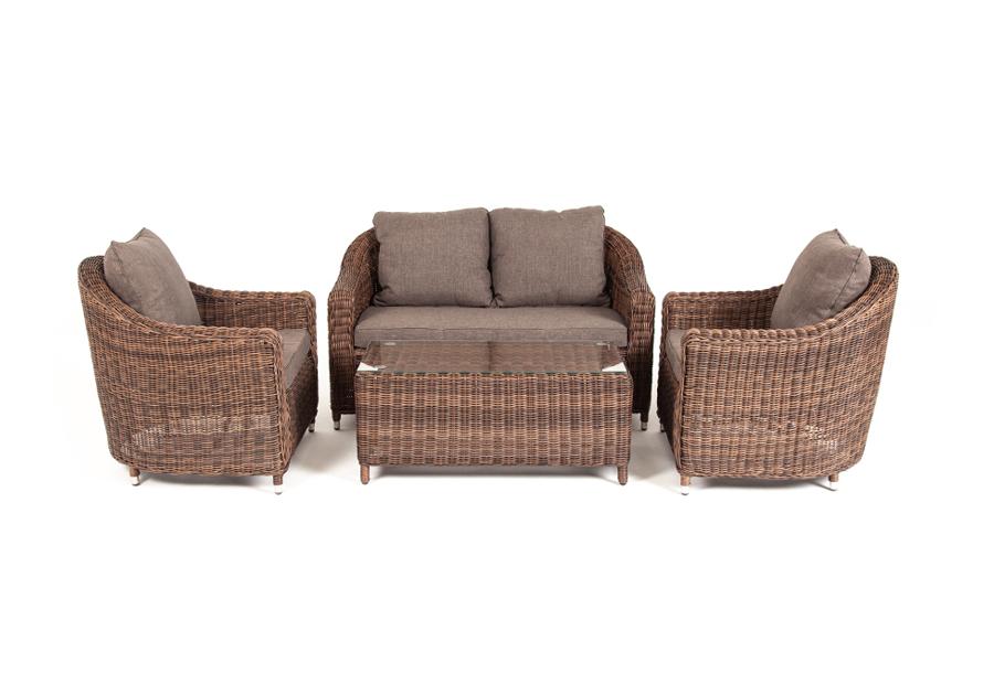 Садовая мебель выполнена из алюминиевого каркаса, выдерживающего большие нагрузки, и круглого искусственного ротанга. Каркас оплетен с помощью ручного метода и представлен в коричневом цвете.
