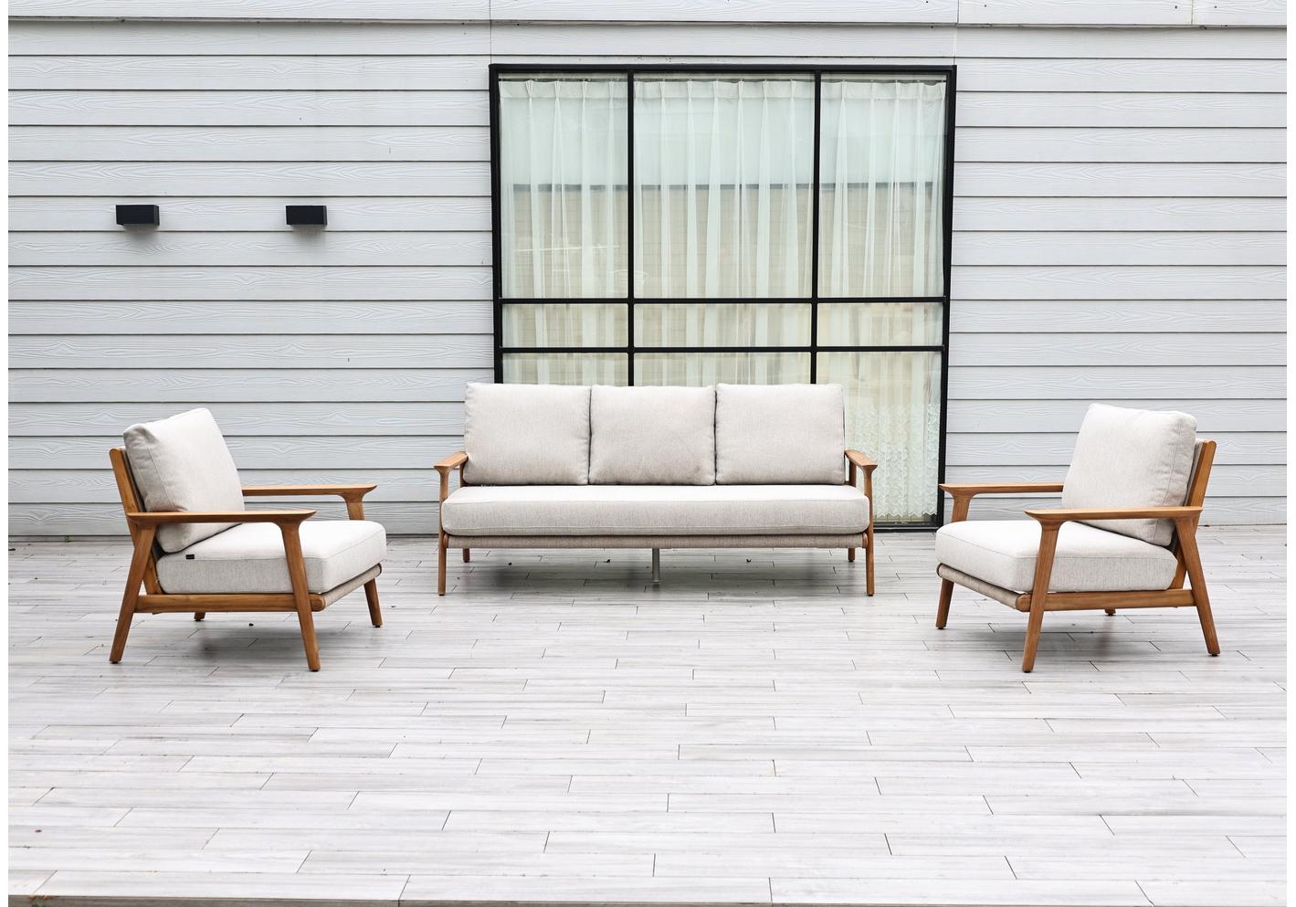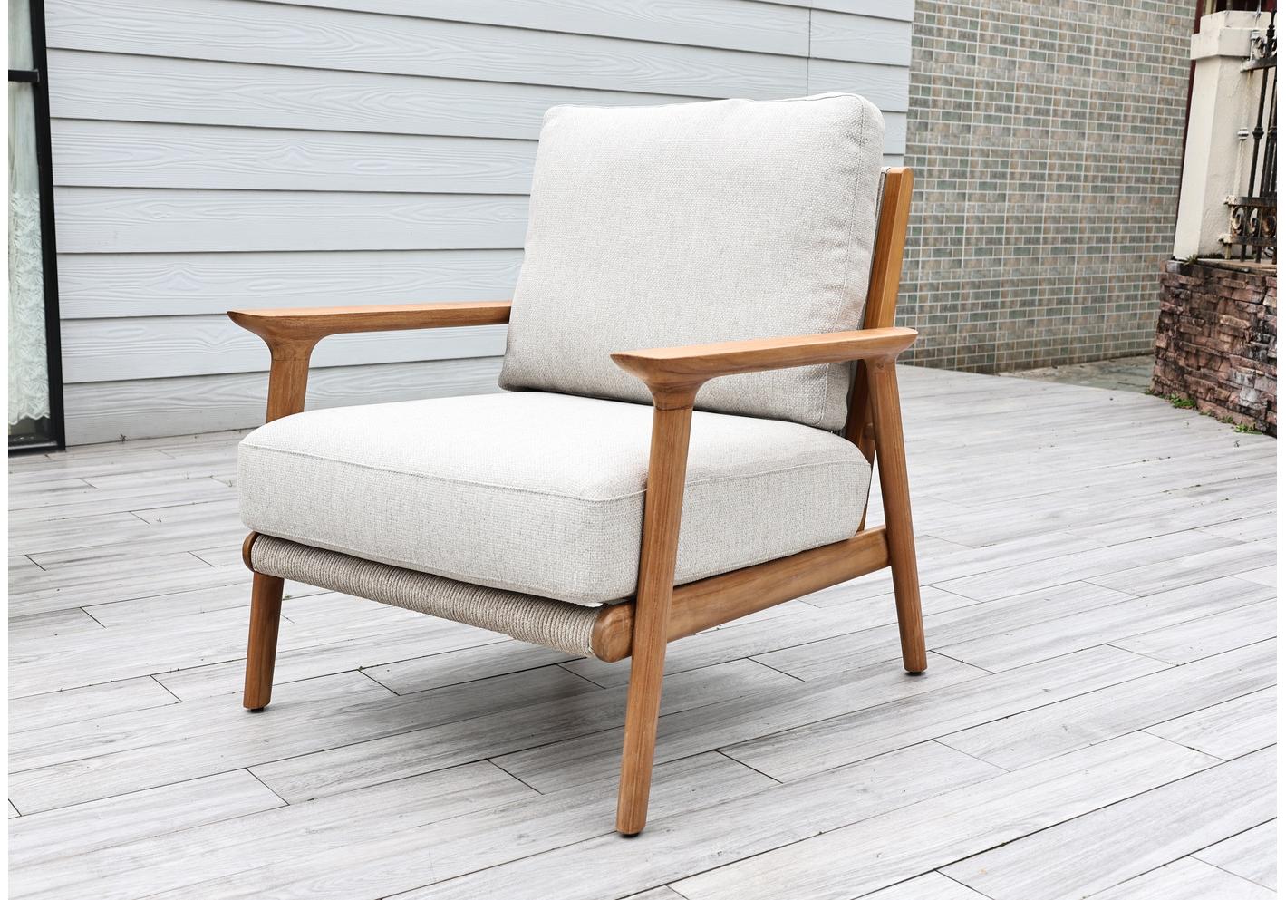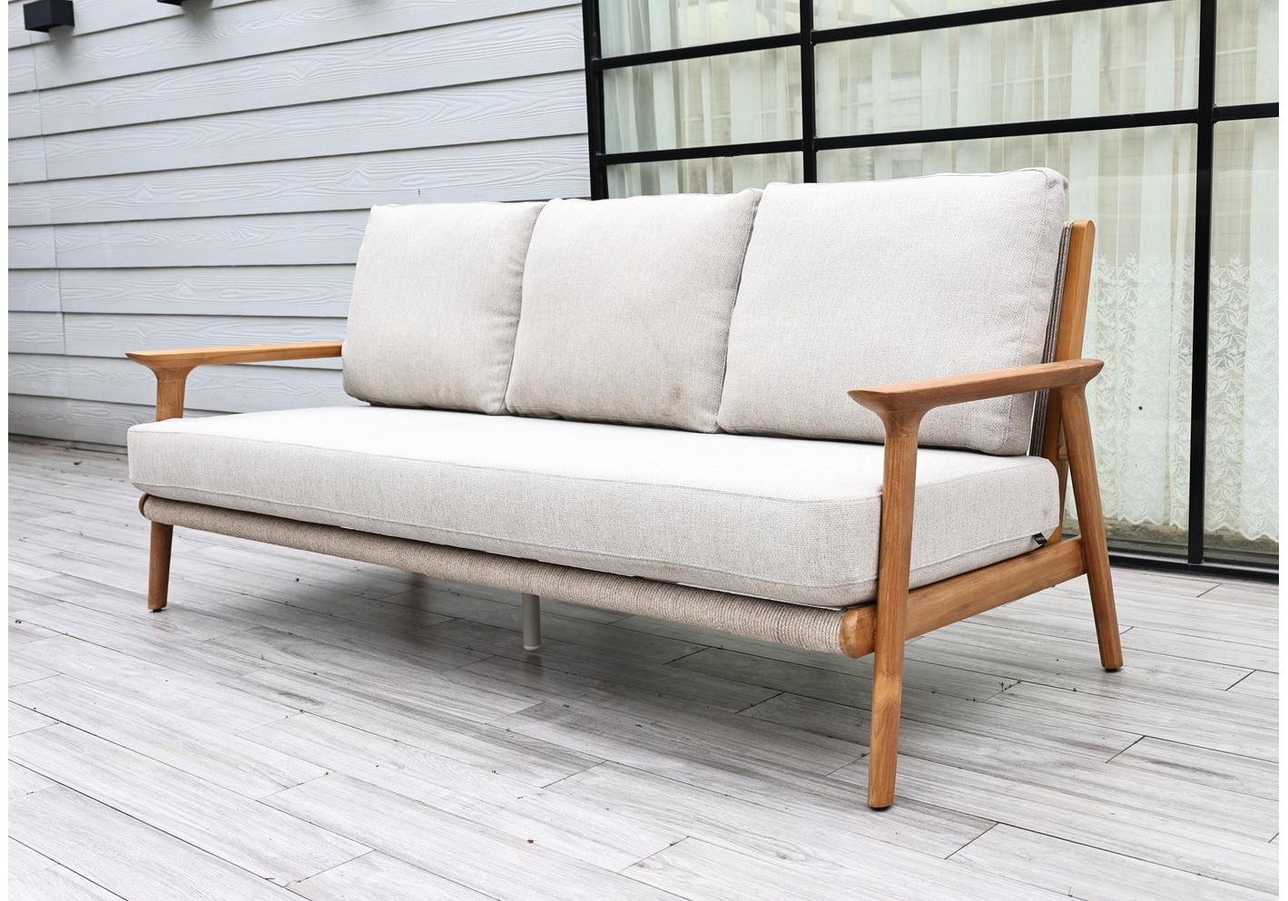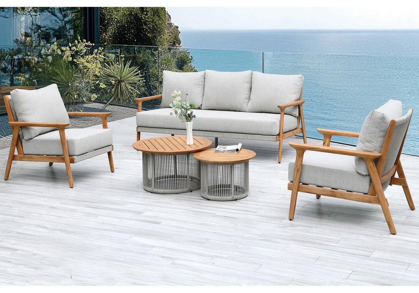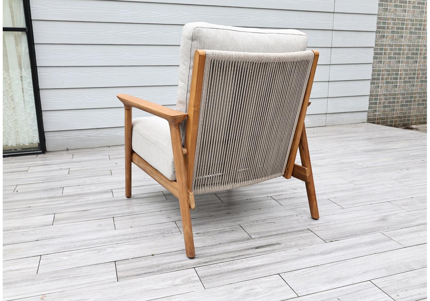 Каркас выполнен из тика — благородной древесины, известной своей прочностью, устойчивостью к внешним воздействиям и изысканной текстурой. Тёплый древесный оттенок подчёркивает природную эстетику мебели.
