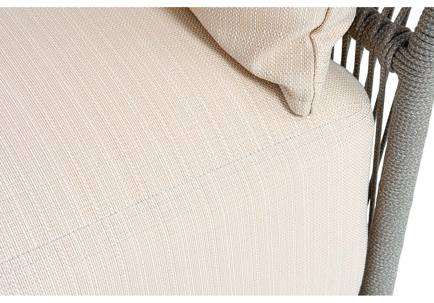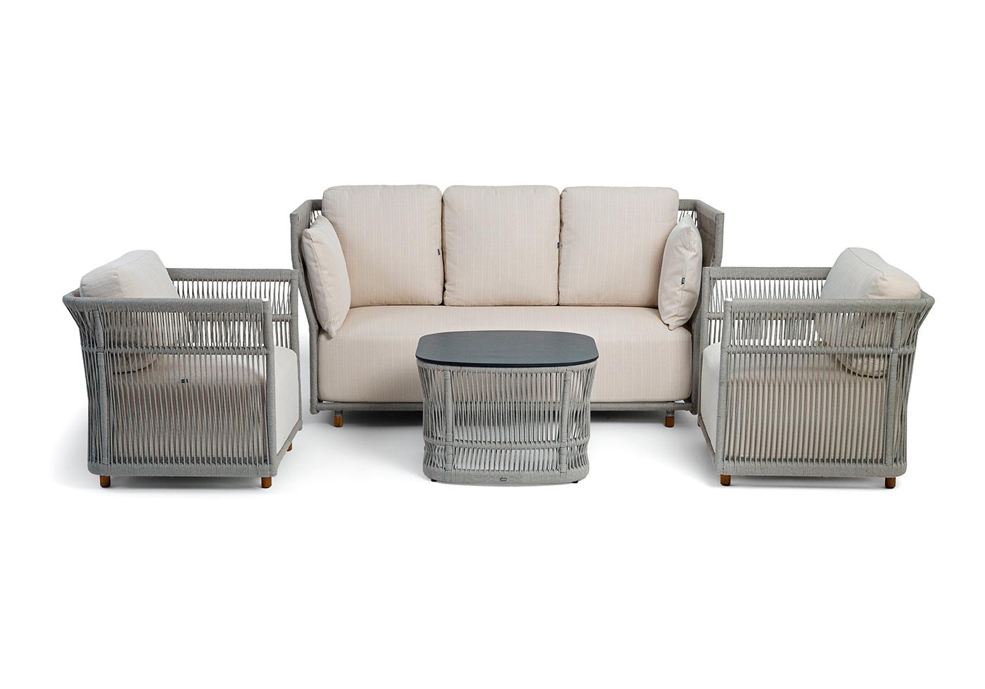 Каркас уличной мебели выполнен из износостойкого алюминия. Его дополняет ручная оплетка - серый меланж, изготовленная на основе эластичных синтетических лент из полиэфирных волокон высокой прочности (роупа). На ножках дивана и кресел идут дубовые наконечники (заглушки). "Лугано" диван 3-местный плетеный из роупа, каркас алюминий светло-серый (RAL7035) муар, роуп серый меланж круглый, ткань Mossle светло-бежевая 1шт. 2 020Х820Х990, "Лугано" кресло плетеное из роупа, каркас алюминий светло-серый (RAL7035) муар, роуп серый меланж круглый, ткань Mossle светло-бежевая 2шт. 980Х820Х770, "Лугано" журнальный стол 76х76 H55 см из HPL, цвет "серый гранит", роуп серый меланж 1шт. 760Х760Х550,