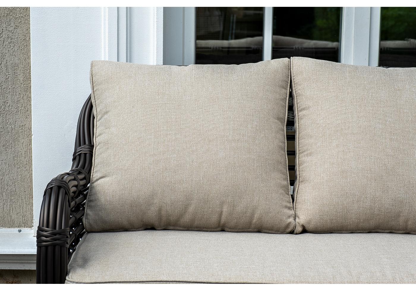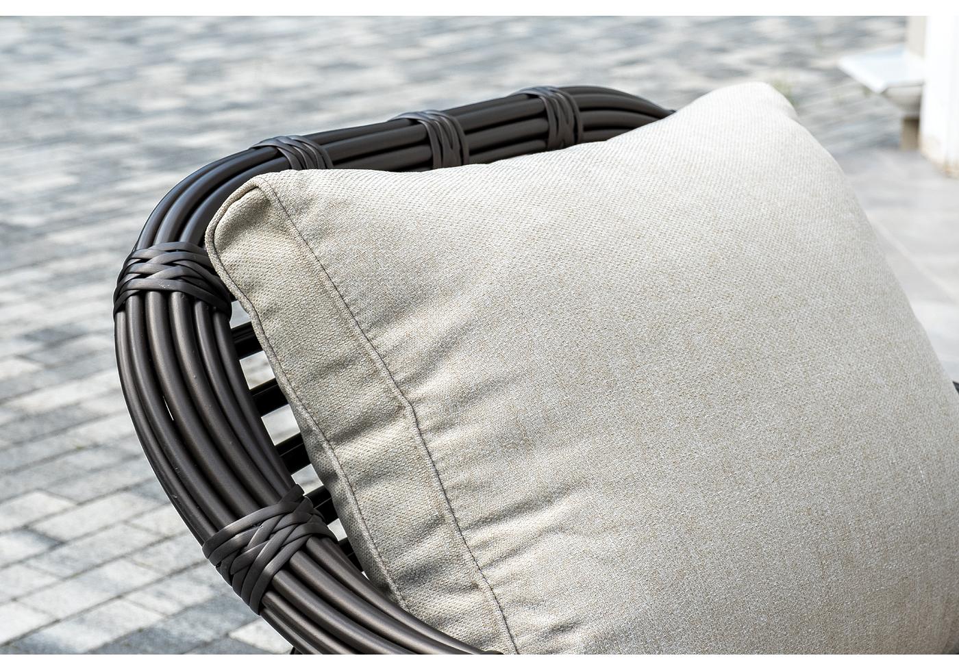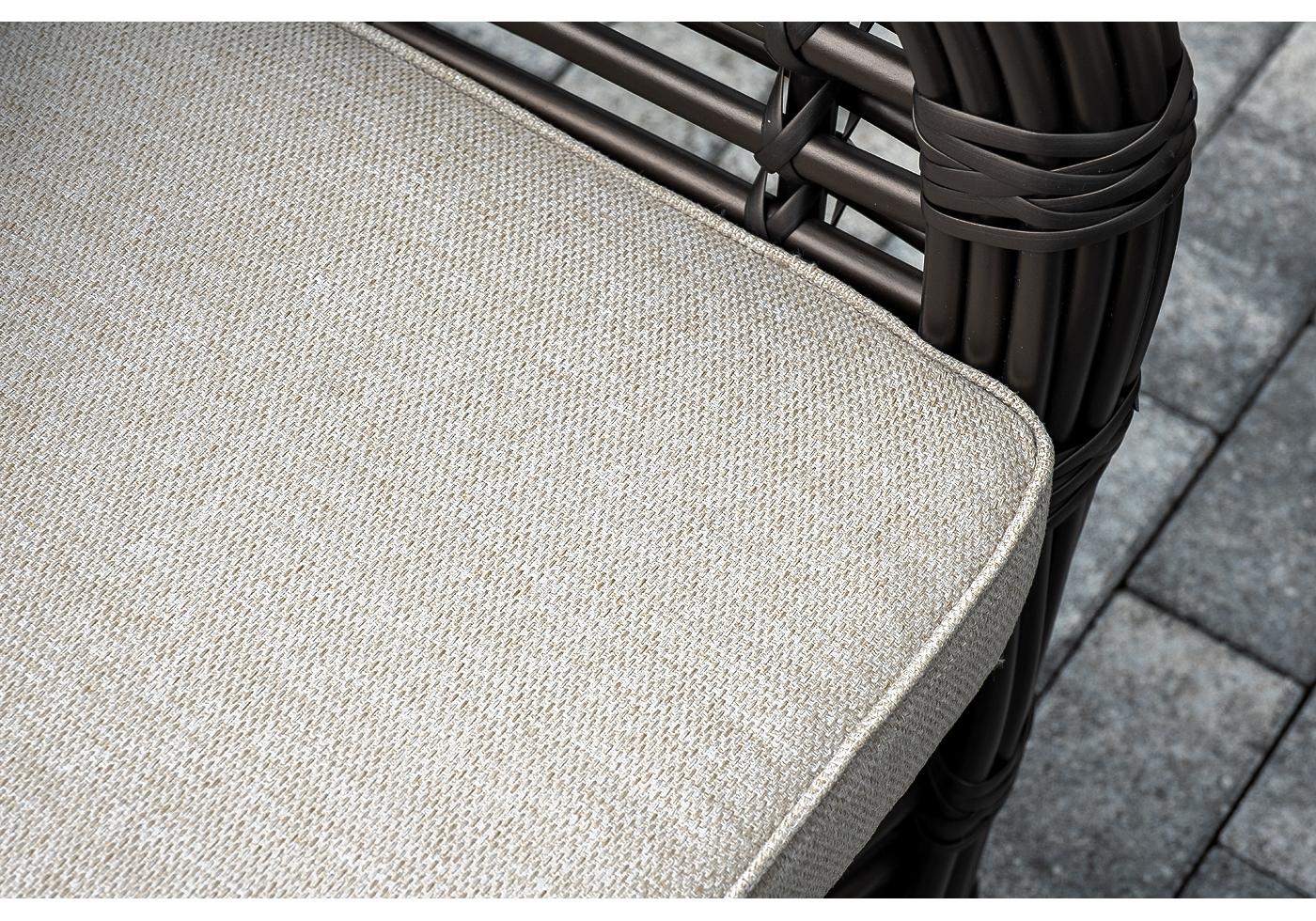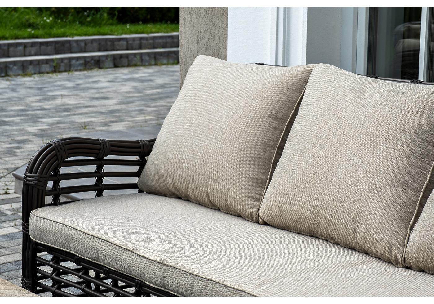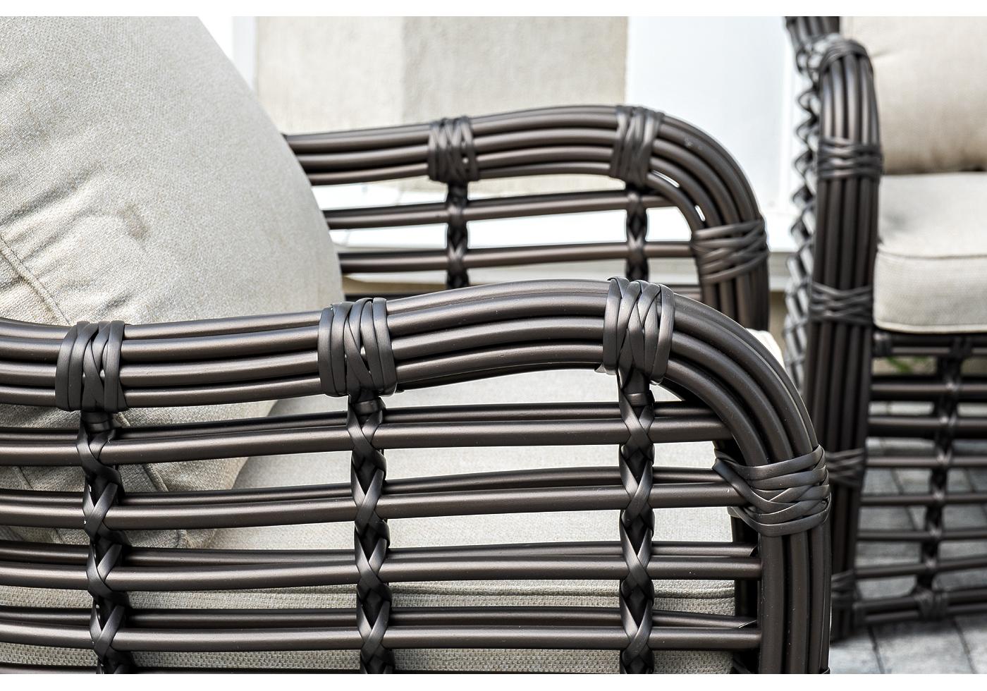 Плетеная мебель дополнена удобными подушками в бежевых чехлах. При их изготовлении используют полиэстер, плотность – 300гр/м2. Он обрабатывается влагоотталкивающей пропиткой для повышения защитных свойств материала.