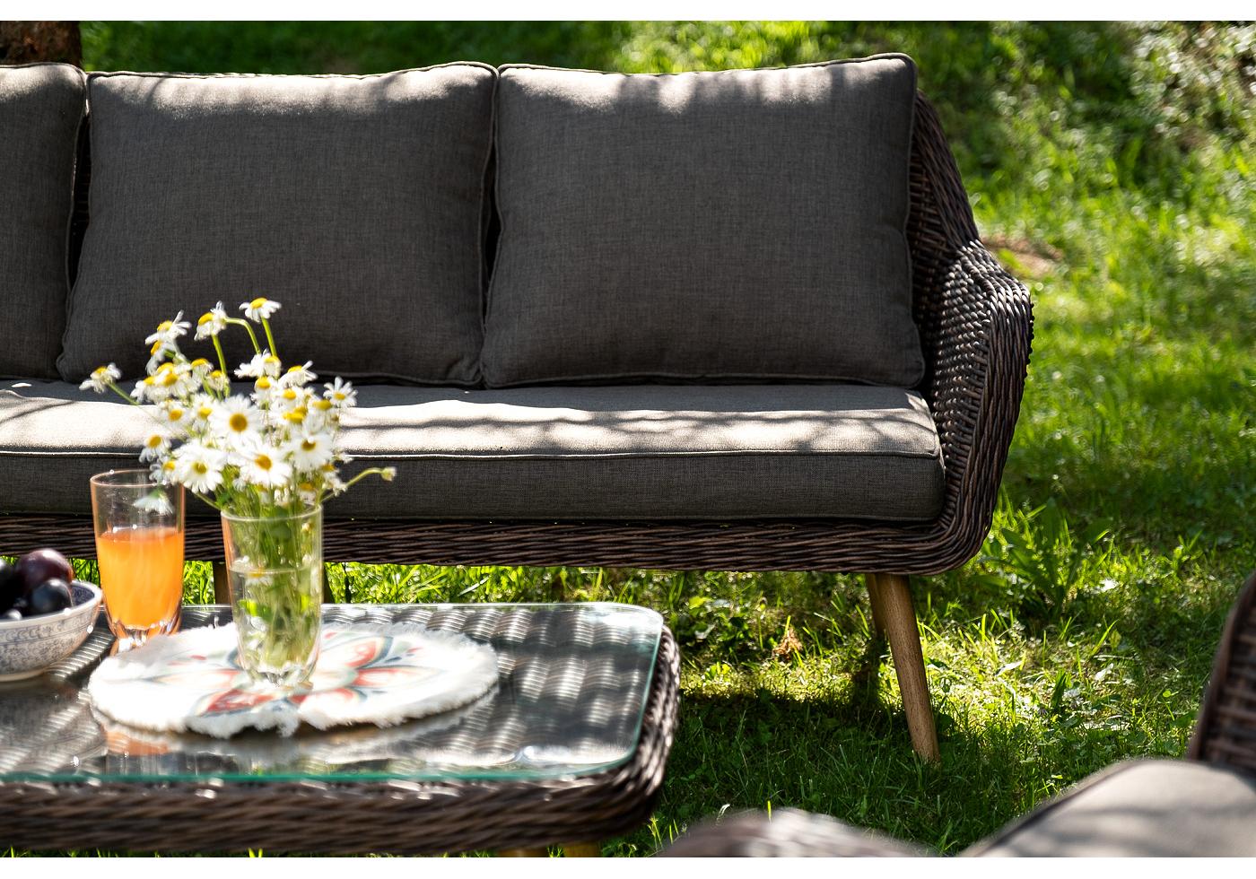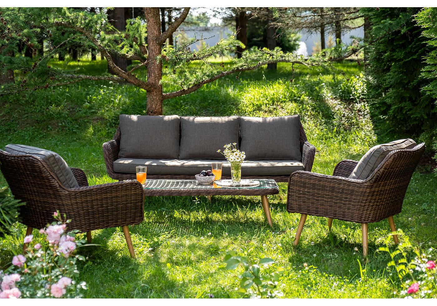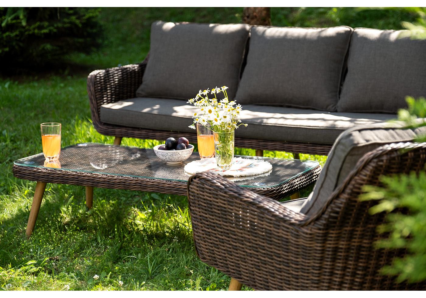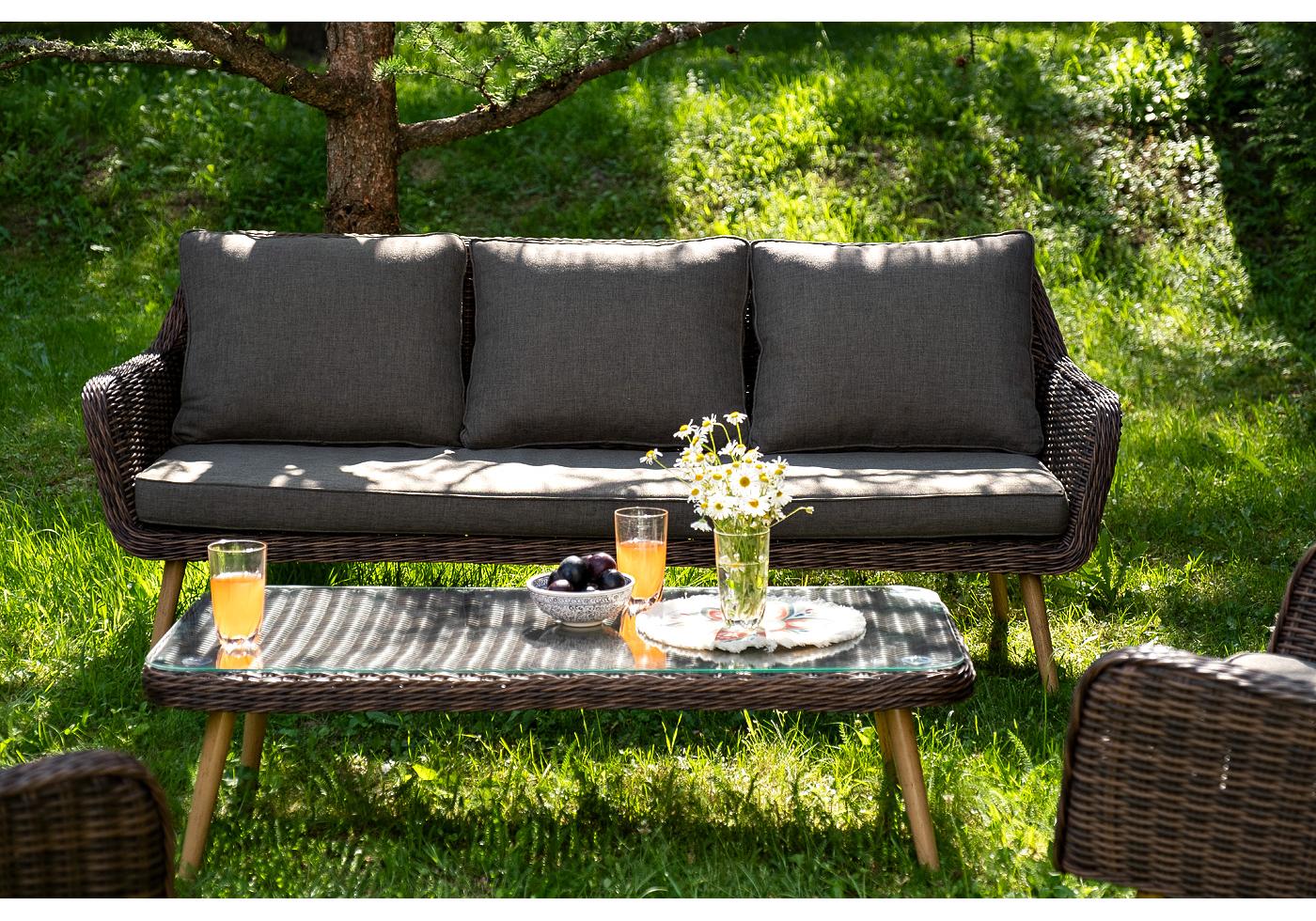 Диван и кресла оснащены подушками со съёмными чехлами серого цвета. При изготовлении чехлов исп "Прованс" диван из искусственного ротанга трехместный, цвет коричневый 1шт. 1 900Х800Х770, "Прованс" кресло из искусственного ротанга, цвет коричневый 2шт. 810Х800Х770, "Прованс" столик журнальный из ротанга, цвет коричневый 1шт. 1 200Х580Х330,
