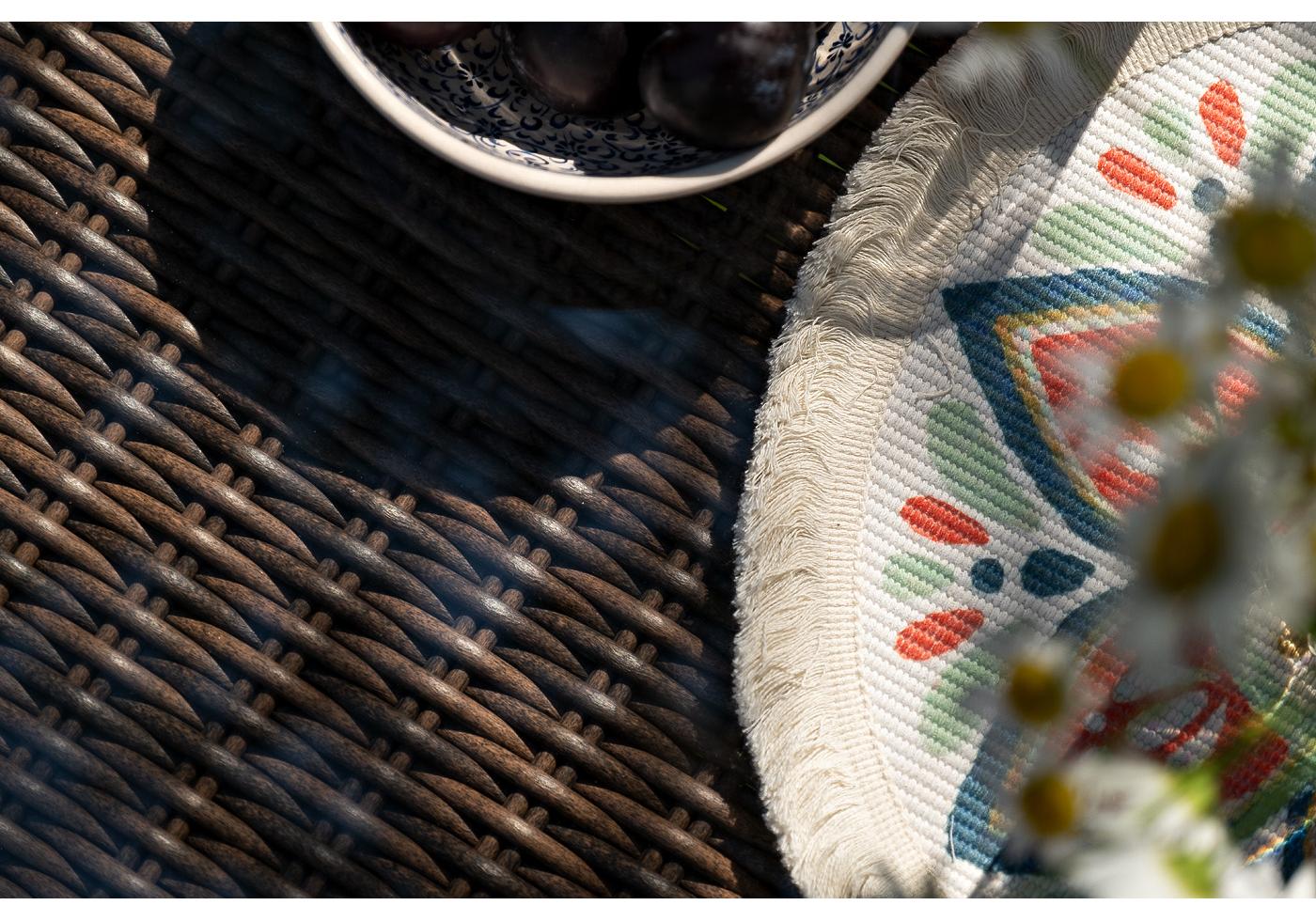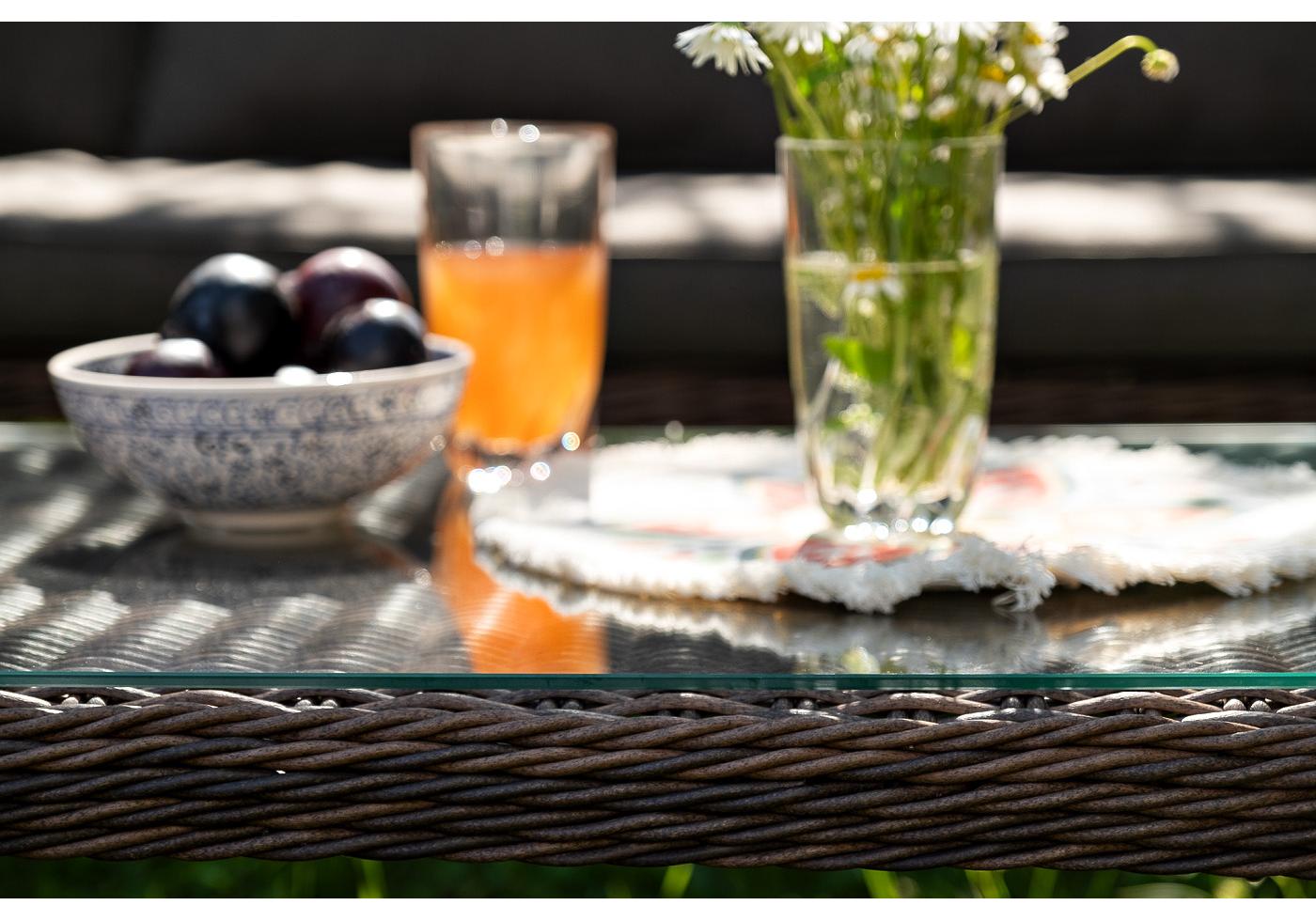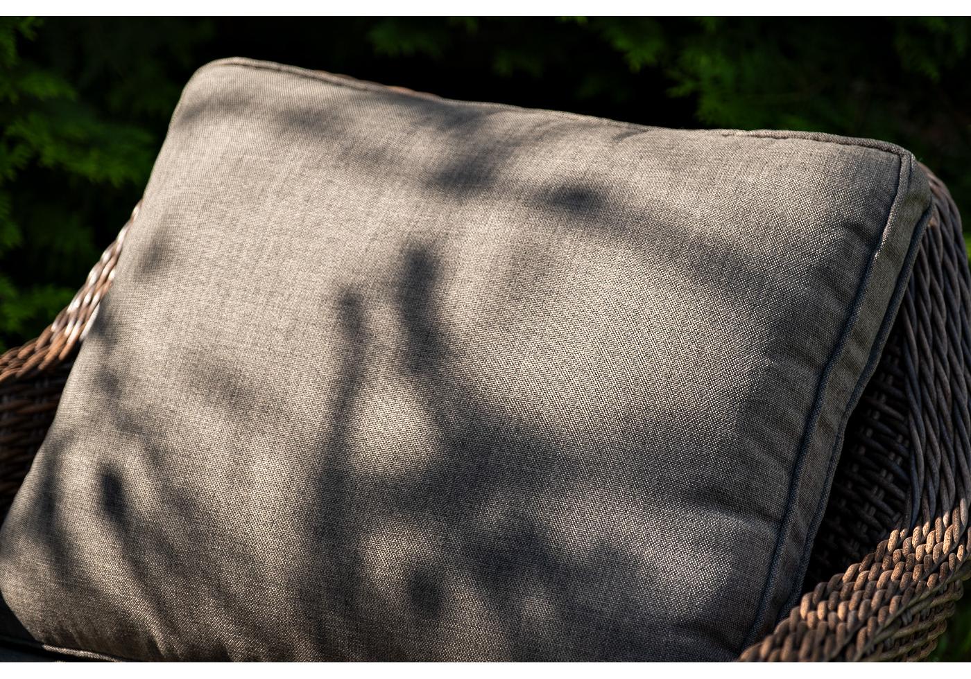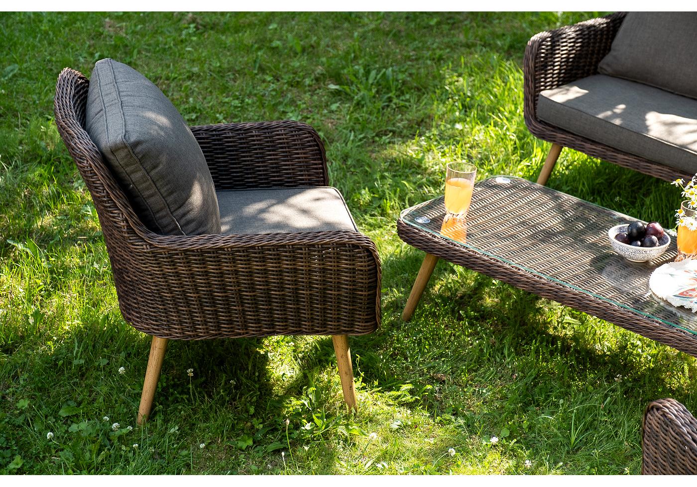 Каркас всей группы выполнен из прочного алюминия, который оплетен круглым искусственным ротангом. Цвет – коричневый.