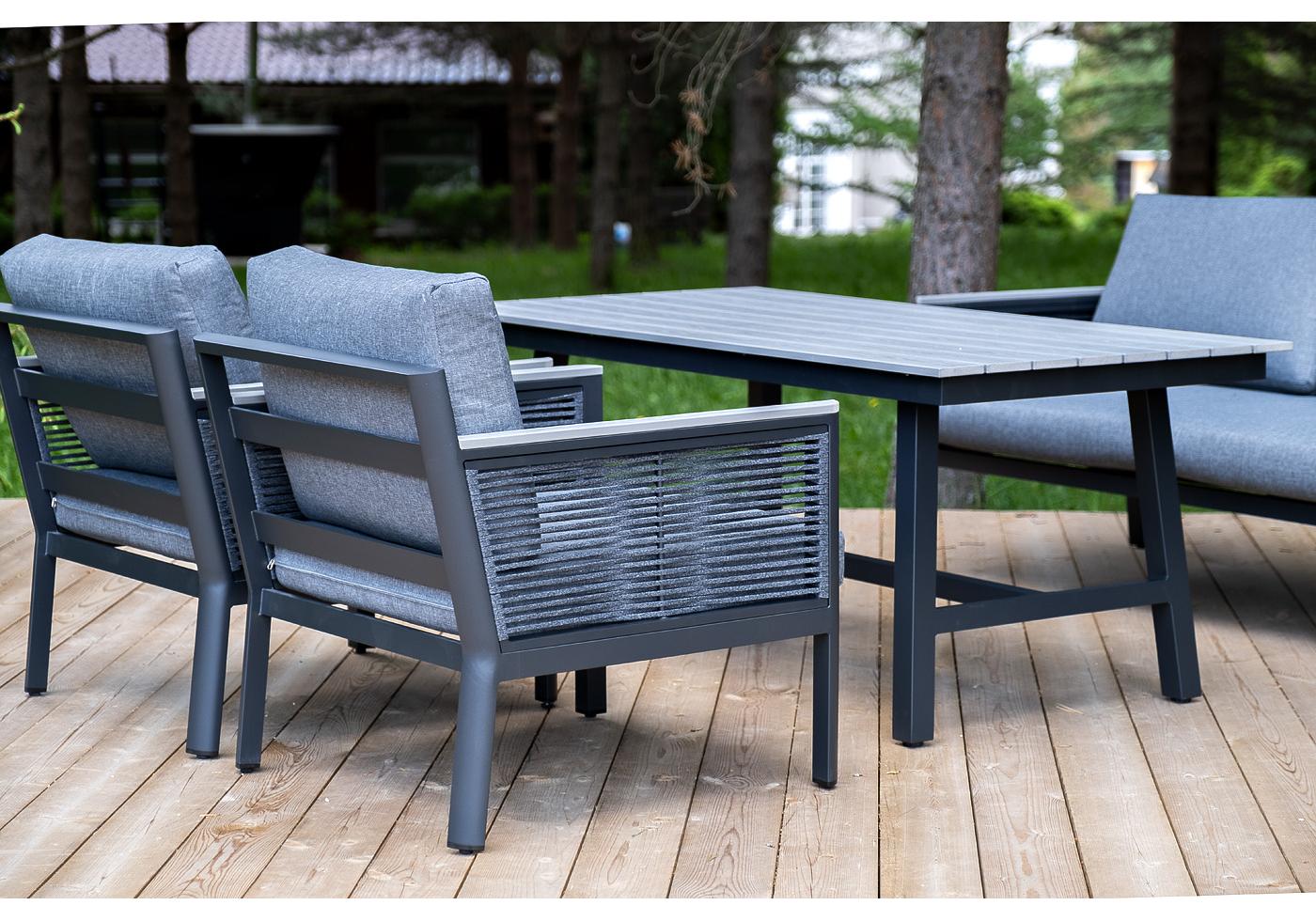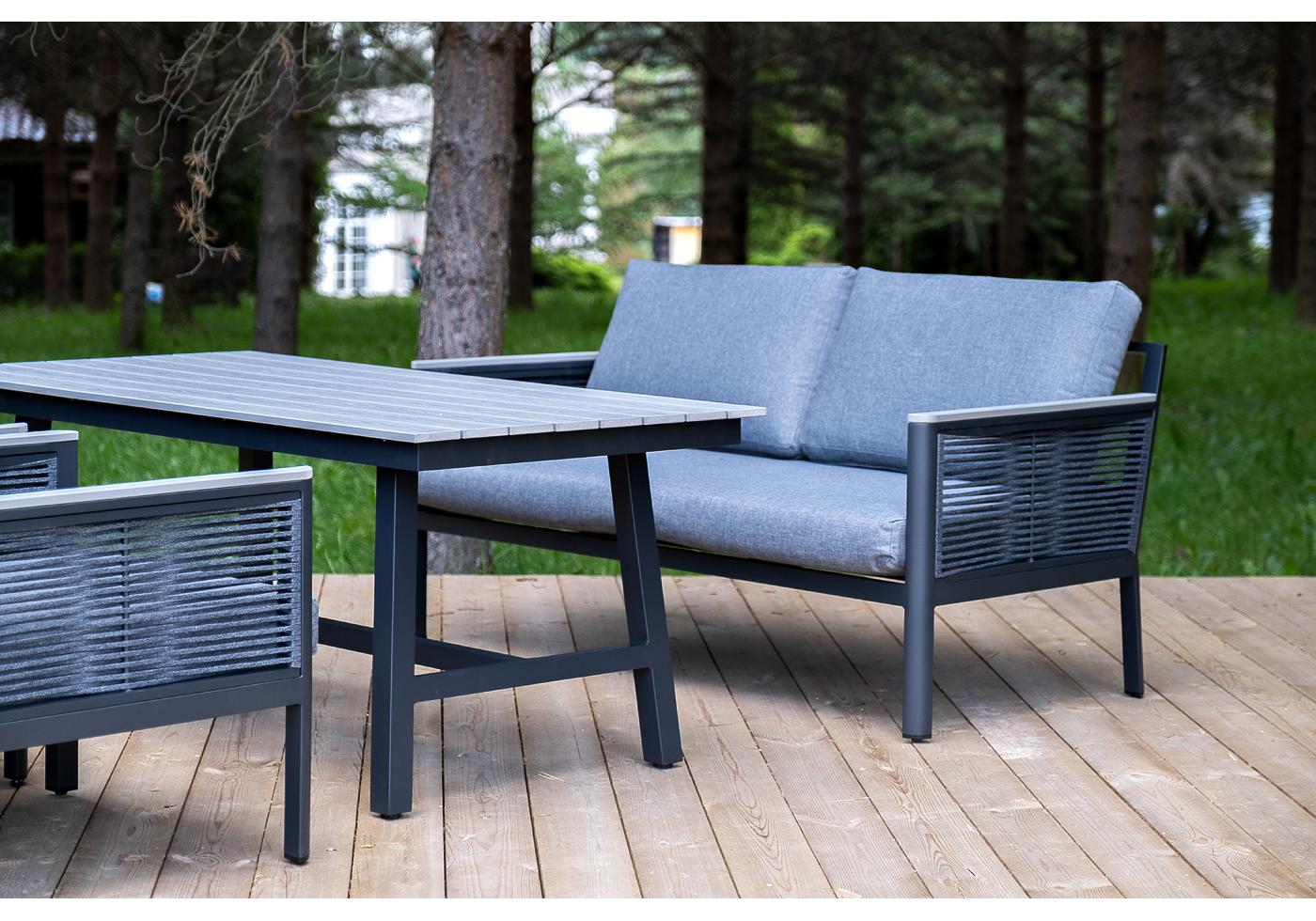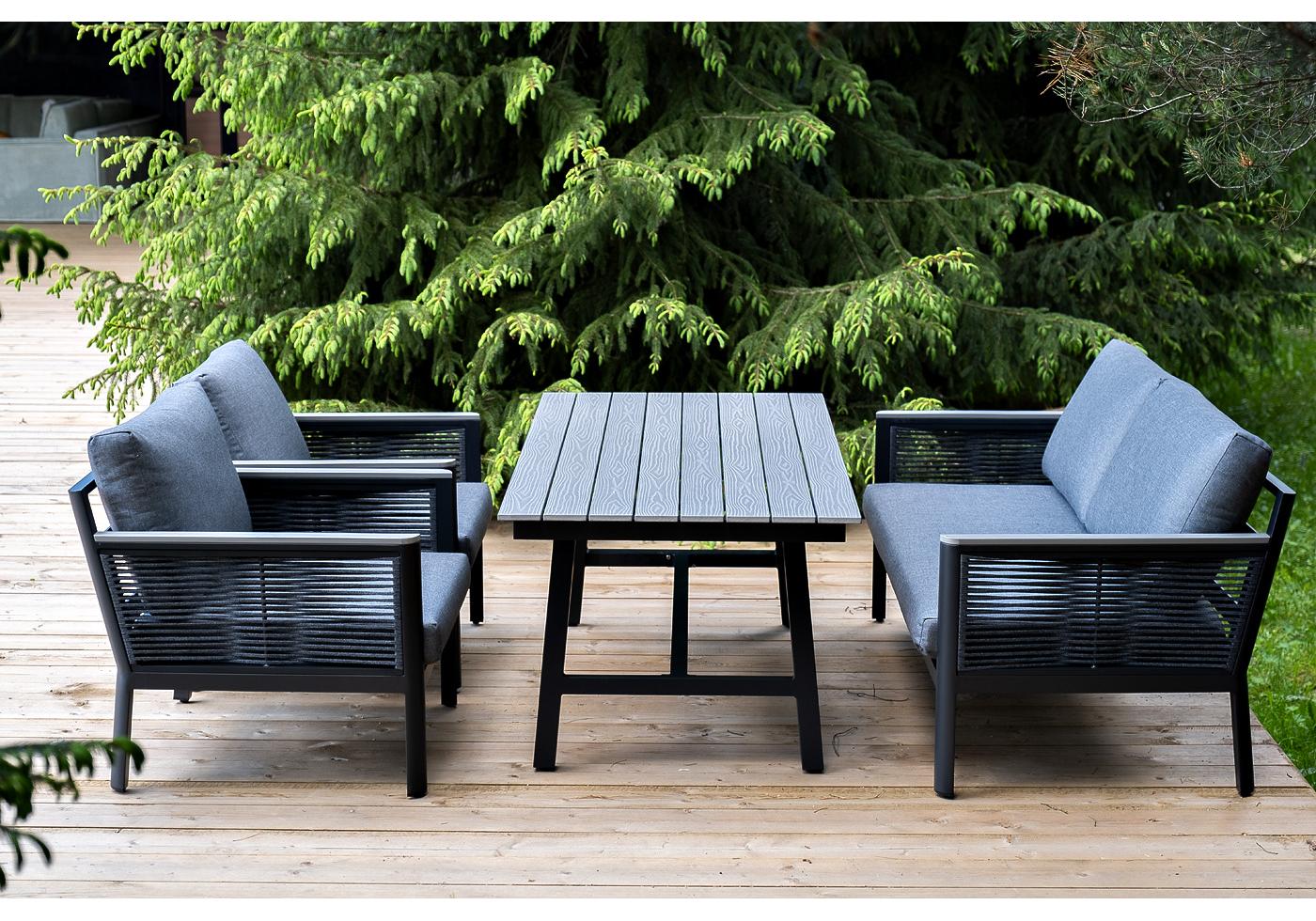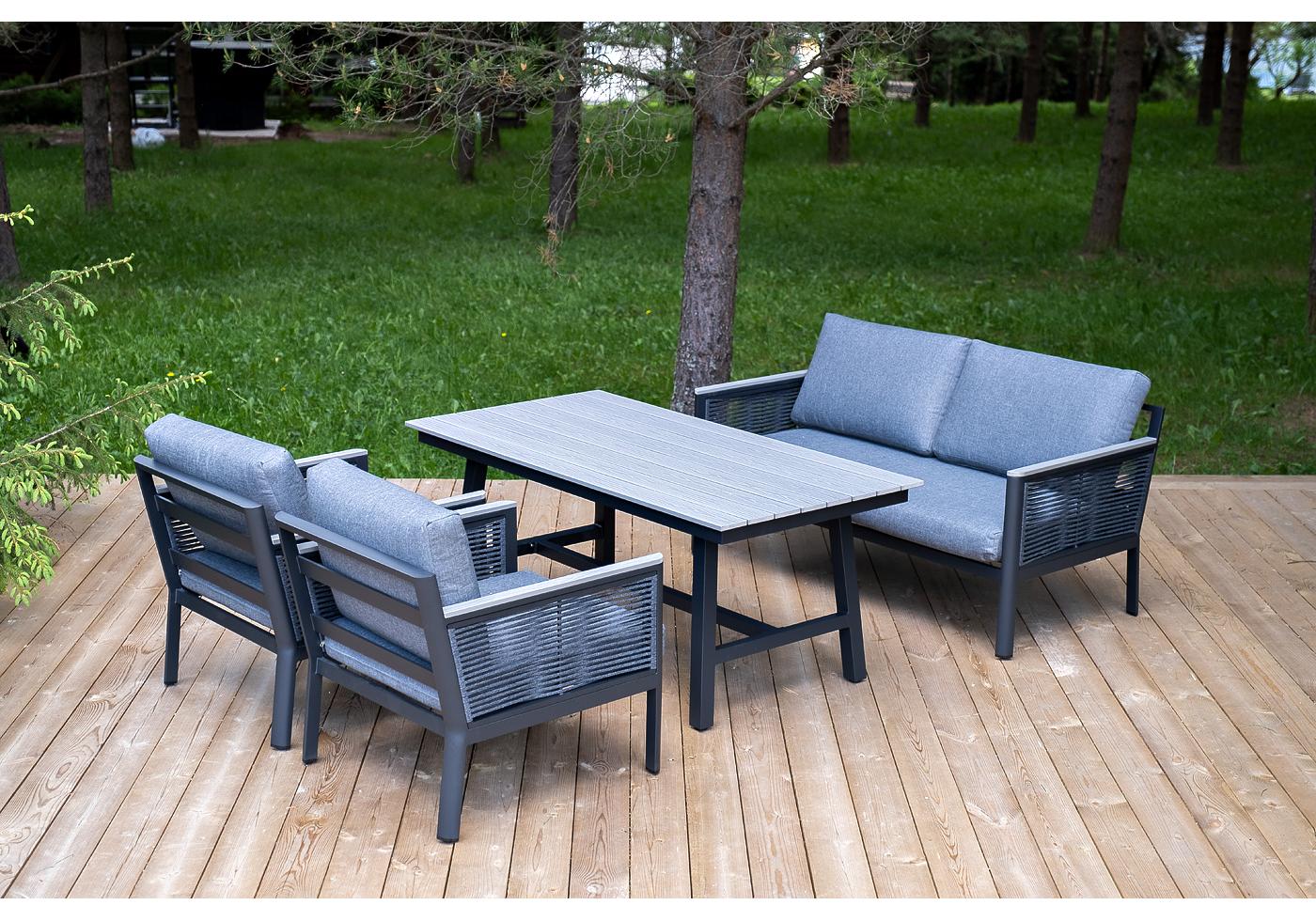 Диван и кресла оснащены подушками серого цвета со съёмными чехлами. Стол со столешницей из ДПК. "Сан Ремо" кресло плетеное из роупа садовое, каркас алюминий темно-серый, роуп серый, ткань серая 2шт. 680Х780Х700, "Сан Ремо" диван 2-местный плетеный из роупа, каркас алюминий темно-серый, роуп серый, ткань серая 1шт. 1 460Х780Х700, "Сан Ремо" стол обеденный из ДПК, каркас алюминиевый темно-серый 1шт. 1 500Х800Х650,