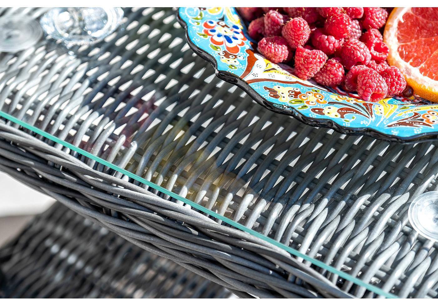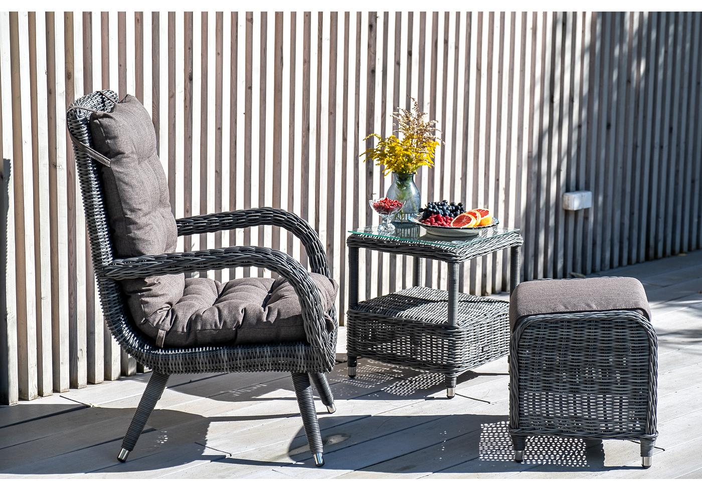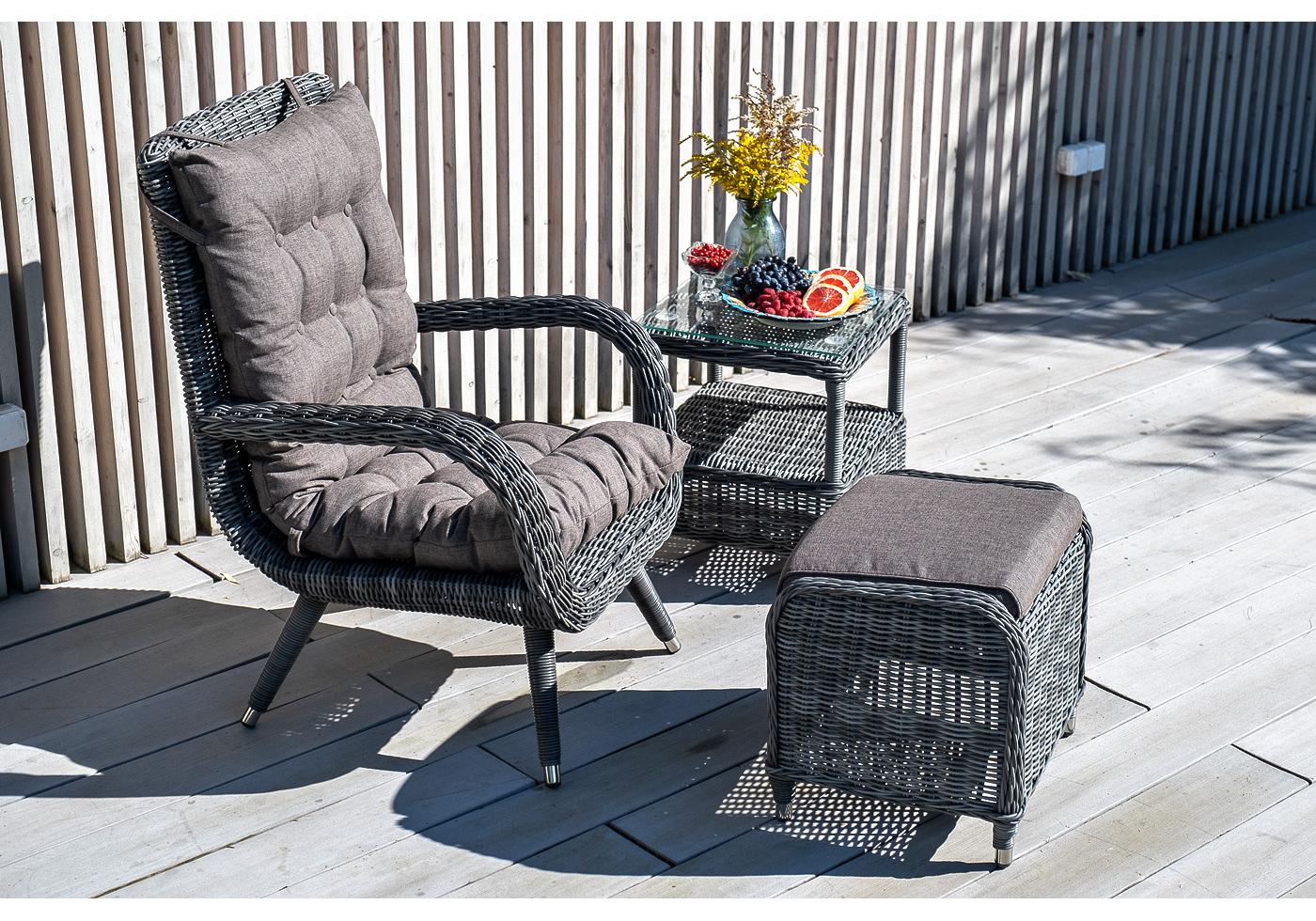 Высота спинки – 690 "Толедо" кресло плетеное с подушками, цвет графит 1шт. 690Х810Х990, "Толедо" пуф плетеный, цвет графит 1шт. 510Х420Х470, "Форио" столик кофейный из искусственного ротанга, цвет графит 1шт. 450Х450Х520,