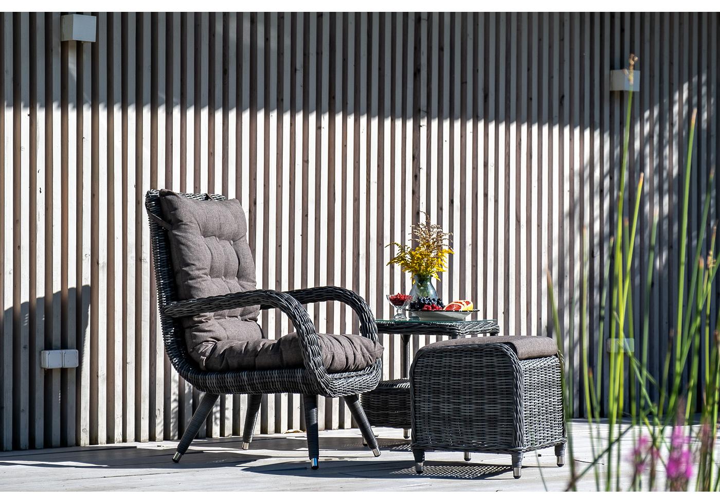 Кресло и пуф укомплектованы подушками со съёмными чехлами из влагостойкого 100%-го полиэстера.