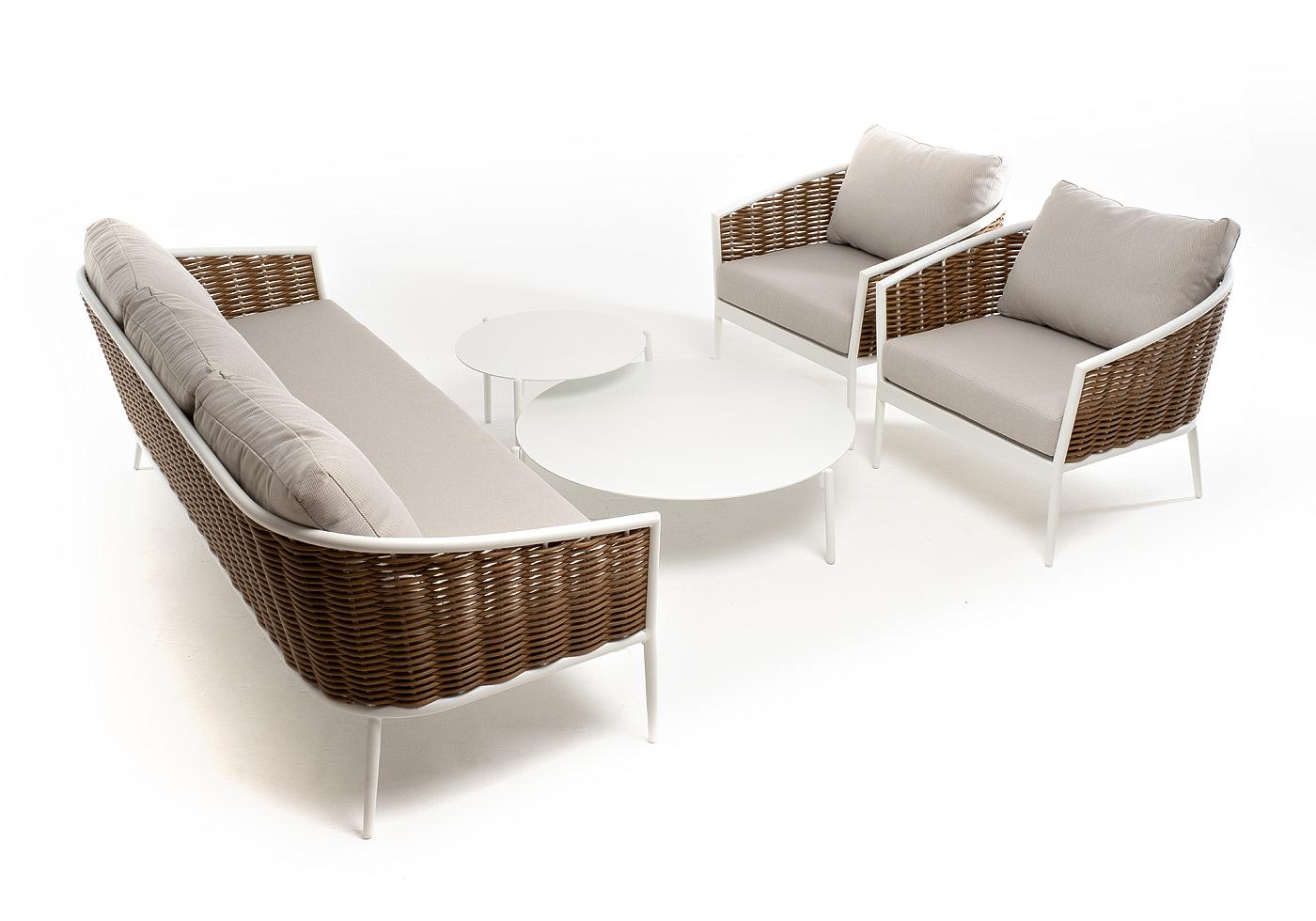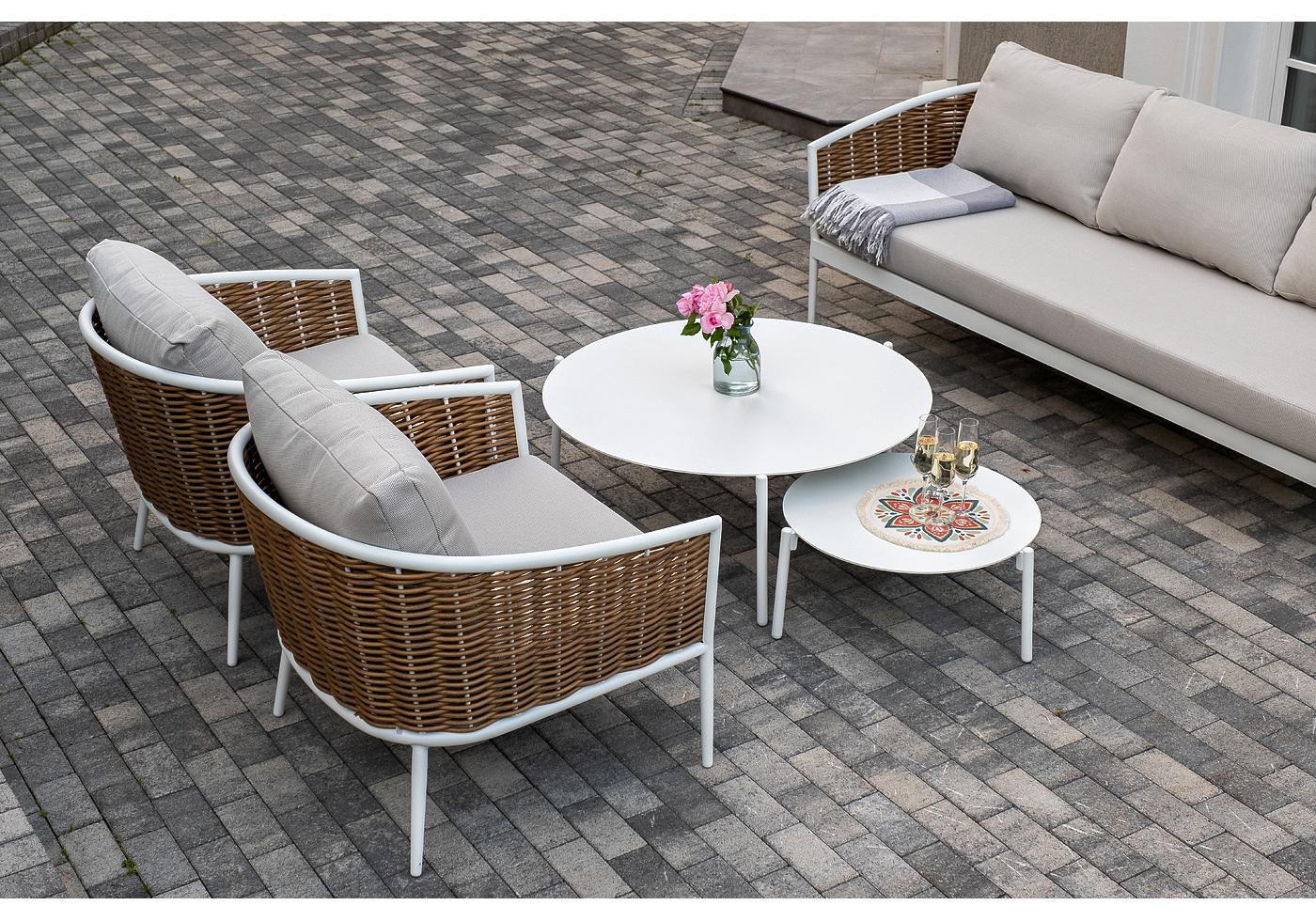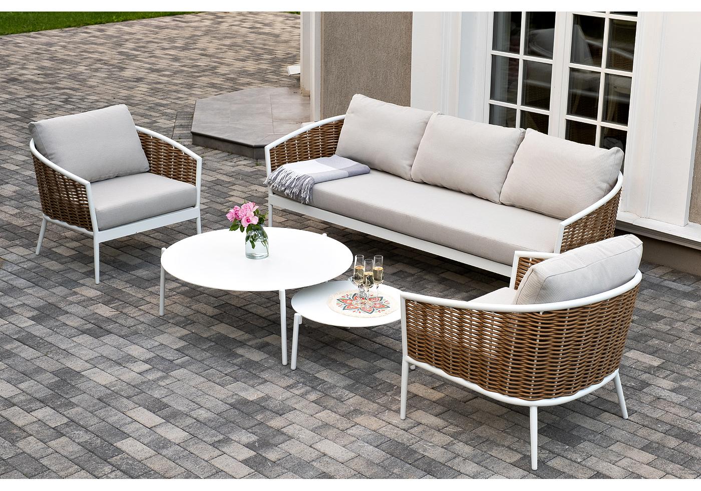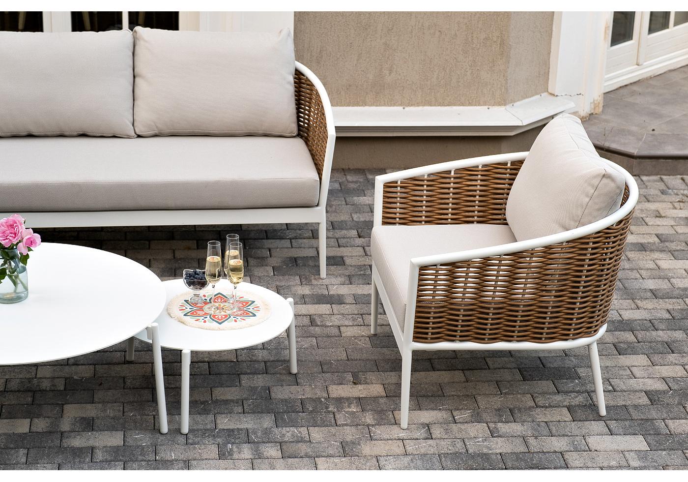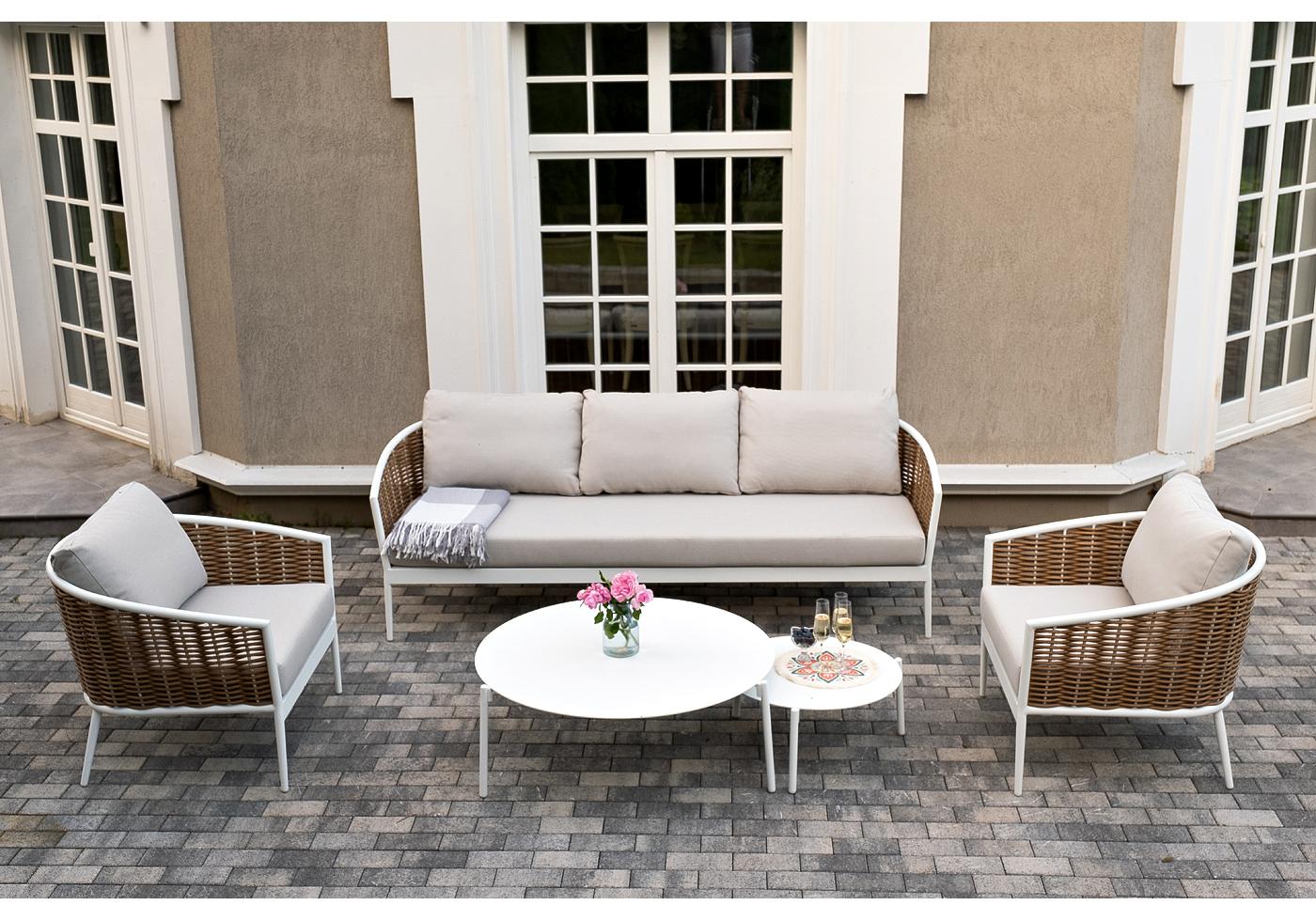 Плетена "Тоскана" диван из искусственного ротанга трехместный, цвет соломенный 1шт. 2 260Х815Х750, "Тоскана" кресло из искусственного ротанга, цвет соломенный 2шт. 815Х870Х750, "Тоскана" журнальный столик круглый Ø103, H28,5, цвет белый 1шт. 1 030Х1 030Х285, "Тоскана" журнальный столик круглый Ø65, H38,5, цвет белый 1шт. 650Х650Х385,