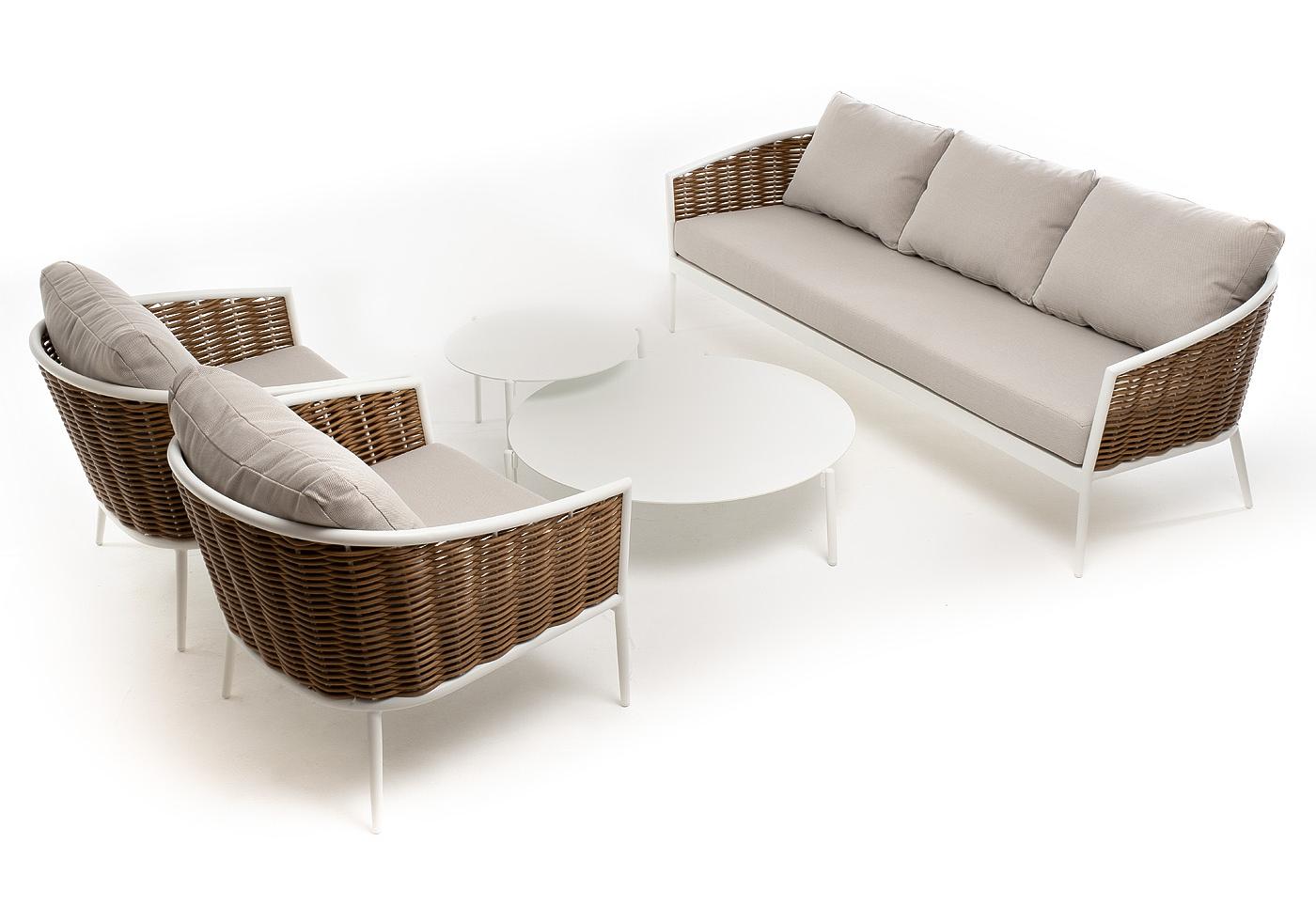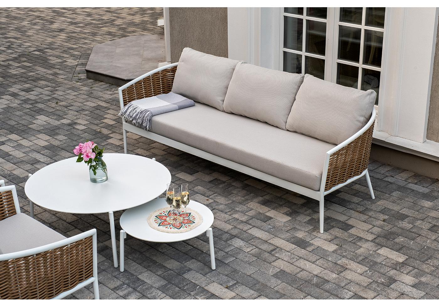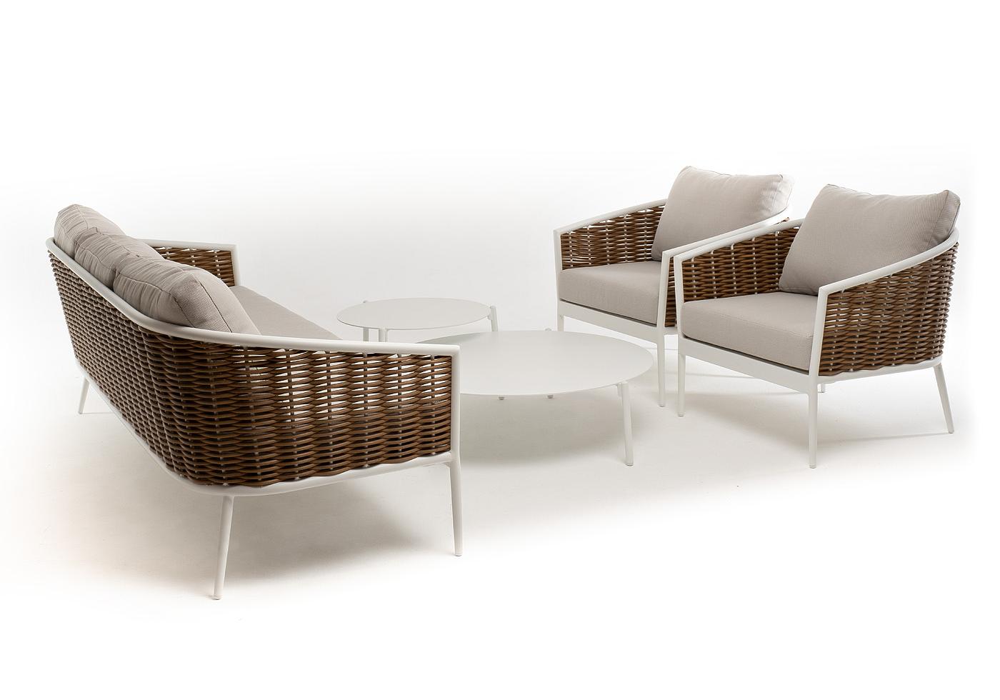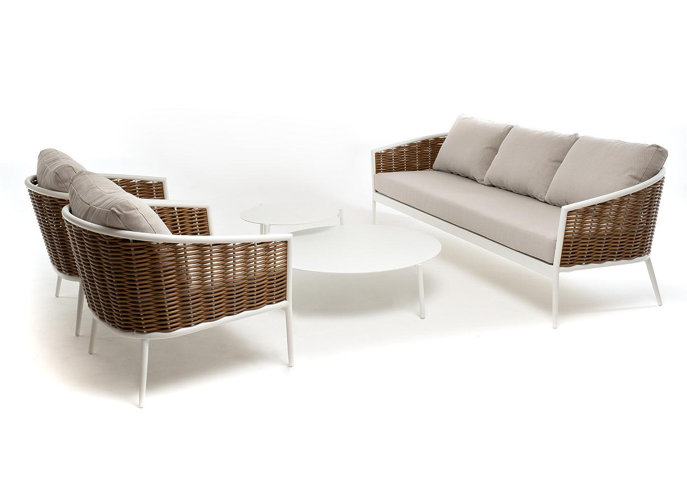 Плетена "Тоскана" диван из искусственного ротанга трехместный, цвет соломенный 1шт. 2 260Х815Х750, "Тоскана" кресло из искусственного ротанга, цвет соломенный 2шт. 815Х870Х750, "Тоскана" журнальный столик круглый Ø103, H28,5, цвет белый 1шт. 1 030Х1 030Х285, "Тоскана" журнальный столик круглый Ø65, H38,5, цвет белый 1шт. 650Х650Х385,