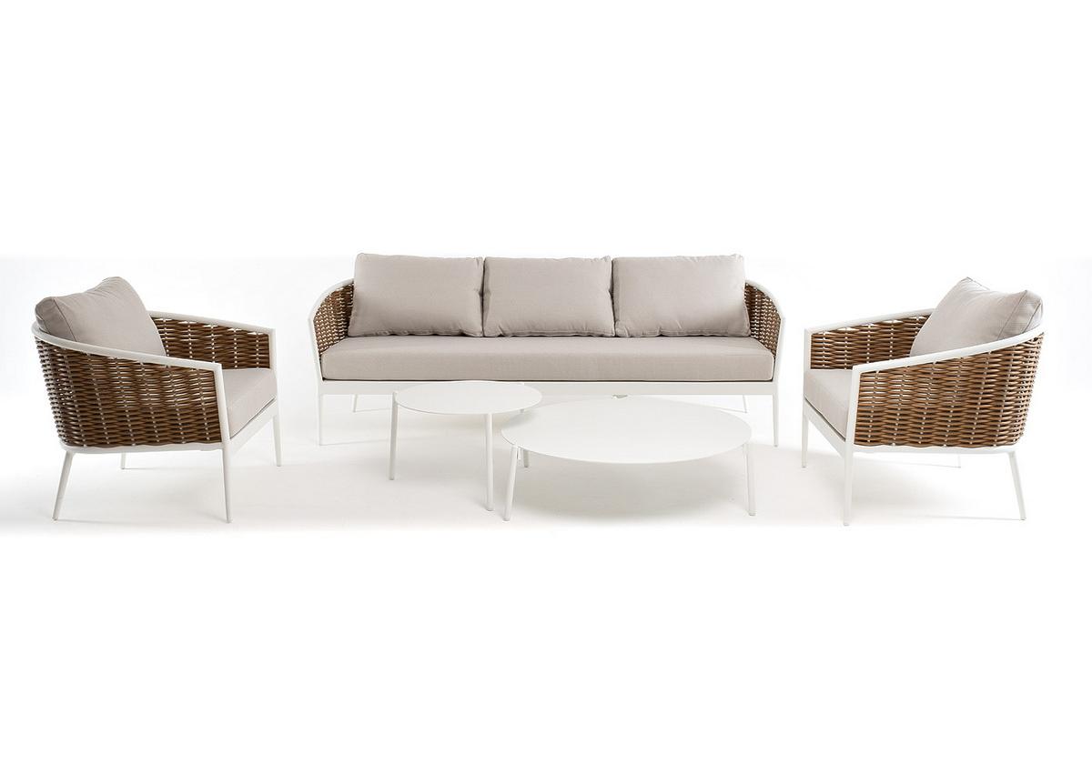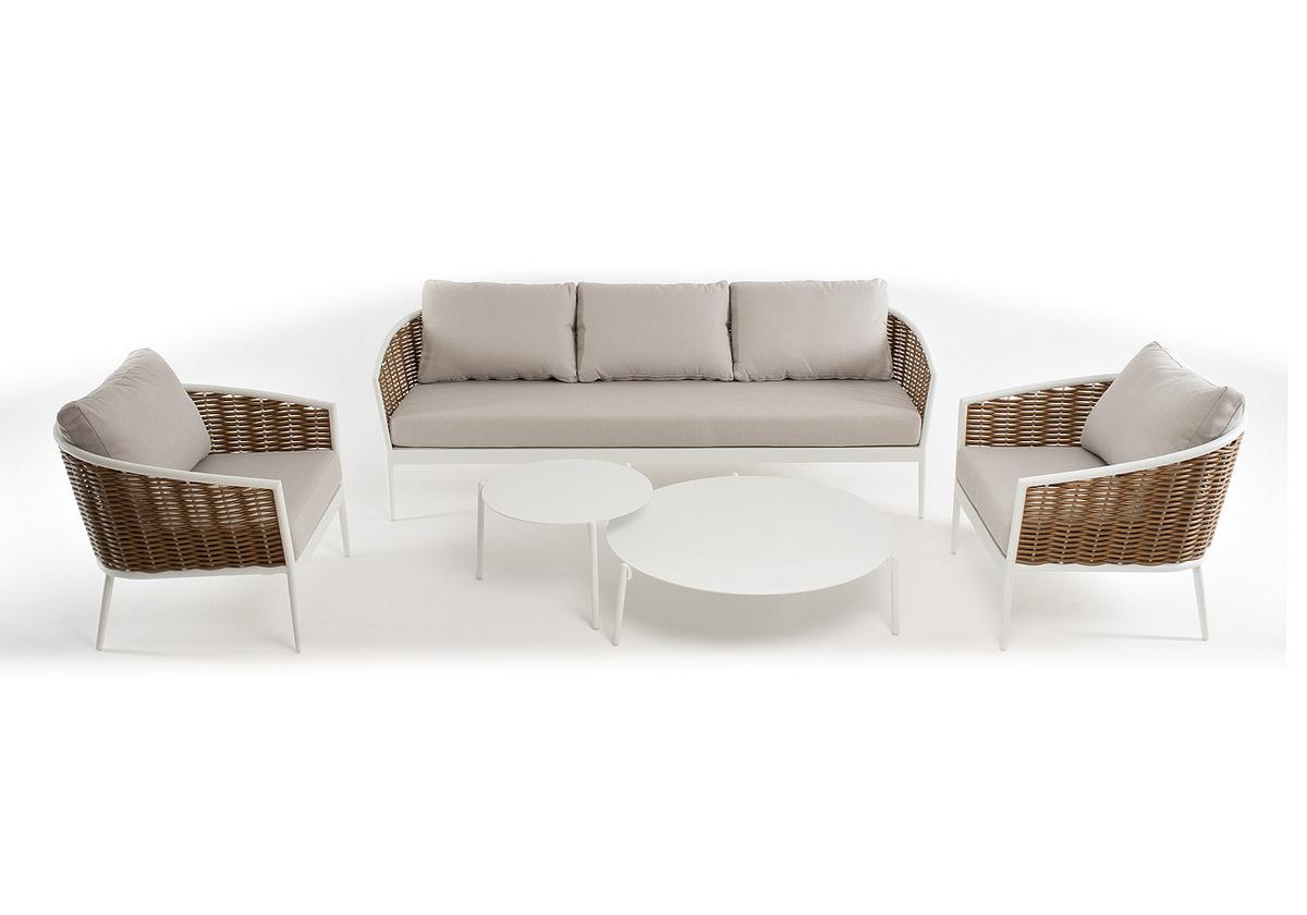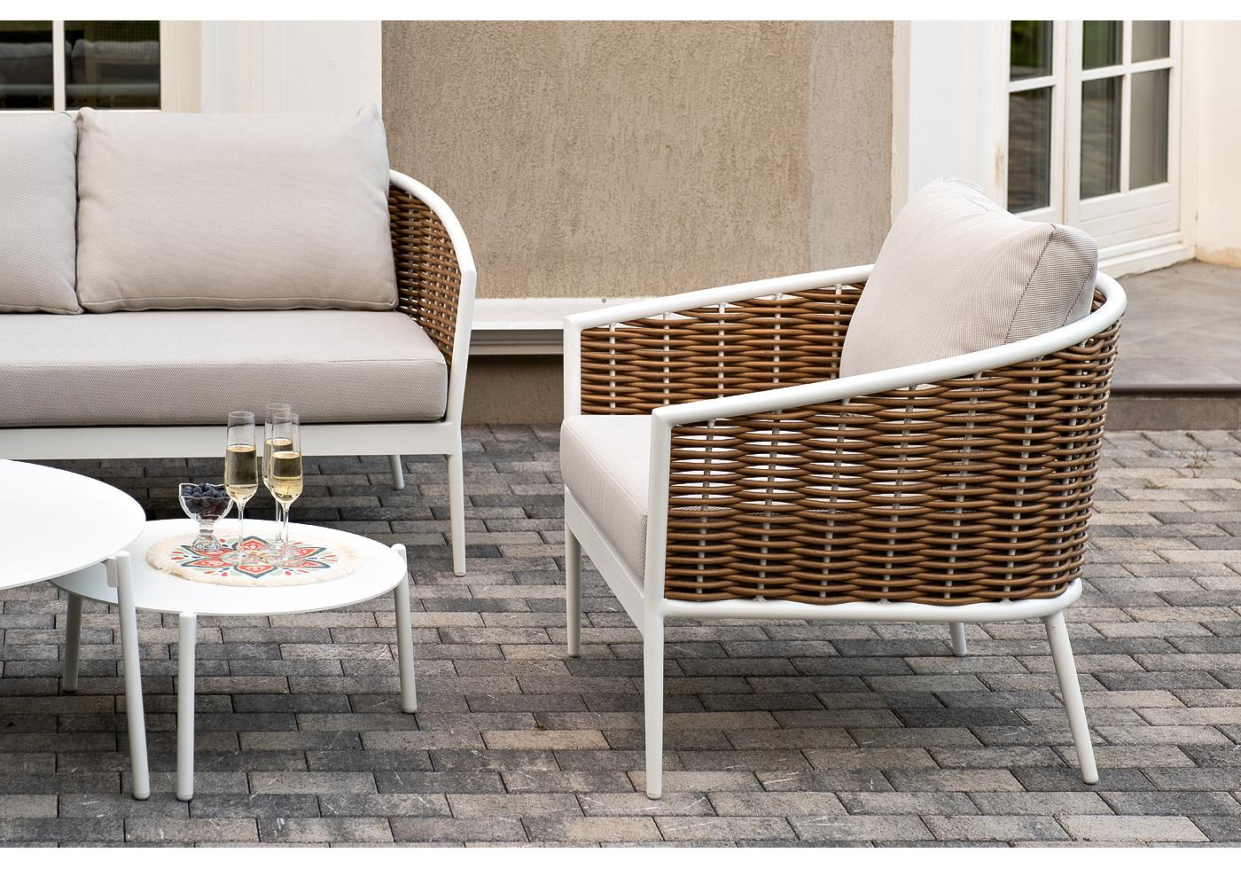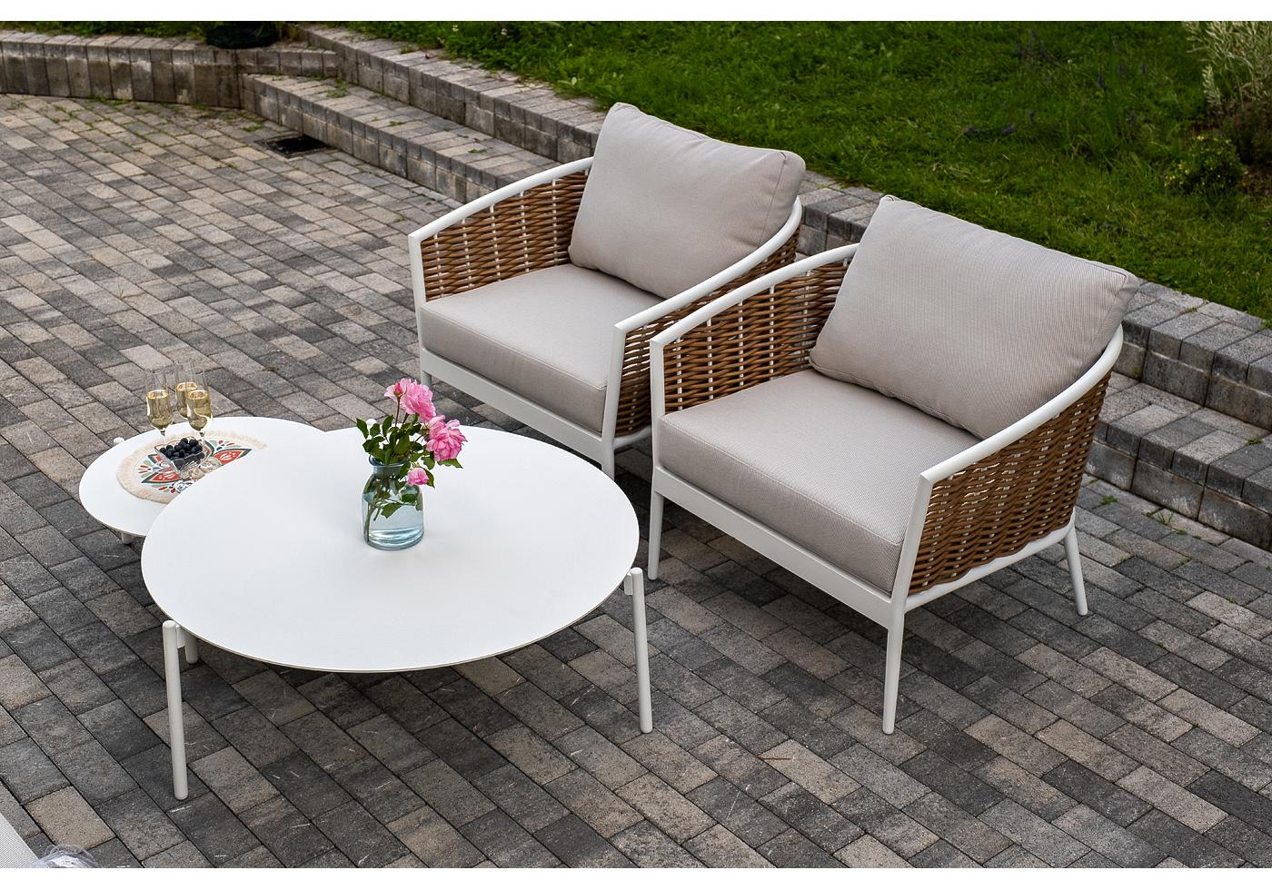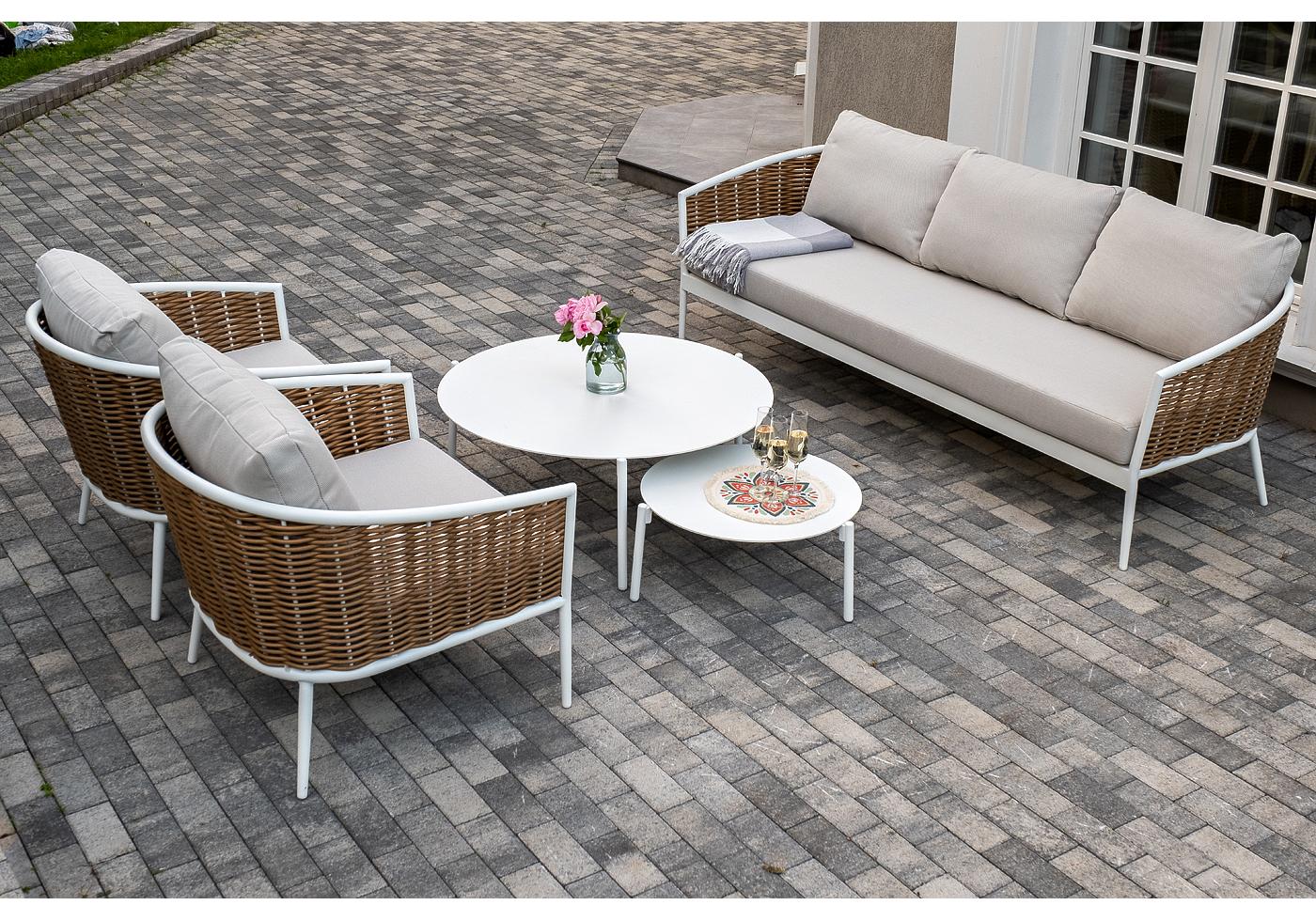 Плетена "Тоскана" диван из искусственного ротанга трехместный, цвет соломенный 1шт. 2 260Х815Х750, "Тоскана" кресло из искусственного ротанга, цвет соломенный 2шт. 815Х870Х750, "Тоскана" журнальный столик круглый Ø103, H28,5, цвет белый 1шт. 1 030Х1 030Х285, "Тоскана" журнальный столик круглый Ø65, H38,5, цвет белый 1шт. 650Х650Х385,