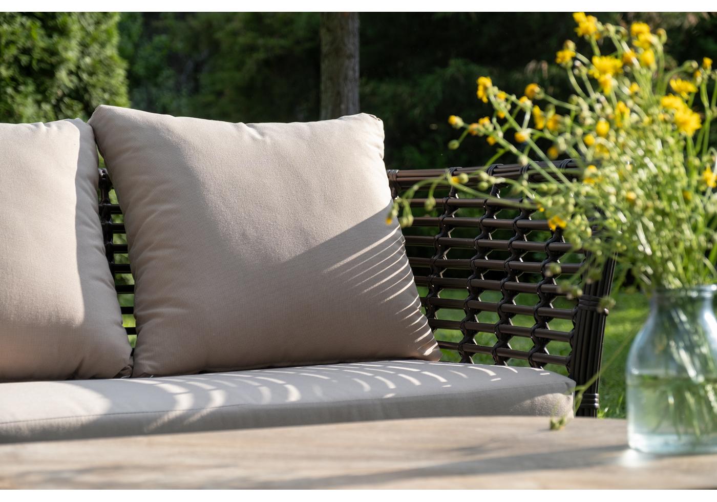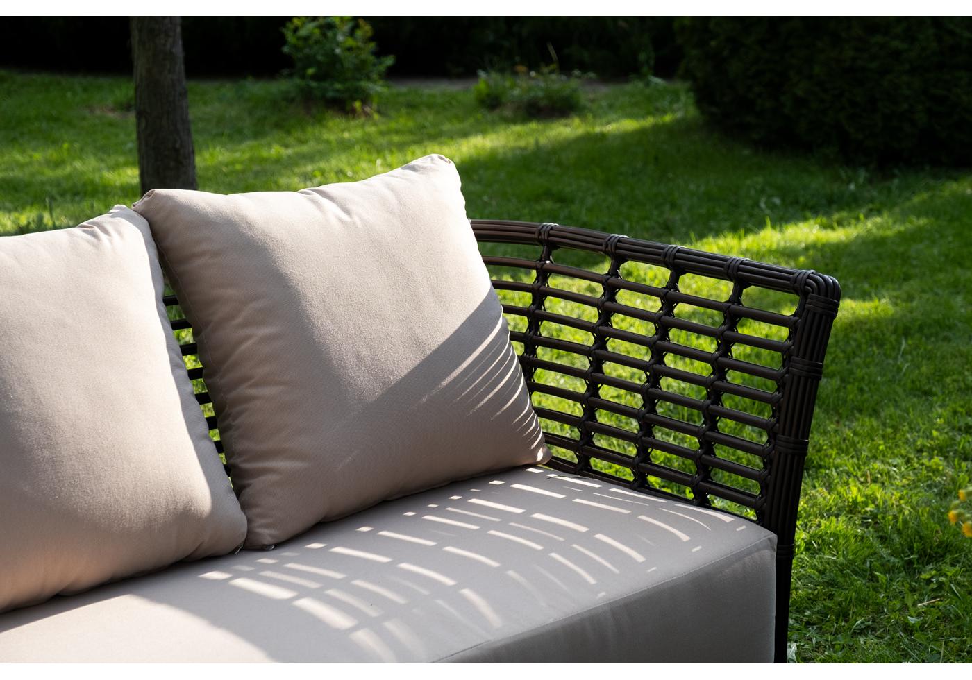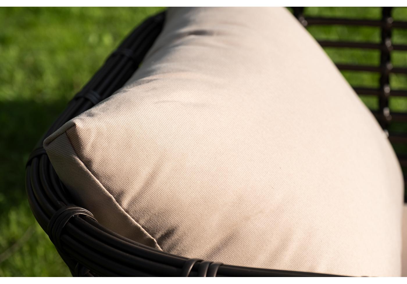 Плетеная мебель дополнена удобными подушками в бежевых чехлах. При их изготовлении используют полиэстер, плотность – 300гр/м2. Он обрабатывается влагоотталкивающей пропиткой для повышения защитных свойств материала.